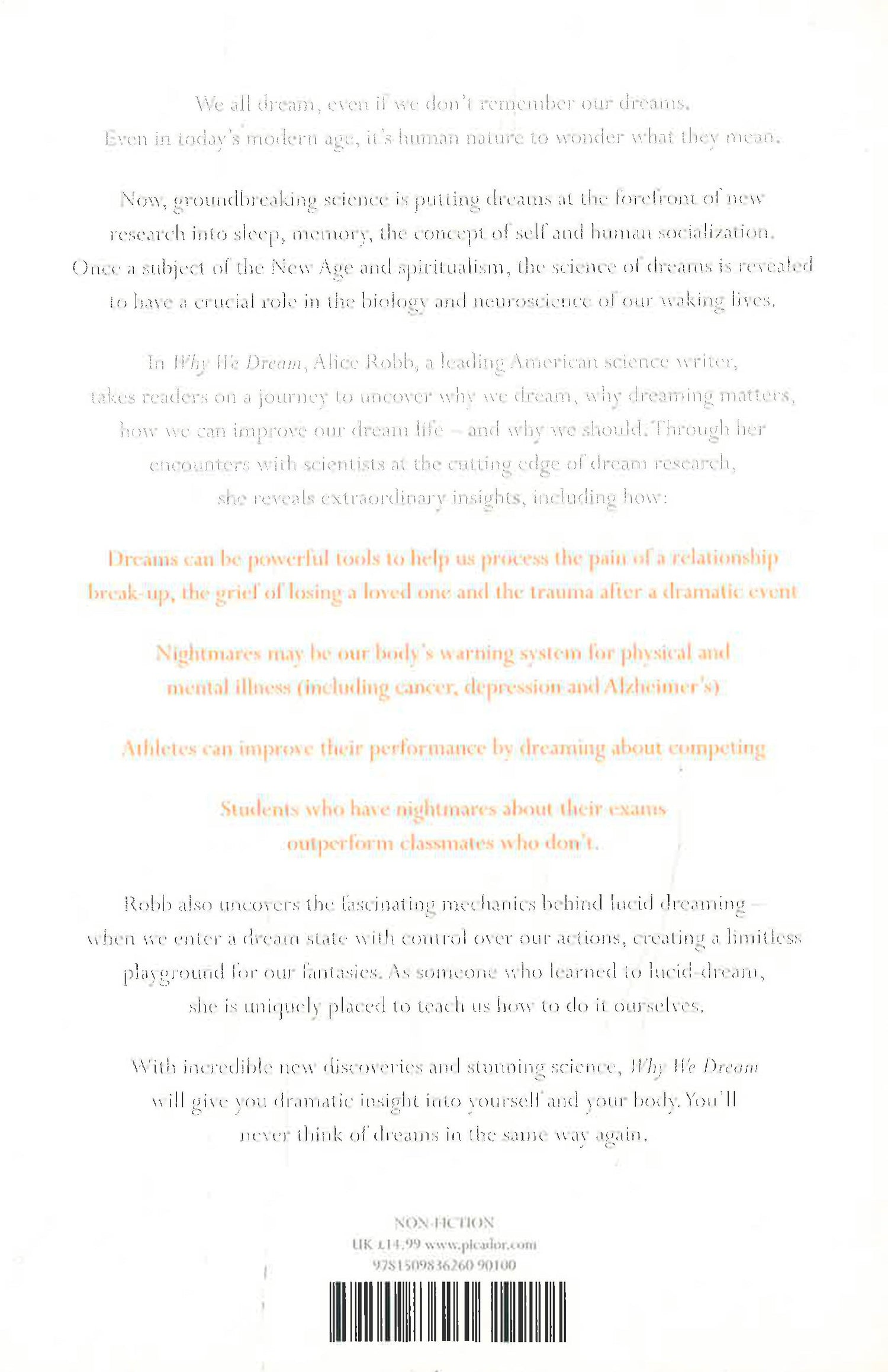 In Why We Dream, Alice Robb, a leading American science journalist, will take readers on a journey to uncover why we dream, why dreaming matters, and how we can improve our dream life – and why we should. Through her encounters with scientists at the cutting edge of dream research, she reveals how: