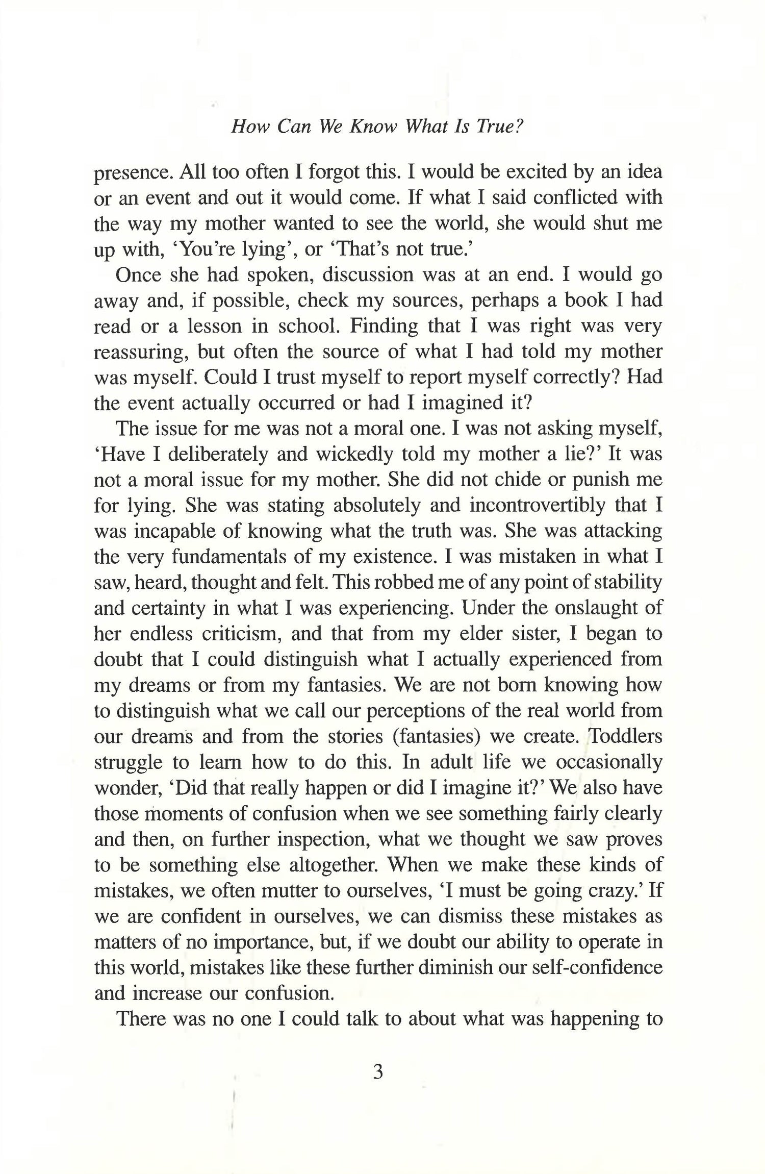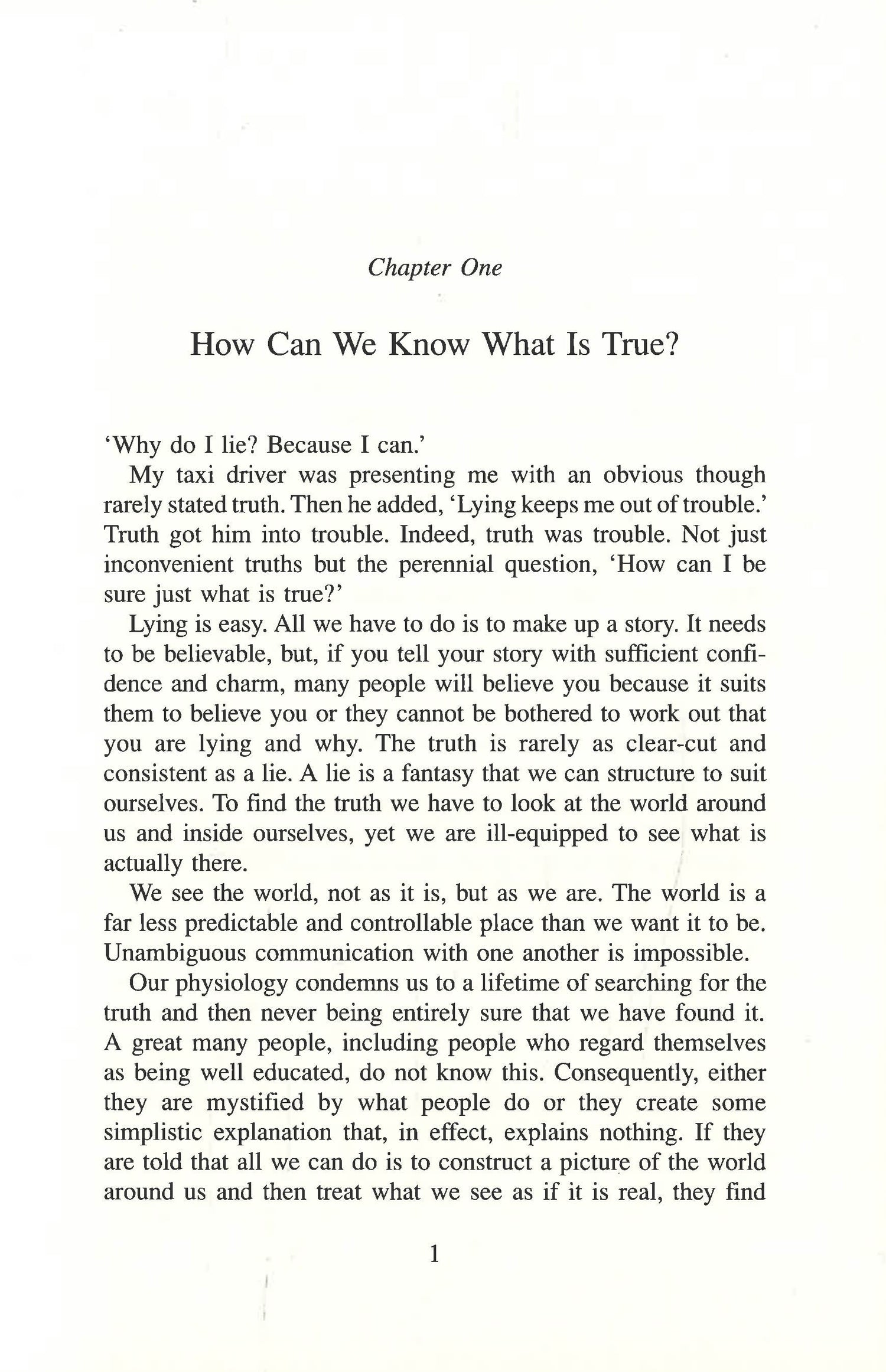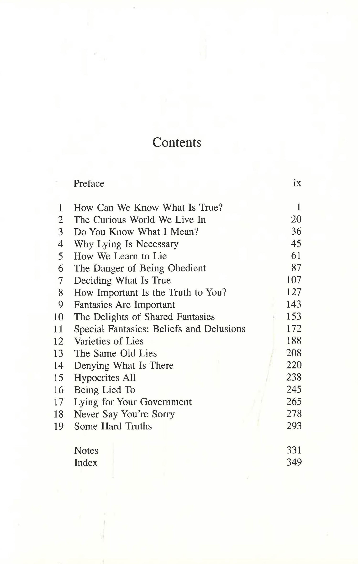Because we are frightened of being humiliated, being treated like an object, being rejected, losing control of things, and, most of all, we are frightened of uncertainty. Often we get our lies in before any of these things can happen. We lie to maintain our vanity. We lie when we call our fantasies the truth. Lying is much easier than searching for the truth and accepting it, no matter how inconvenient it is. We lie to others, and, even worse, we lie to ourselves.
