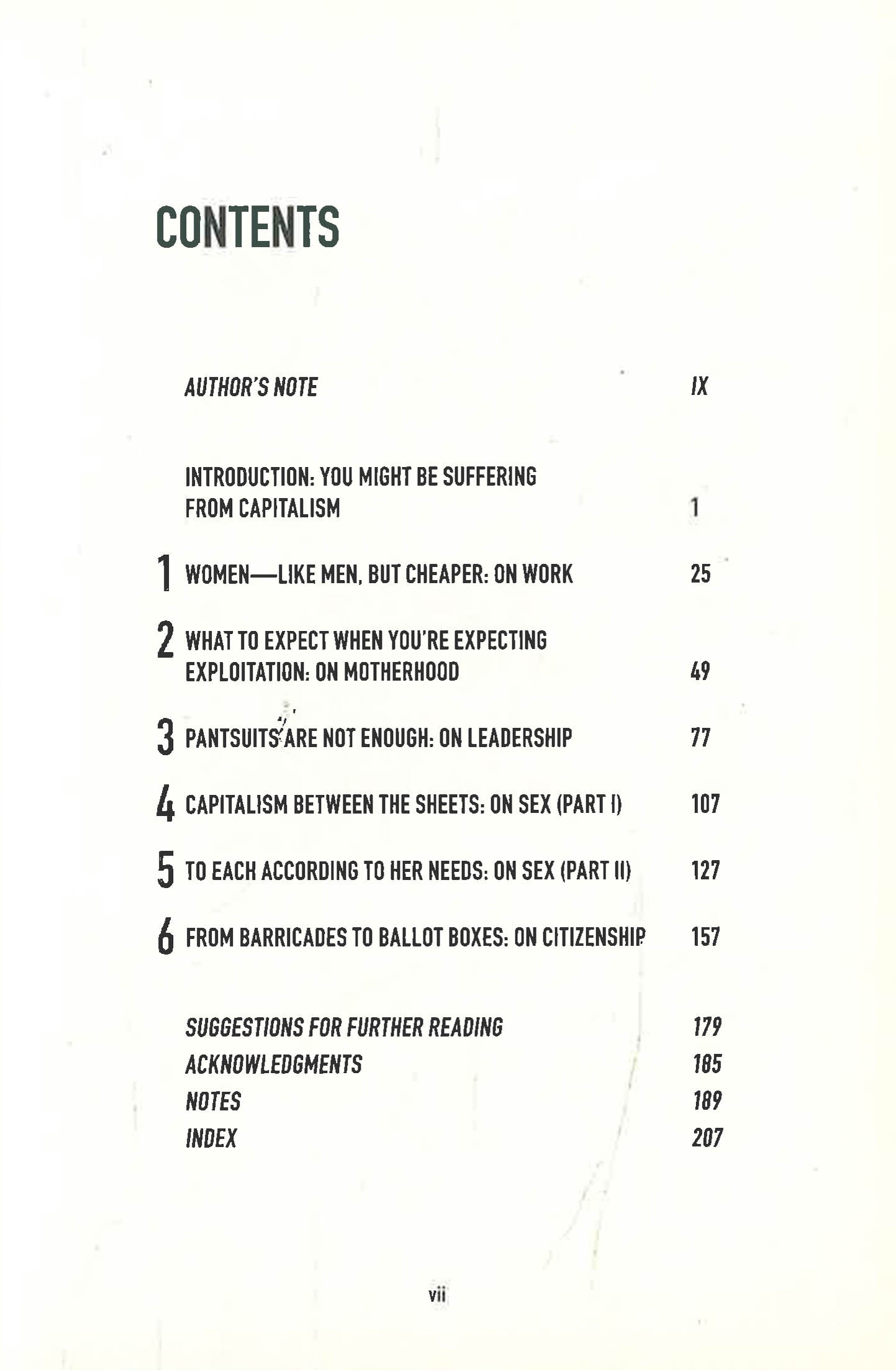 She tackles all aspects of a woman's life - work, parenting, sex and relationships, citizenship, and leadership. In a chapter called "Women: Like Men, But Cheaper," she talks about women in the workplace, discussing everything from the wage gap to harassment and discrimination. In "What To Expect When You're Expecting Exploitation," she addresses motherhood and how "having it all" is impossible under capitalism.