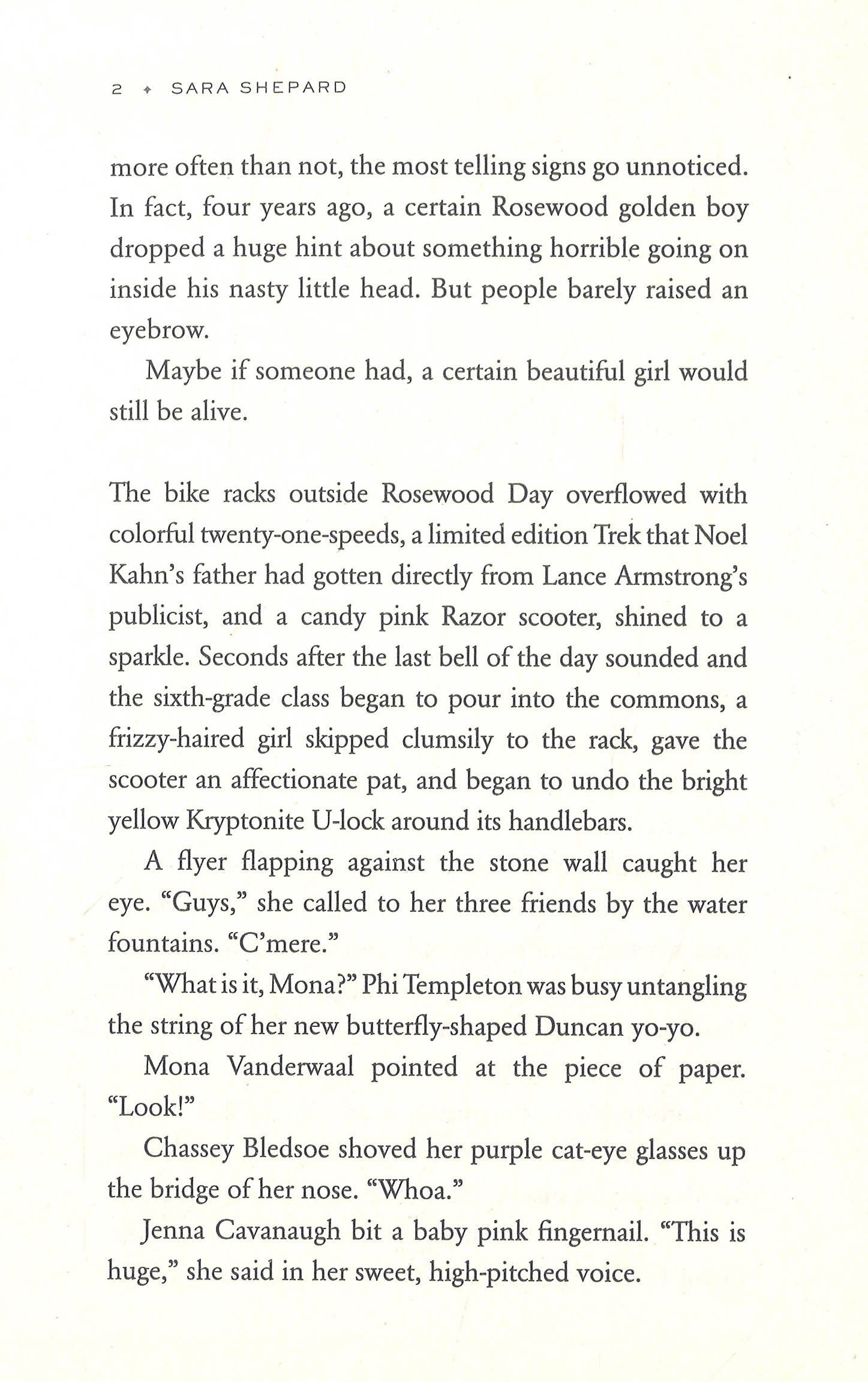 In idyllic Rosewood, Pennsylvania, where Burberry earmuffs keep diamond-studded ears warm, four very pretty girls have done some very wicked things. . . . High school juniors Hanna, Spencer, Emily, and Aria have paid dearly for their sins. A stalker named "A" terrorized them for months and revealed their darkest secrets. But now that A's true identity has been revealed, the girls can finally go back to their pretty little lives. Only, once a pretty little liar, always a pretty little liar - and these girls just can't help but be bad. Hanna will do anything to be Rosewood's queen bee. Spencer starts stealing . . . from her parents. Emily can't stop thinking about her new boyfriend. And Aria approves a little too strongly of her mom's taste in men. As the secrets get darker and the scandals juicier, the consequences turn deadly. After all, girls who forget the past are condemned to repeat it. And in Rosewood, someone is always watching. . . .