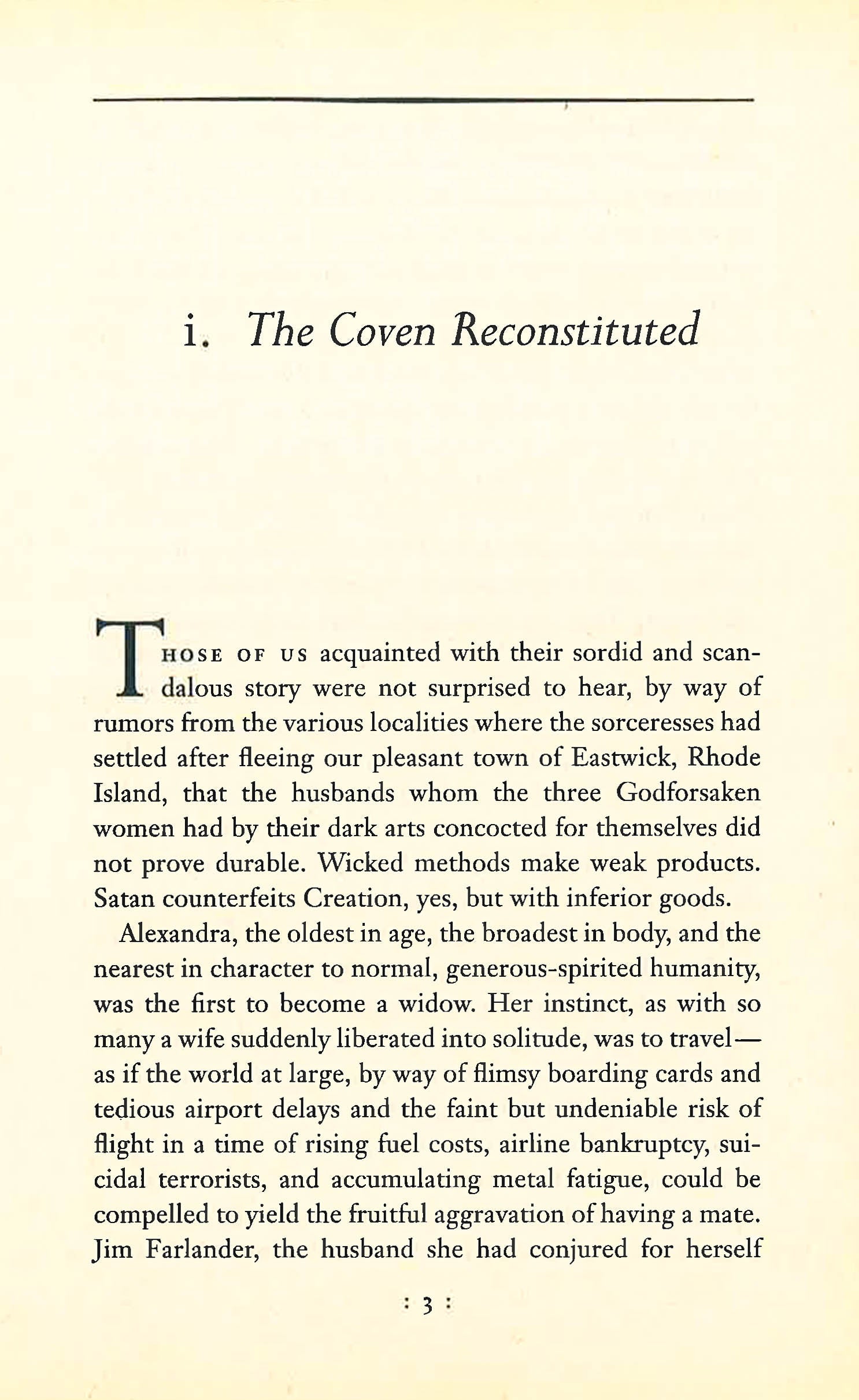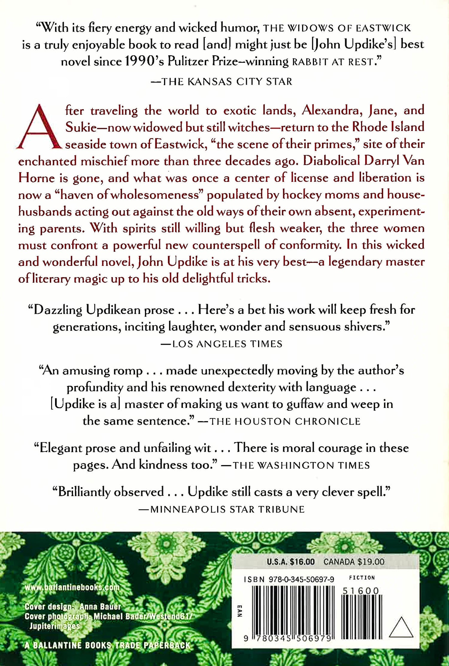 More than three decades after the events described in The Witches of Eastwick, Alexandra, Jane, and Sukie--widowed, aging, and with their occult powers fading--return for the summer to the Rhode Island town where they once made piquant scandal and sometimes deadly mischief. But what was then a center of license and liberation is now a "haven of wholesomeness" populated by hockey moms and househusbands primly rebelling against their absent, reckless, self-involved parents. With spirits still free but energy waning, the three women reconstitute their coven to confront not only this youthful counterspell of propriety but also the enmity of those longtime townsfolk who, through their youthful witchery, they irreparably harmed. In this wise and wicked satire on the way we make peace with our pasts, John Updike proves himself a wizard on every page.