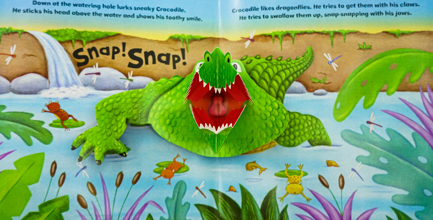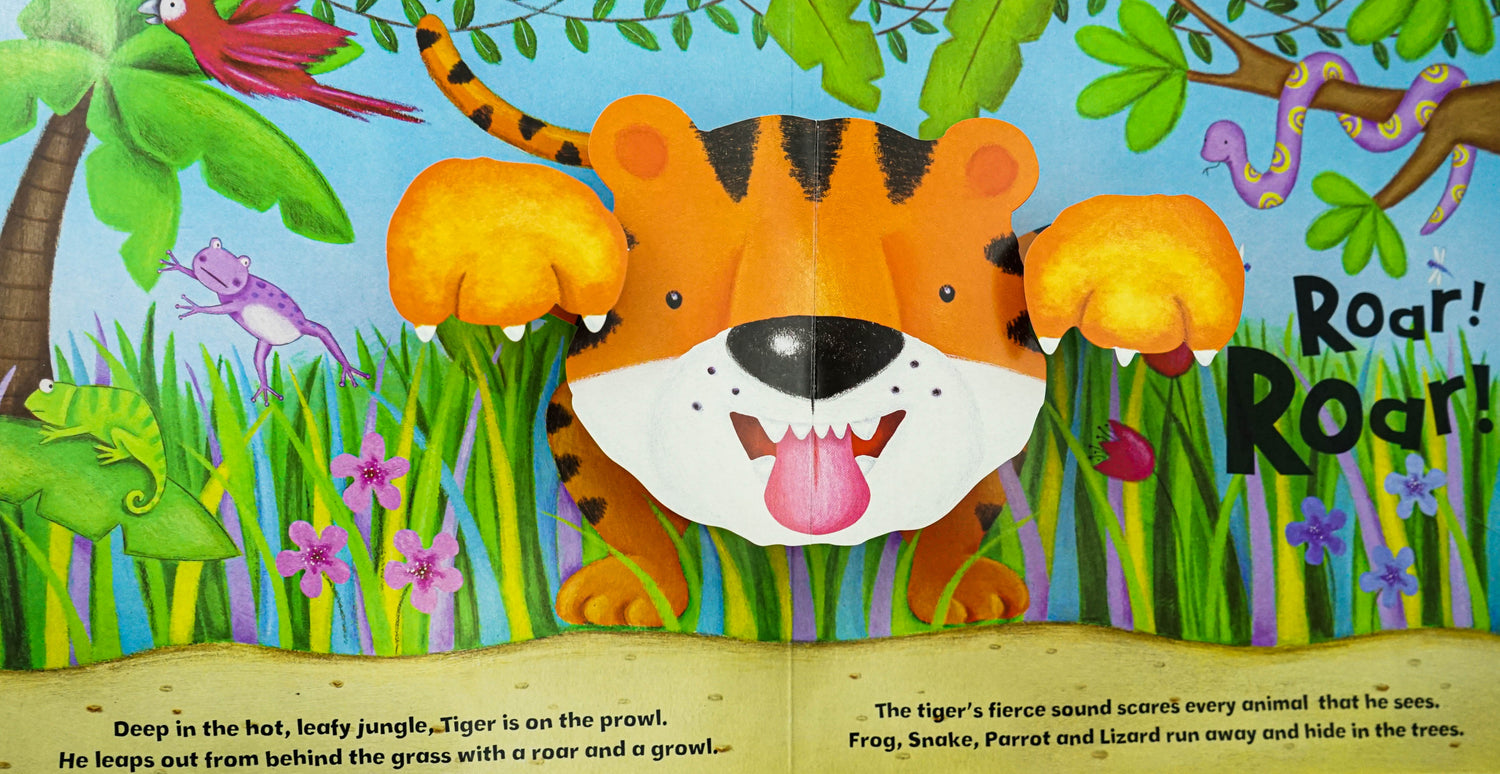 Explore a tropical jungle and discover lots of friendly animals in this exciting pop-up book. Find out who is lurking in the watering hole, see how the monkey gets around the jungle and watch as tiger growls and roars.