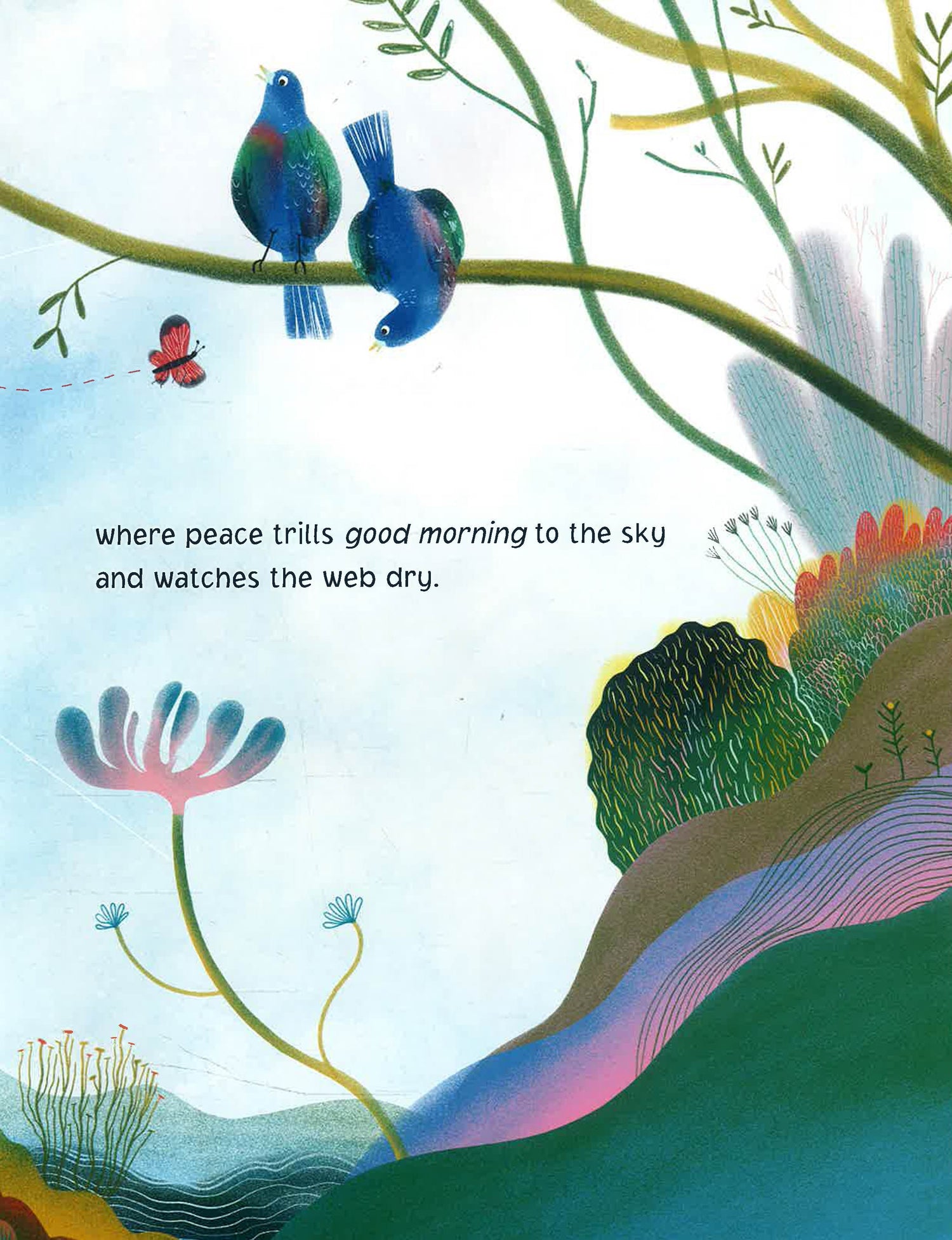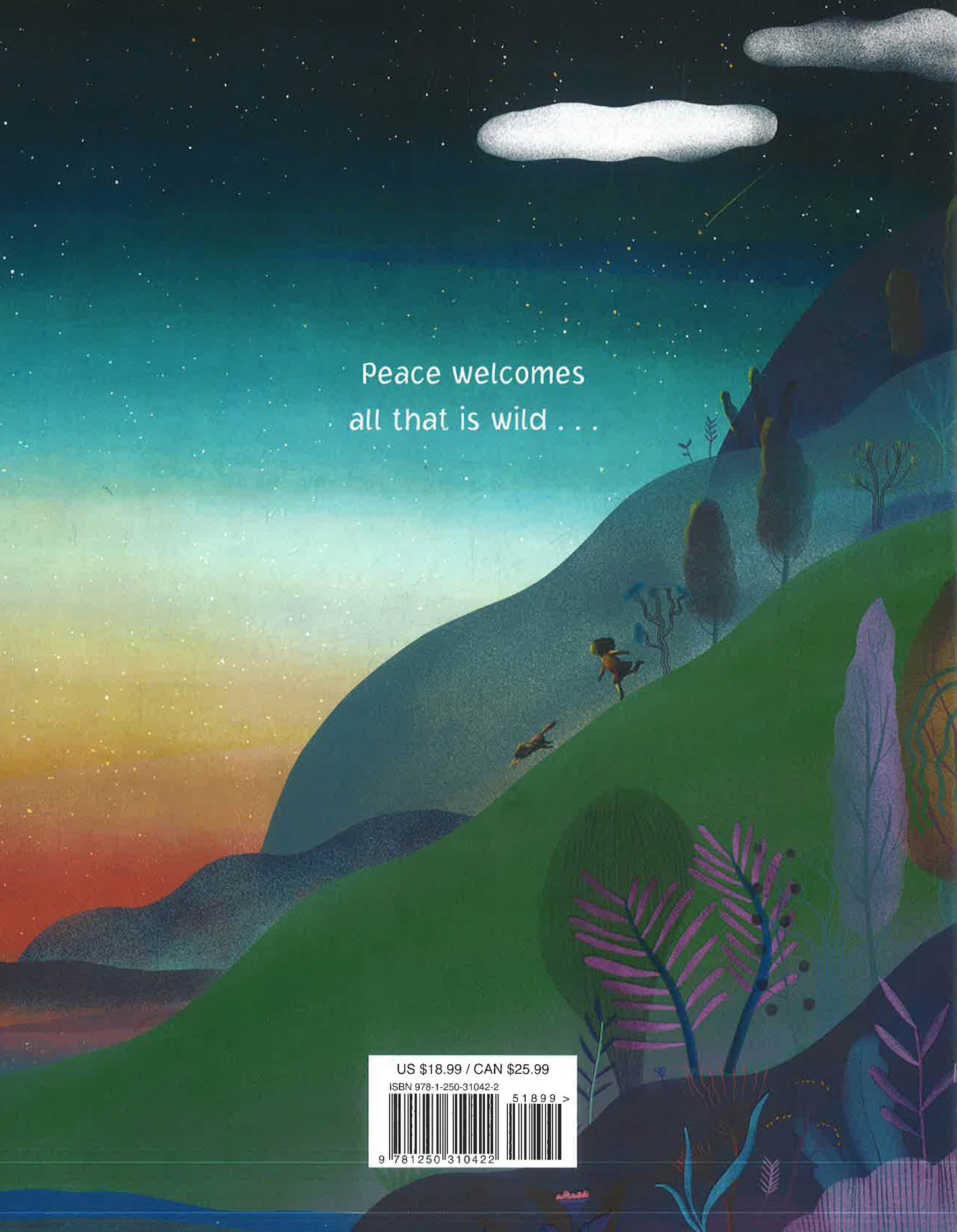With lyrical text and whimsical art, Wild Peace follows a girl whose imagination helps her escape her frenzied home and discover the joys of nature. After enjoying the serenity of the forest, she is finally ready to return to her family, where peace welcomes all that is wild, and kisses the forehead of every child.