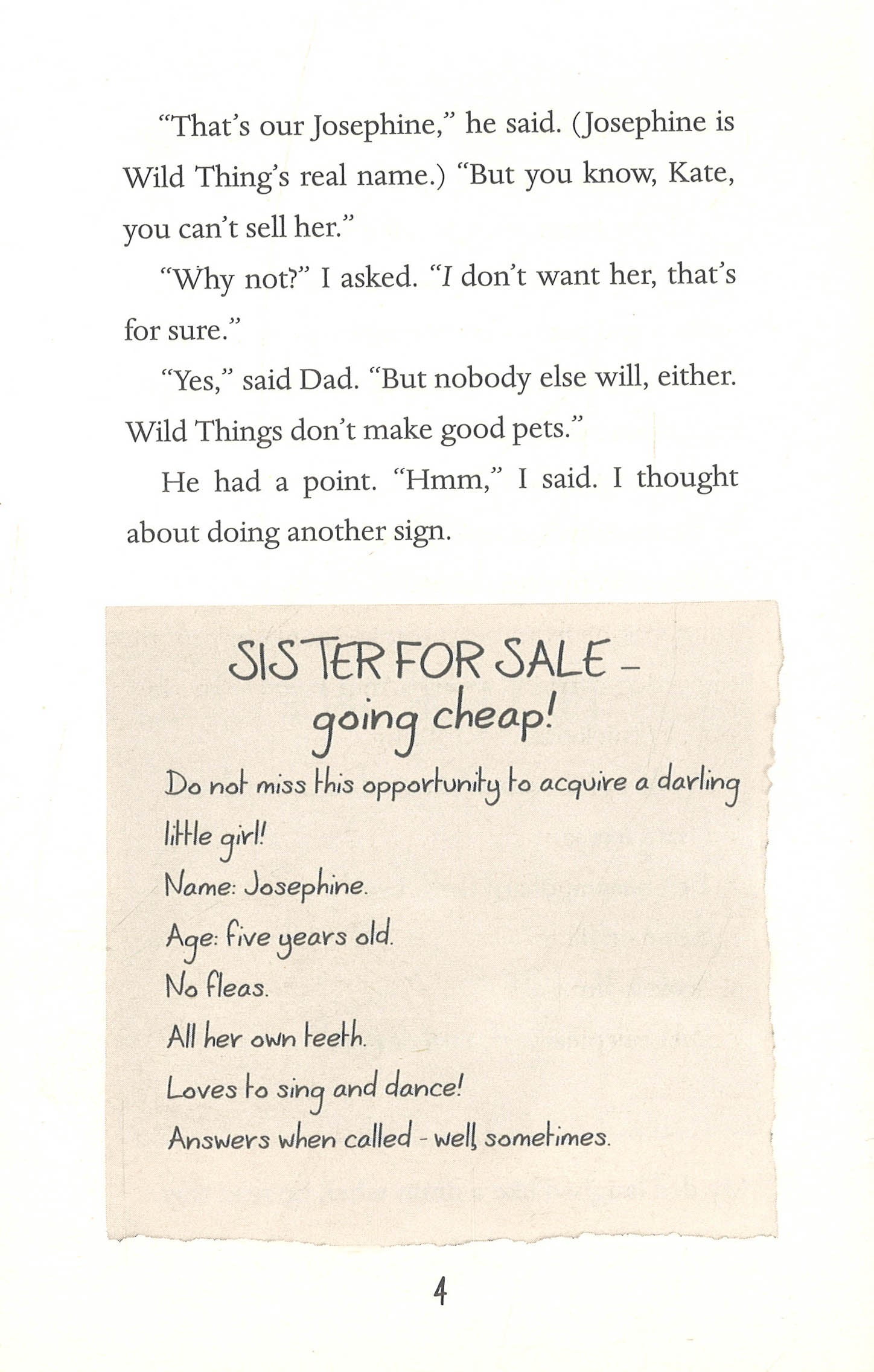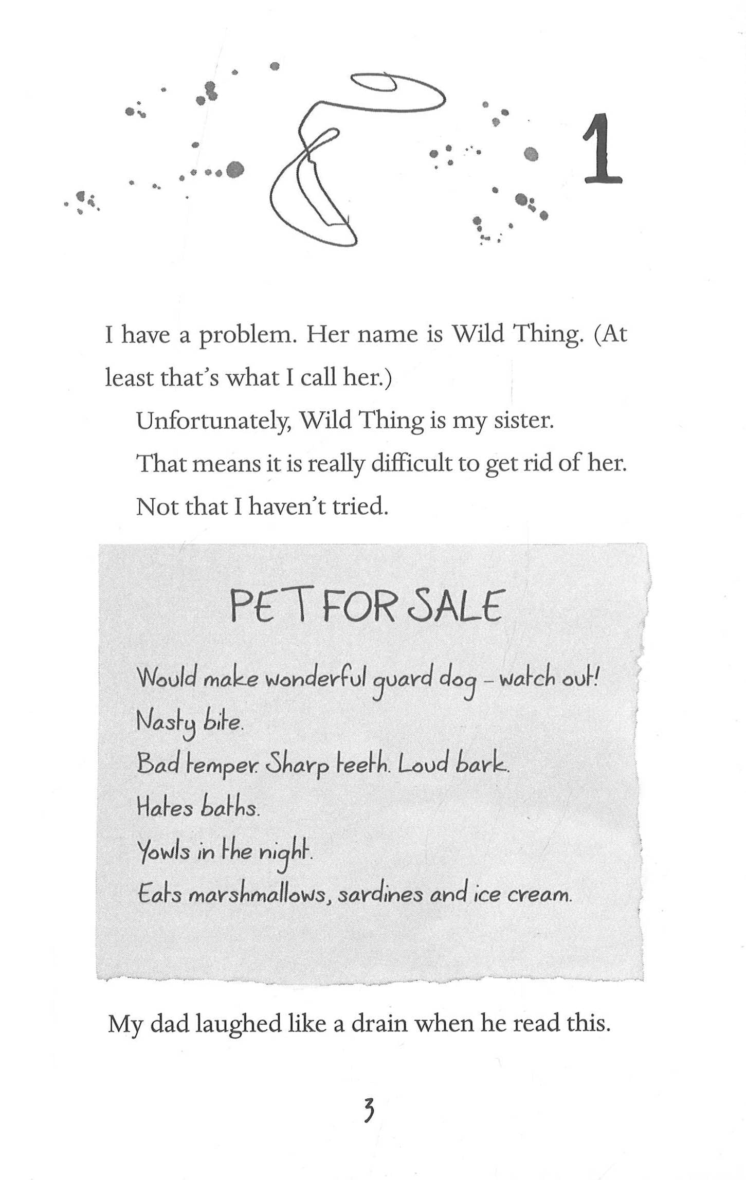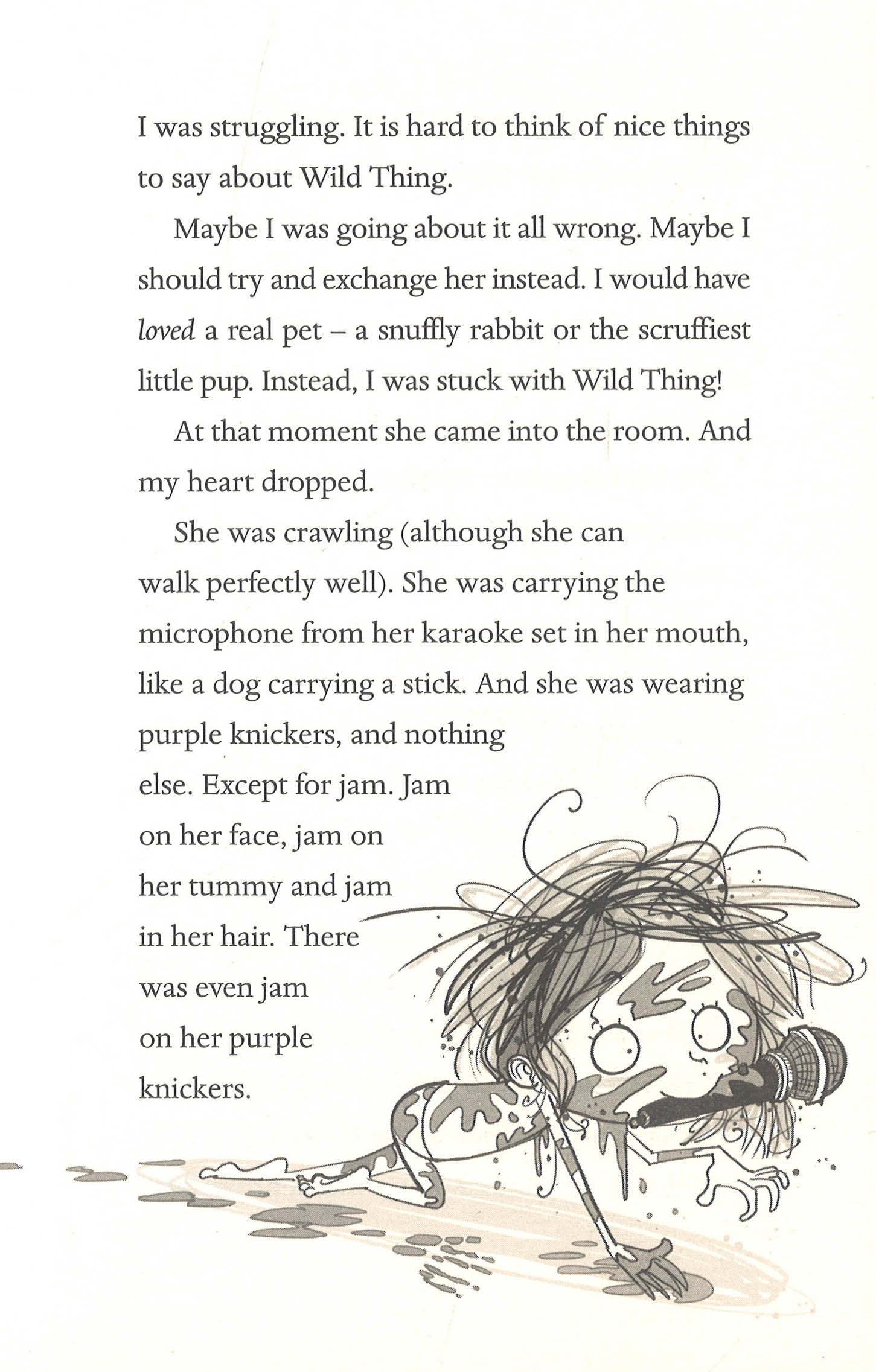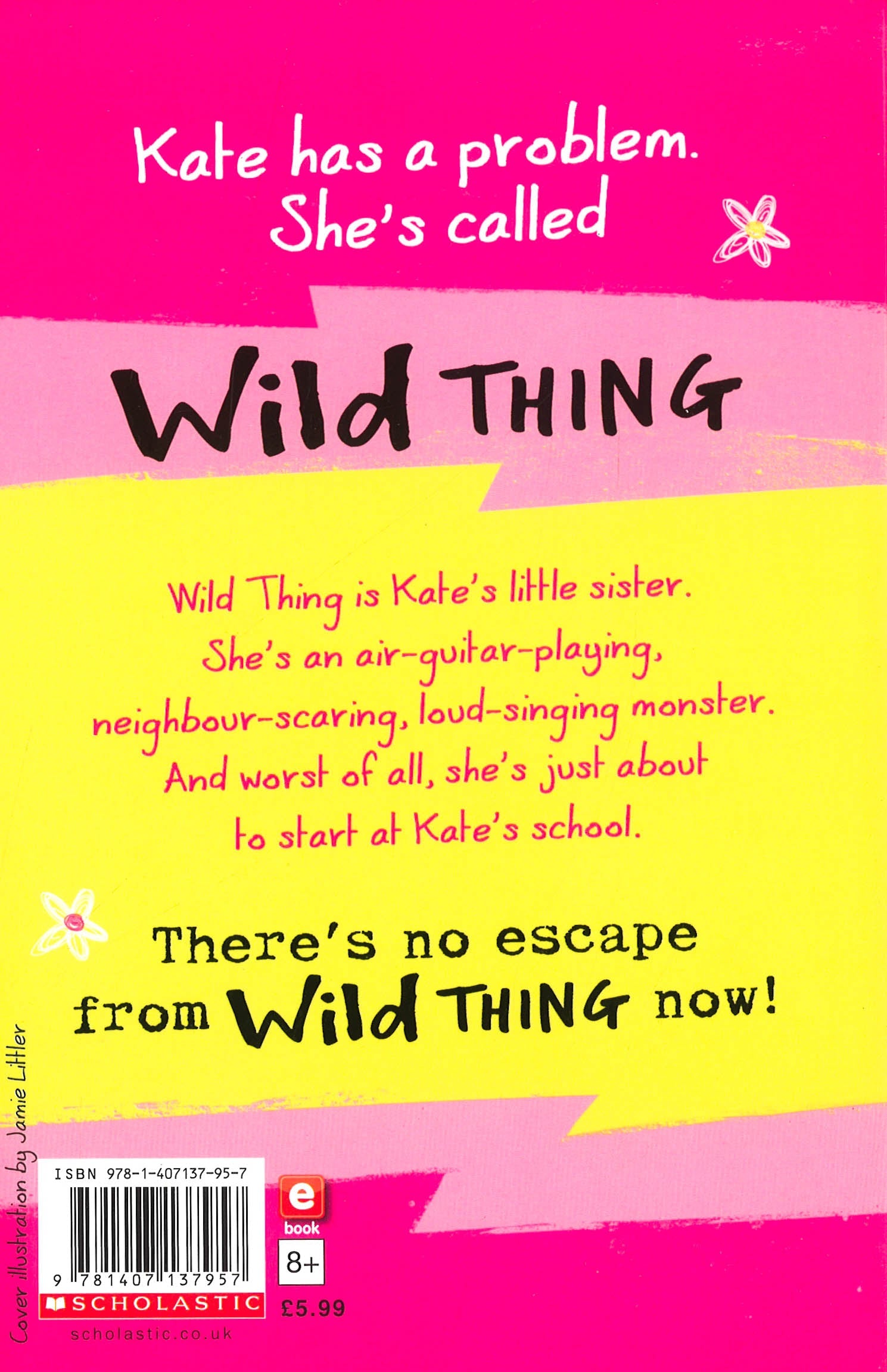 She's a demon child She's not meek and mild She's wild! Kate has a problem. It's called Wild Thing. Wild Thing is Kate's little sister. Kate's tried to get her rid of her, but the problem is no-one else would have her. When Wild Thing's not getting things stuck up her nose, she's biting people's bottoms and scaring the neighbours. All in all, she's a pain in the bum - quite literally. So when it's time for Wild Thing to start school, Kate is understandably nervous - especially when Wild Thing comes downstairs dressed in her favourite Rock Chick outfit (complete with wig...). On her first day at school Wild Thing: refuses to sit down, plays air guitar while the other children are singing sweetly, and chops her hair off in Arts and Crafts. She's so wild she even gets into the local newspaper! But when an intruder breaks into their house late at night, Kate realises it might not be such a bad thing having a wild sister after all. In fact, she quite likes having her around. One thing's for sure, there's nobody quite like Wild Thing.
