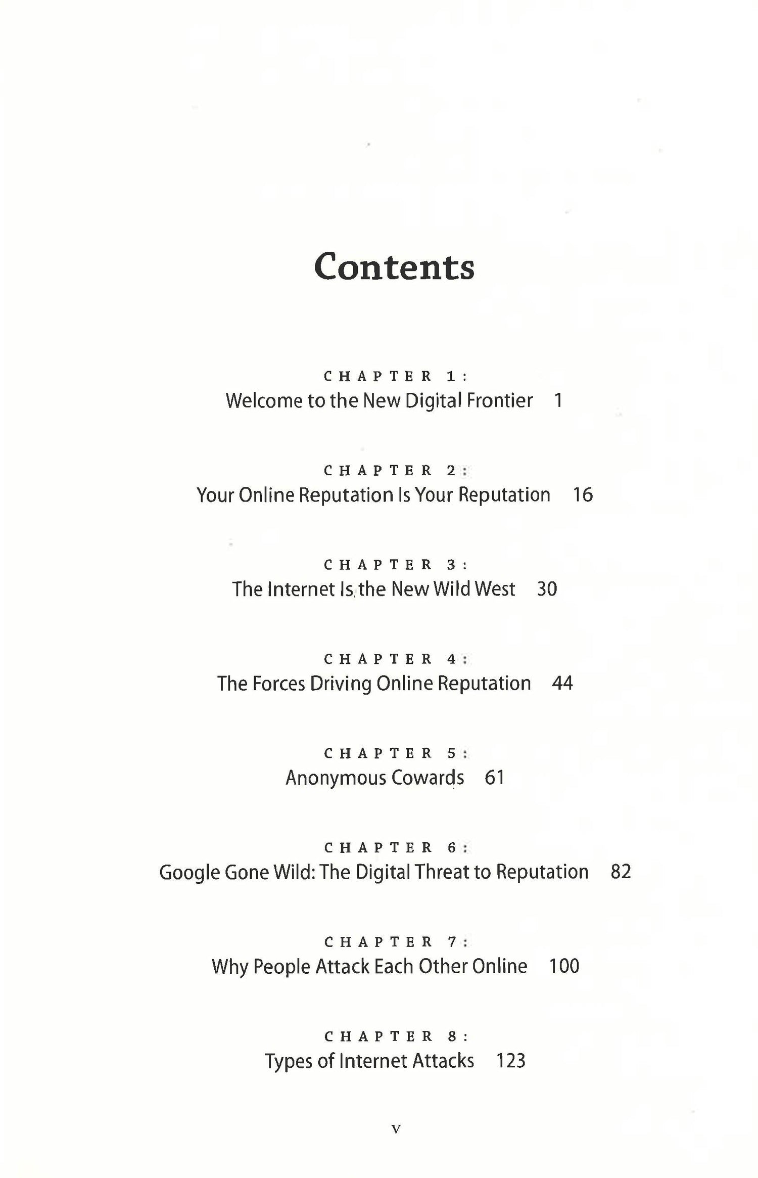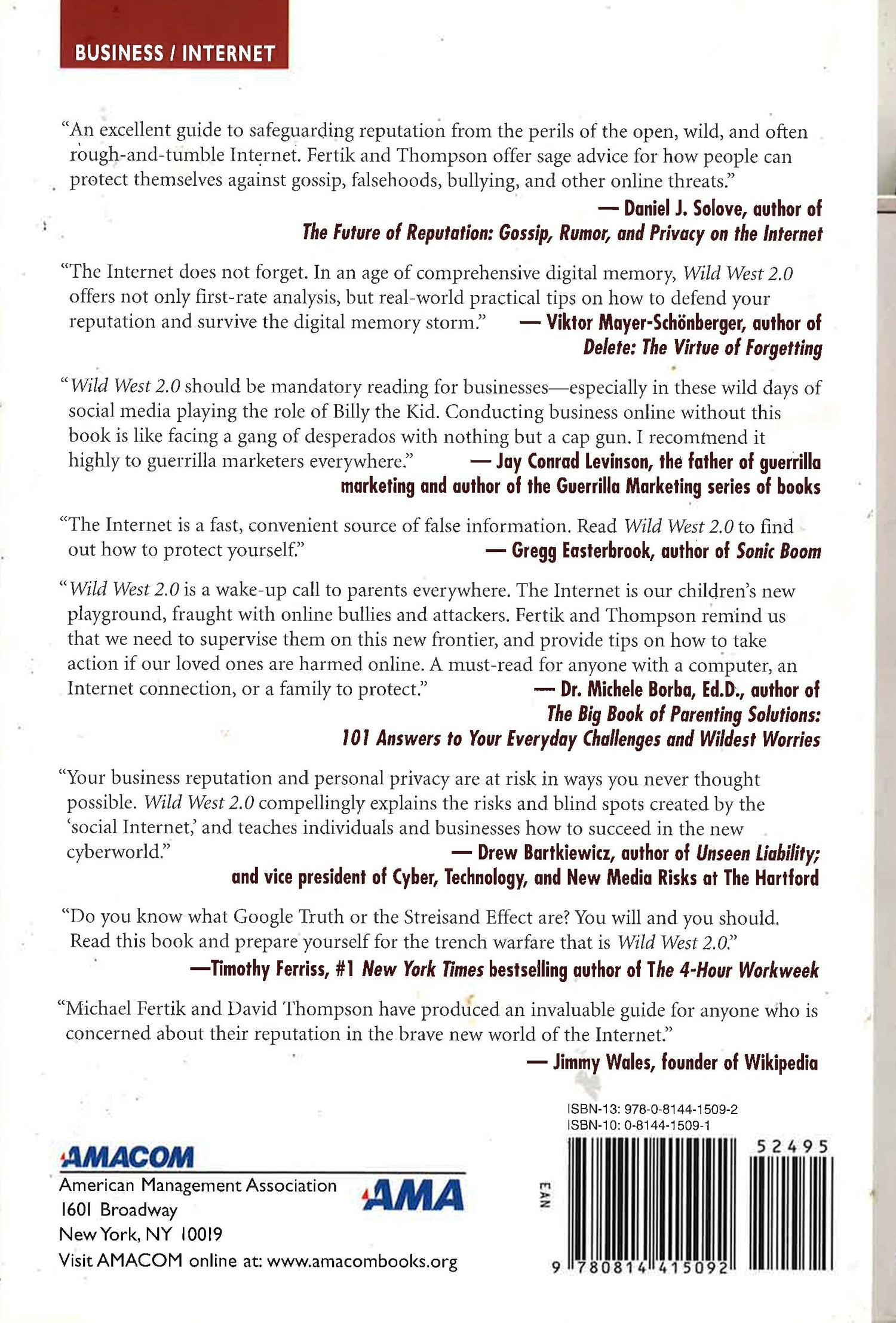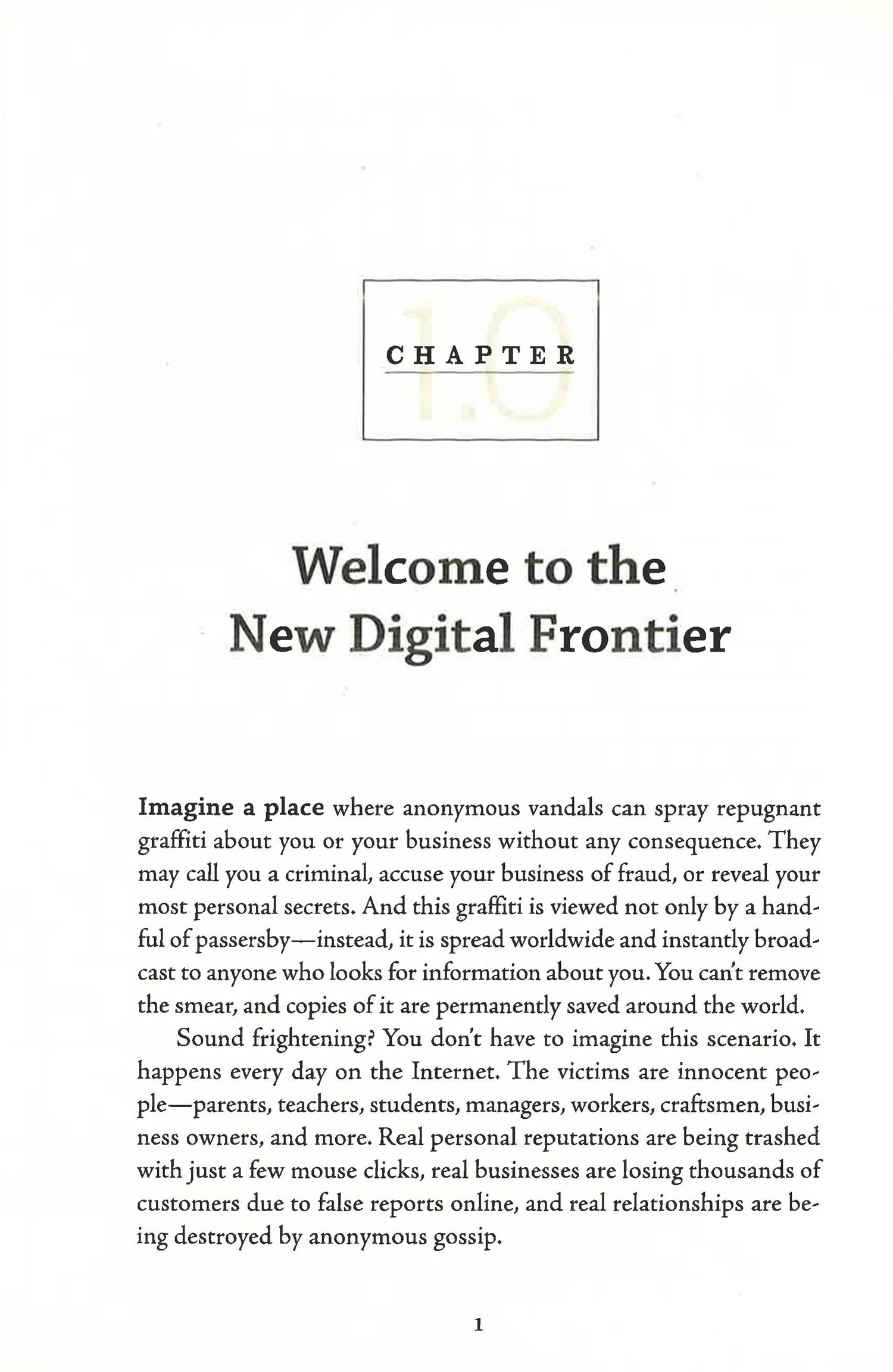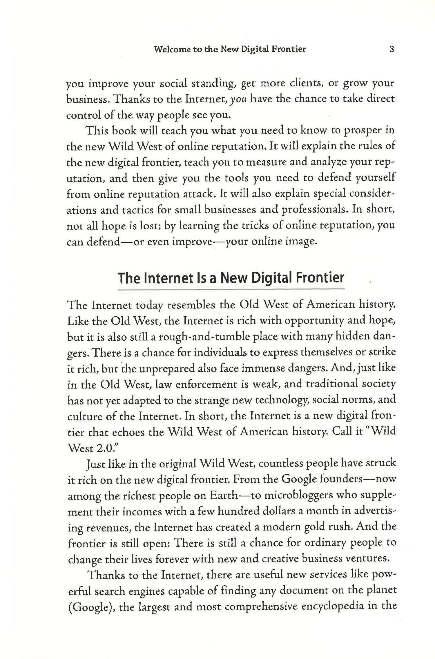 The Internet is like the Old West a frontier rich with opportunity and hope, but also a rough-and-tumble land of questionable characters, dubious legal jurisdictions, and hidden dangers. And just like the Old West, if you want to stake out your territory, you have to get there first and fend for yourself.On the web, that means defending your good name and reputation before the attacks start. Because, despite the excellent product or service you provide, all it takes is one unhappy customer, jealous acquaintance, or unsavory compe ti tor to start the rumors flying. Before you know it, search engines are regenerating that negative publicity every time someone researches you or your business.In the age of Wild West 2.0, everyone has an online reputation. Who do you want to create yours?