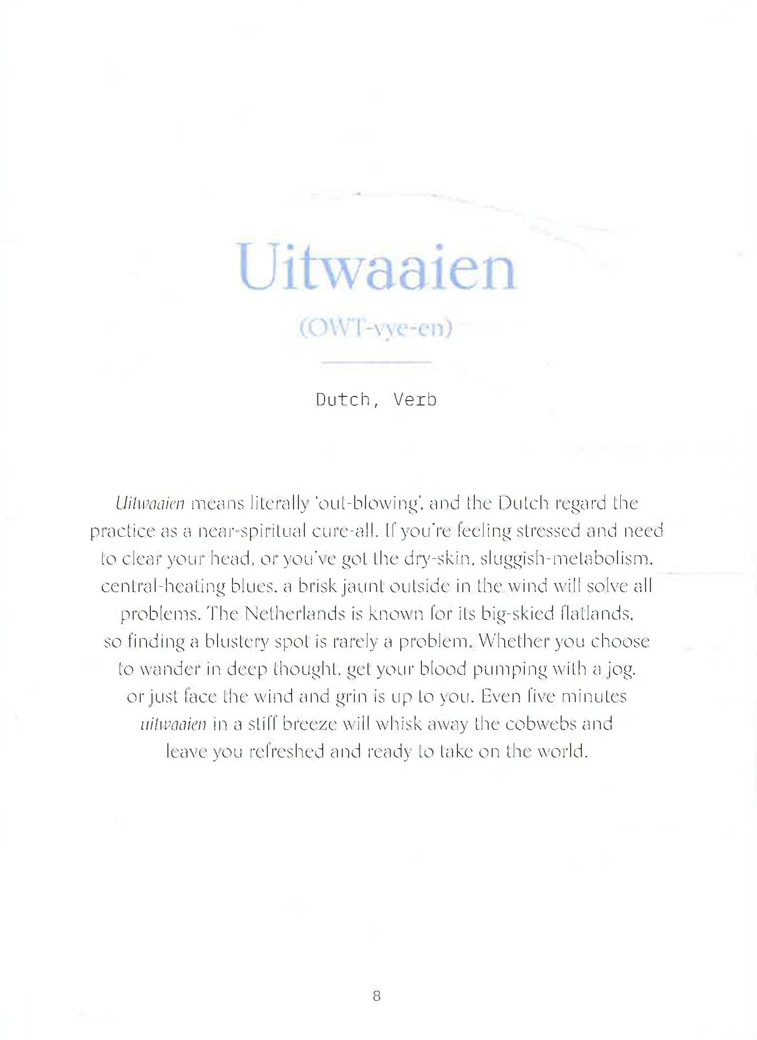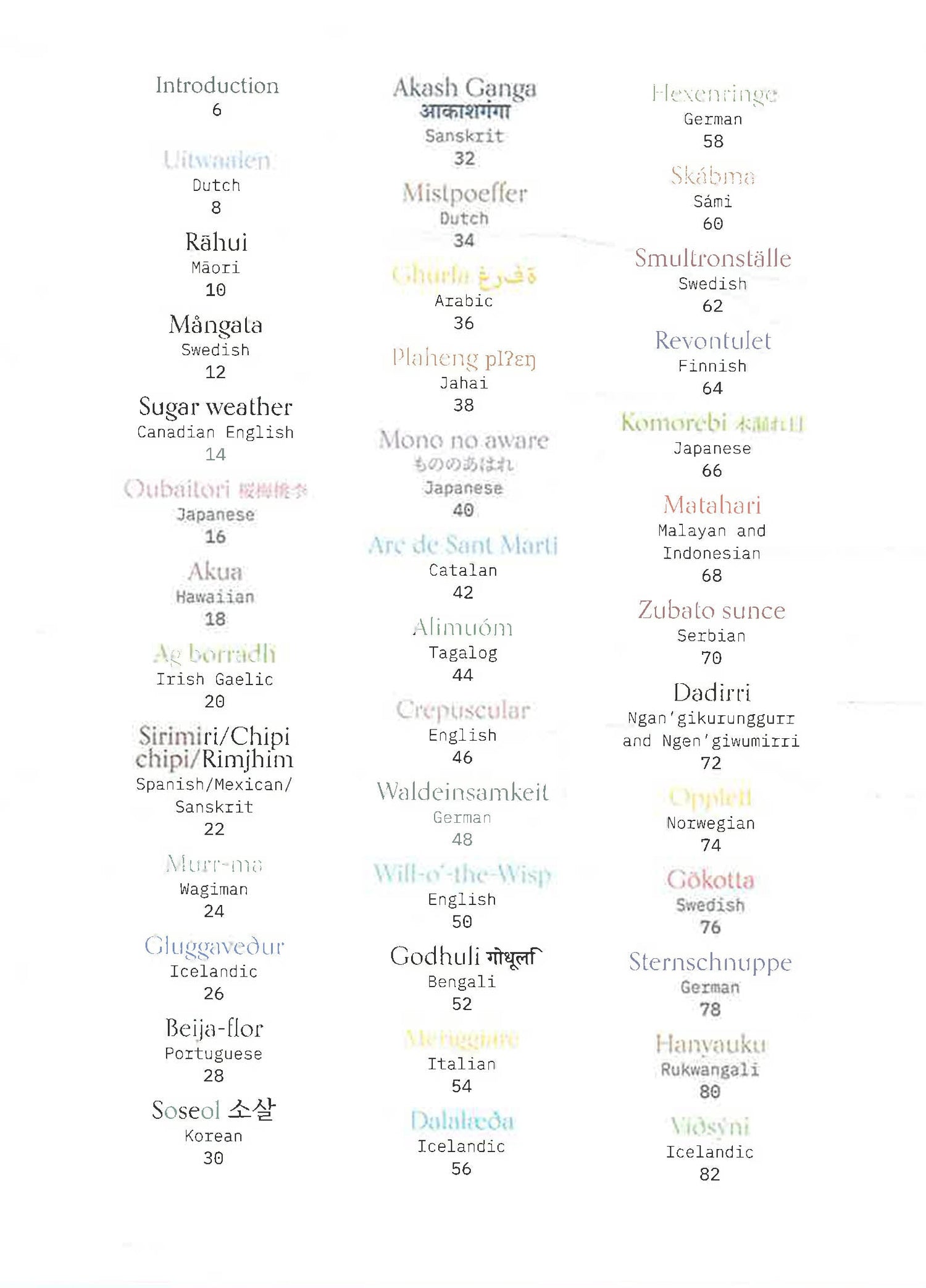 Each of the 75 words will have a 100-word description, including its pronunciation, a geographical/historical/cultural background, as well as reflecting on the emotional/mindful response the natural phenomenon can inspire. Each word will be paired with an illustration