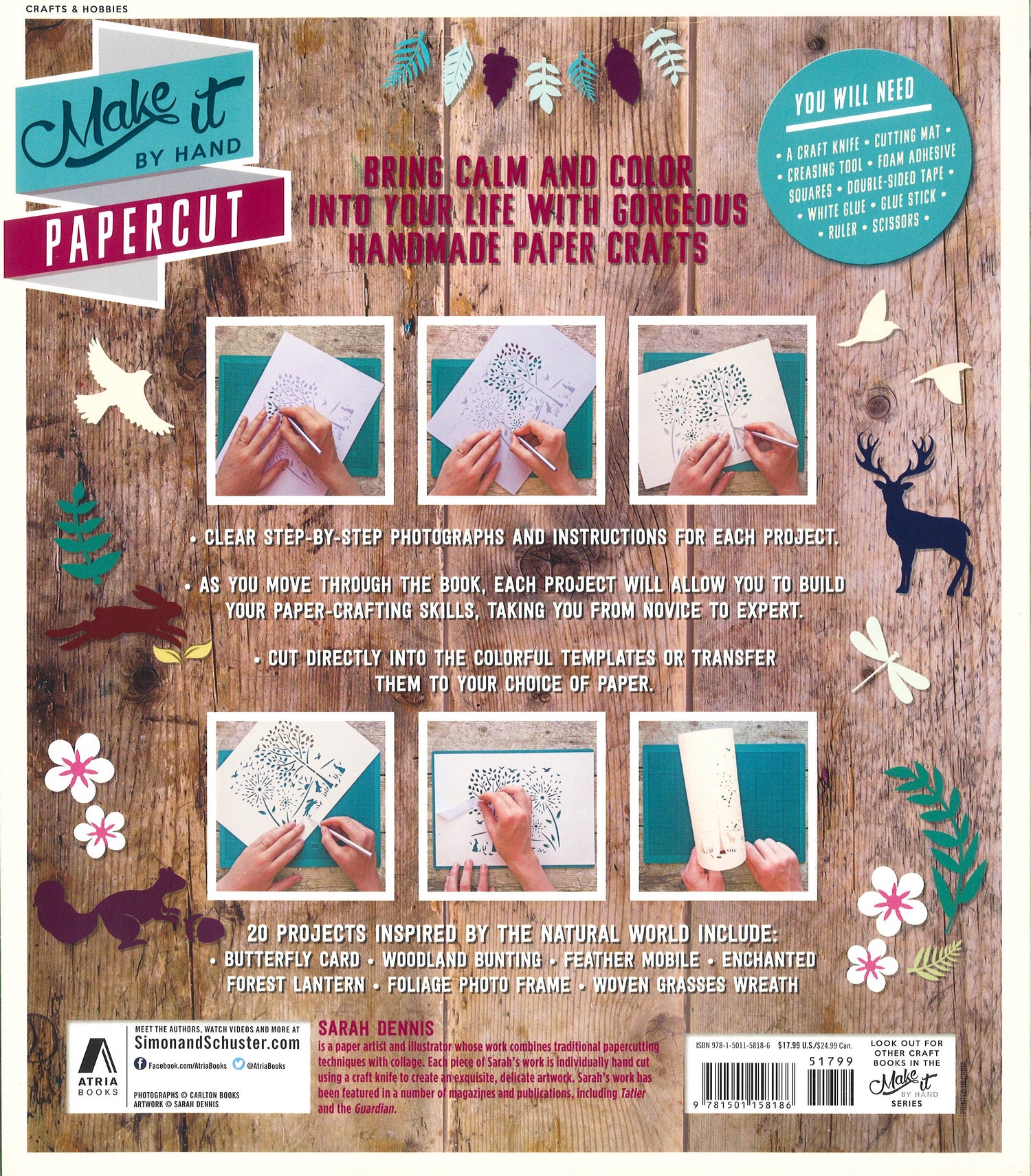 Bring calm and color into your life with gorgeous handmade paper crafts. Clear step-by-step photographs and instructions for each project. As you move through the book, each project will allow you to build your paper-crafting skills, taking you from novice to expert. Cut directly into the colorful templates or transfer them to your choice of paper. 20 projects inspired by the natural world include: butterfly card; woodland bunting; feather mobile; enchanted forest lantern; foliage photo frame; woven grasses wreath.