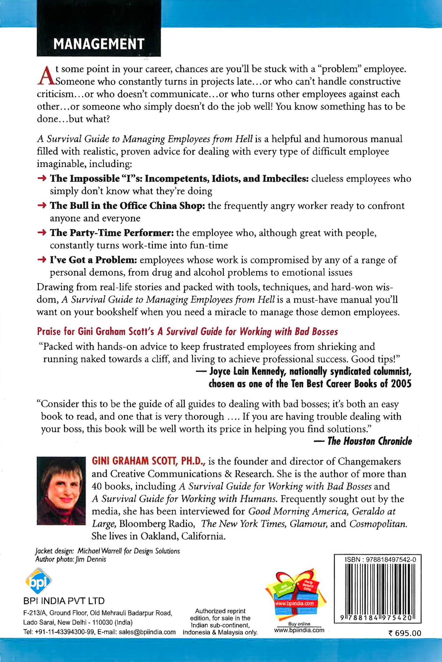 At some point in your career, chances are you'll be stuck with a "problem" employee, someone who constantly turns in projects late... or who can't handle constructive cristicism... or who doesn't communicate.... or who turns other employees against each other... or someone who simply doesn't do the job well! You know something has to be done... but what? "A Survival Guide to Managing Employees from Hell" is a helpful and humorous manual filled with realistic, proven advice for dealing with every type of difficult employee imaginable. including: The Impossible "I"s: Incompetents, Idiots, and Imbeciles: clueless employees who simply don't know what they're doing. The Bull in the Office Chain Shop: the frequently angry worker ready to confront anyone and everyone The Party-Time Performer: the employee who, although great with people, constantly turns work-time into fun-time. I've Got a Problem: employee whose work is compromised by any of a range of personal demons, from drug and alcohol problems to emotional issues. Drawing from real-life stories and packed with tools, techniques, and hard-won wisdom, this book is a must have manual you'll want on your bookshelf when you need a miracle to manage those demon employees