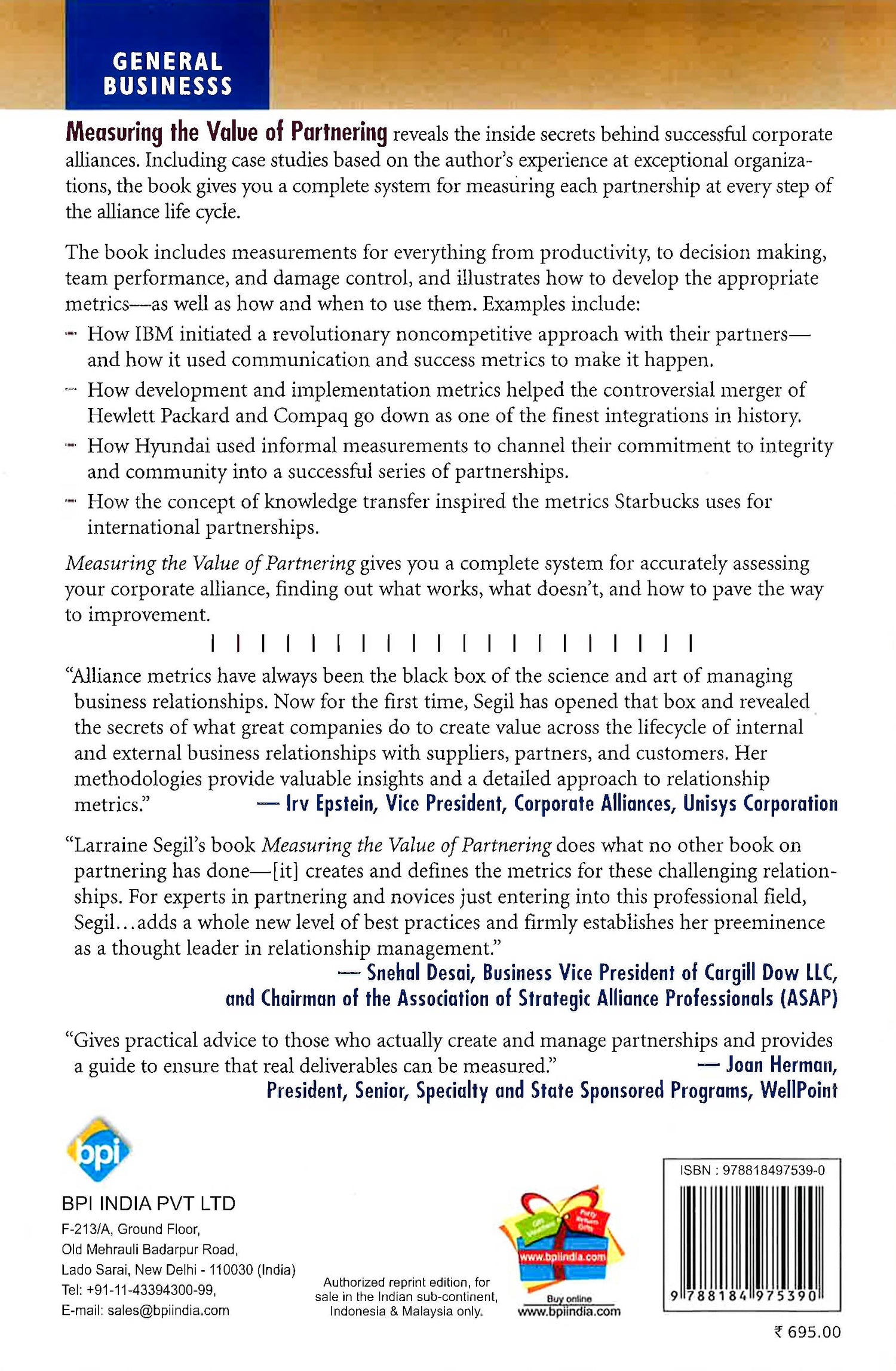 It enables you to hold a yardstick up to every facet of your business alliance, including productivity, decision-making, and team performance. The book points out important yet often-neglected metrics-such as how long it takes to make decisions, and when to implement damage control-showing you how to develop and use the appropriate metrics accurately and intelligently. Weaving together real-life case studies with practical applications you can readily adapt to your own organization, "Measuring the Value of Partnering" applies the everyday arithmetic of business to the art (and science) of alliance management. The book shows you how to balance the external needs of shareholders, customers, and suppliers with daily procedural concern of the newly-joined partners. Taking into account the number of diverse issues that affect alliances from all directions and perspectives, "Measuring the Value of Partnering" turns the daunting task of partnering into a readily attainable project. Packed with useful insider tips, the book helps you examine even the most complex of corporate partnerships, and use the results to achieve the greatest possible impact. The book includes measurements for everything from productivity, to decision making, team performance, and damage control, and illustrates how to develop the appropriate metrics-as well as how and when to use them. "Measuring the Value of Partnering" gives you a complete system for accurately assessing your corporate alliance, finding out what works, what doesn't and how to pave the way to improvement.