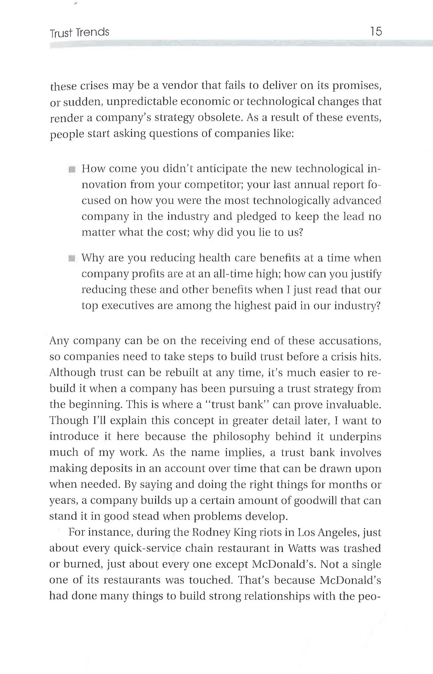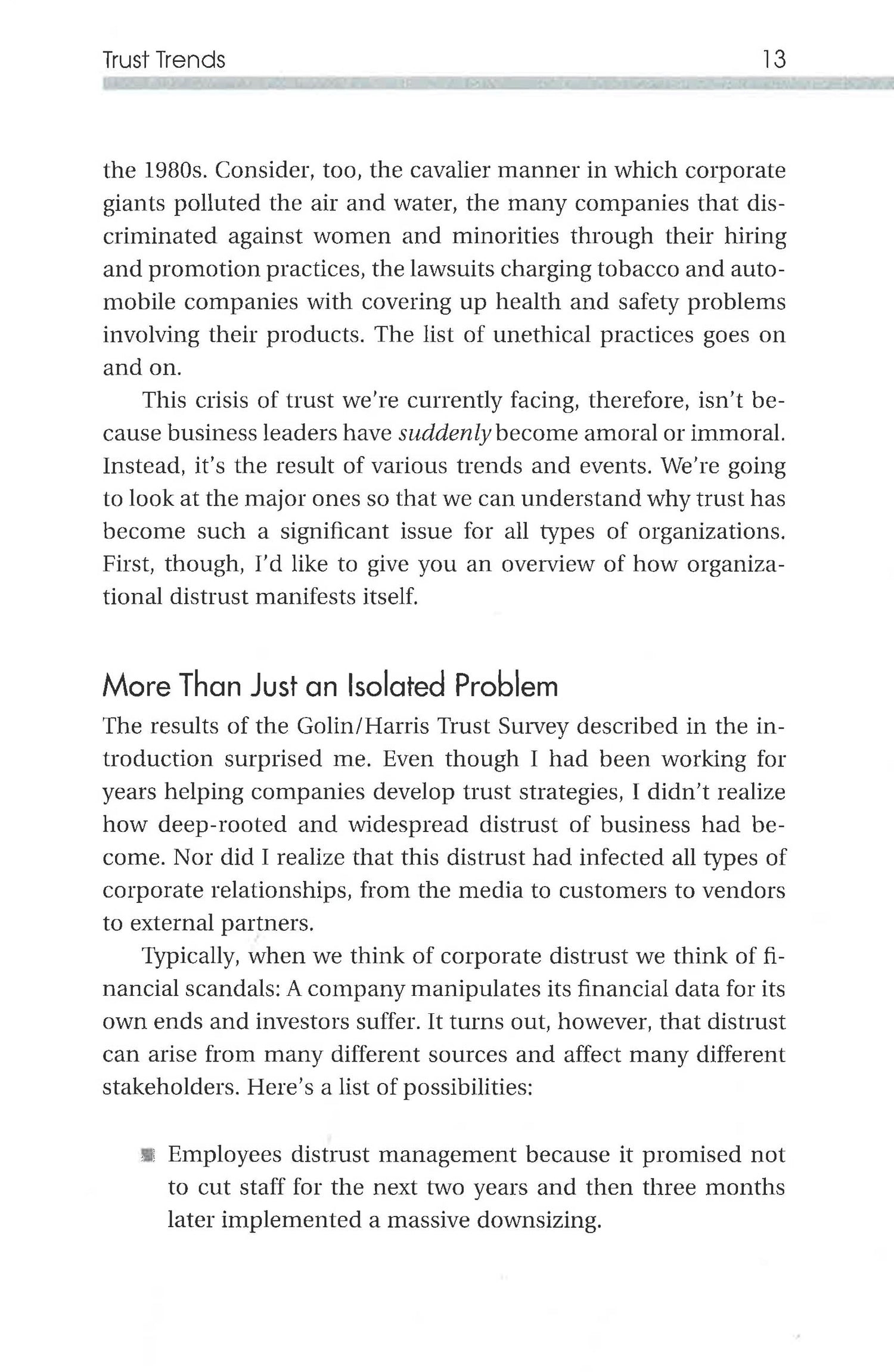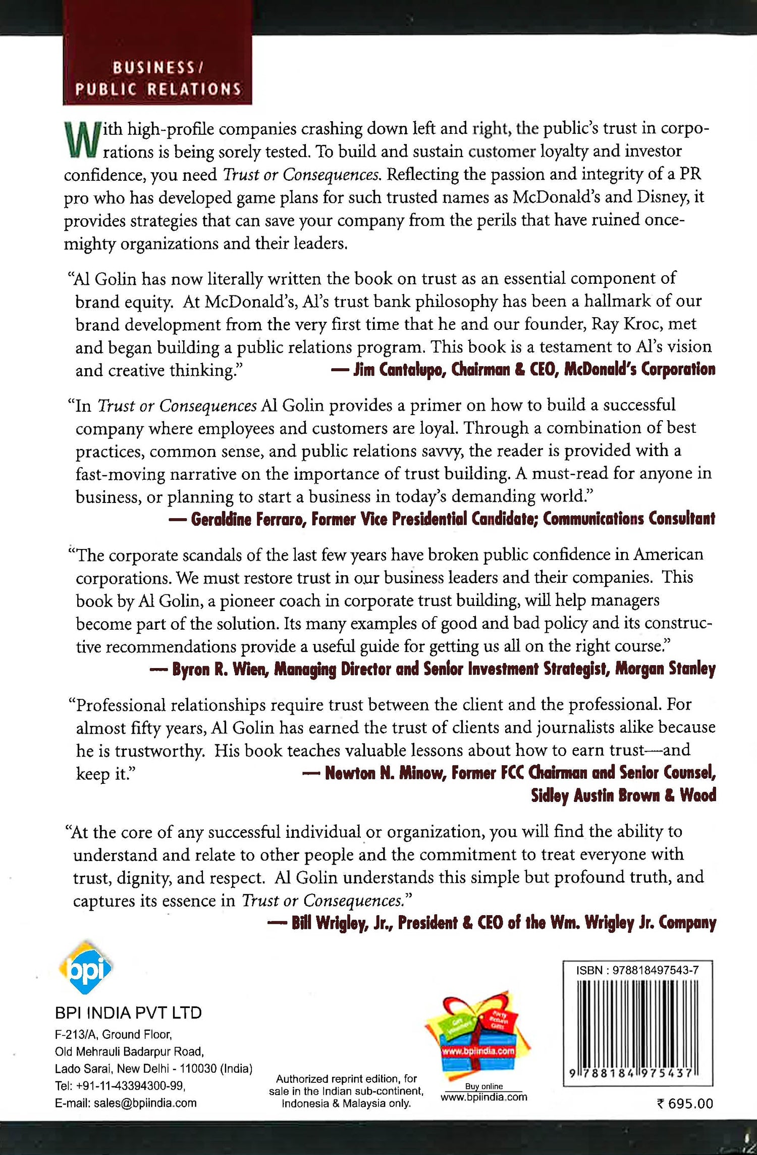 The book is divided into three sections. The first helps you assess where you company stands in matters of trust. The second includes steps every company can take to create trust among its constituencies. The third provides a framework to put things in perspective. The author lays out eight trust strategies, nine scenarios that will strengthen your ability to make tough trust decisions with vision as well as compassion, and ten commandments of organizational trust - including tips on how to respond to crises and develop positive relationship with the media. "Trust or Consequences" is crammed with case studies of companies whose trust- building policies benefit both themselves and their communities, including Owens Corning's program to educate children and homeowners about the importance of energy conservation; the McDonald's corporation's efforts to create good community relations in Los Angles (during the Rodney King riots, as store fronts by the dozens were wrecked and looted, not one McDonald's was damaged); Levi Strauss's ongoing support of social causes, such as fighting AIDS, even when it was hurting financially; and Gerber's rebound from its widely publicized use of starch and sugar in baby food, accomplished by building new reserviors of good will. Filled with provocative ideas about why many companies overlook trust issues, "Trust or Consequences" brings the subject to center stage - where it must remain if companies are to regain stakeholder loyalty and competitive advantage.