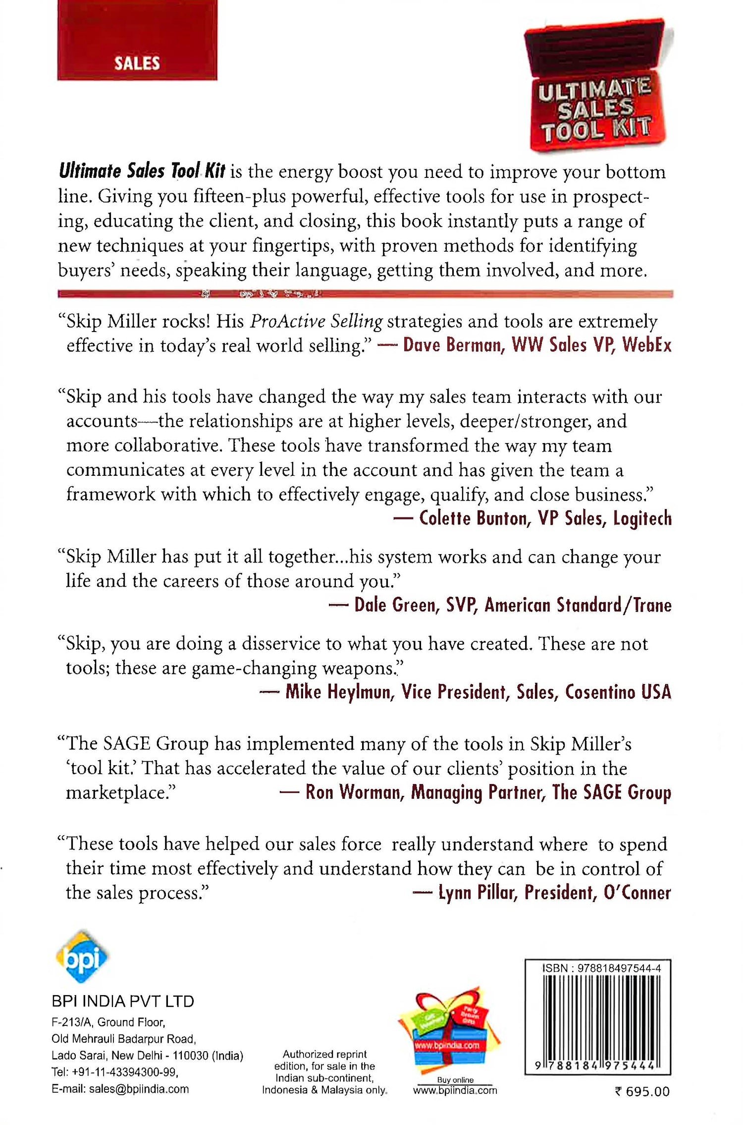 The book provides helpful examples and unique visual exercise that help you remember how and when to use each one and work them into your routine. Making it easy to flip to exactly what you need, right when you need it, each chapter introduces a different tool, with dynamic and exciting approaches for asking the right questions. You'll learn how to quickly open the door to larger sales, get buyers to call you back, gain access to the real decision-makers, and a whole lot more. Taking you far beyond your usual success patterns, "Ultimate Sales Tool Kit" doesn't ask you to get rid of what already works for you, but allows you to add to it. Most sales professionals incorporate a new method into their routine less than once a year - but when a major sale is on the line, you need to have the right tool at your disposal, and know how to use it. "Ultimate Sales Tool Kit" arms you with brand new tactics that will energize your performance and bring in more sales than you ever thought possible. "Ultimate Sales Tool Kit" is the energy boost you need to improve your bottom line. Giving you fifteen-plus, powerful, effective tools for use in prospecting, educating the client, and closing, this book instantly puts a range of new techniques at your fingertips, with proven methods for identifying buyer's needs, speaking their language, getting them involved, and more.