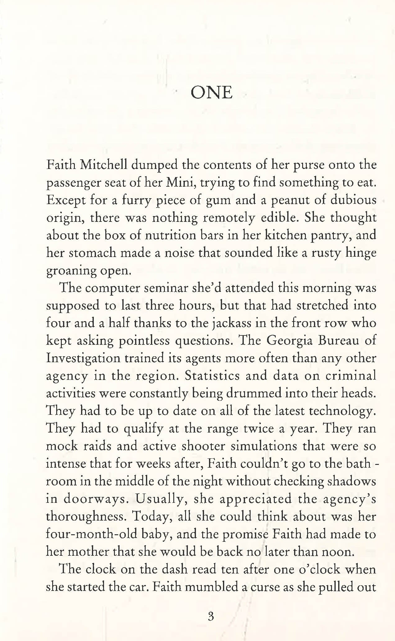 Special Agent Faith Mitchell returns home to a nightmare. Her baby daughter Emma has been locked outside, and there's a trail of blood to the front door. Without waiting for back-up, Faith enters the house. Inside a man lies dead in a pool of blood, but most worrying of all, her mother is missing. When the Atlanta police arrive, Faith has some difficult questions to answer, but she has some desperate questions of her own.