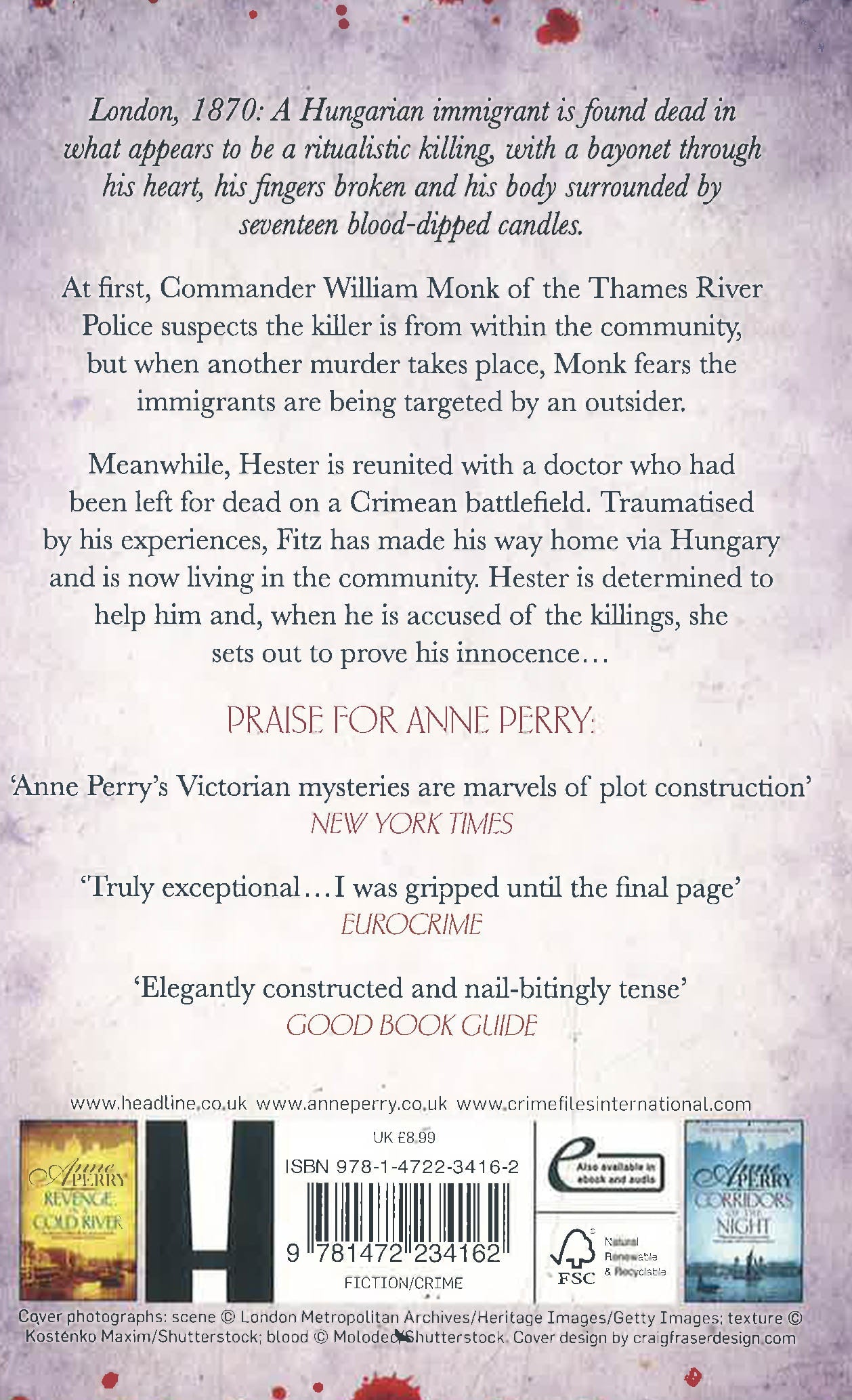The master of the Victorian crime, New York Times bestselling author Anne Perry returns with the 23rd novel in the William Monk series, AN ECHO OF MURDER.London, 1870: The body of a Hungarian immigrant is found dead in what appears to be a ritualistic killing, with a bayonet through his heart, his fingers broken and his body surrounded by seventeen blood-dipped candles. At first, Commander William Monk of the Thames River Police suspects the killer is from within the community, but when another murder takes place, Monk fears the immigrants are being targeted by an outsider...Meanwhile, Hester is reunited with a doctor who had been left for dead on a Crimean battlefield. Traumatised by his experiences, Fitz has made his way home via Hungary and is now living in the community. Hester is determined to help him and, when he is accused of the killings, she sets out to prove his innocence...