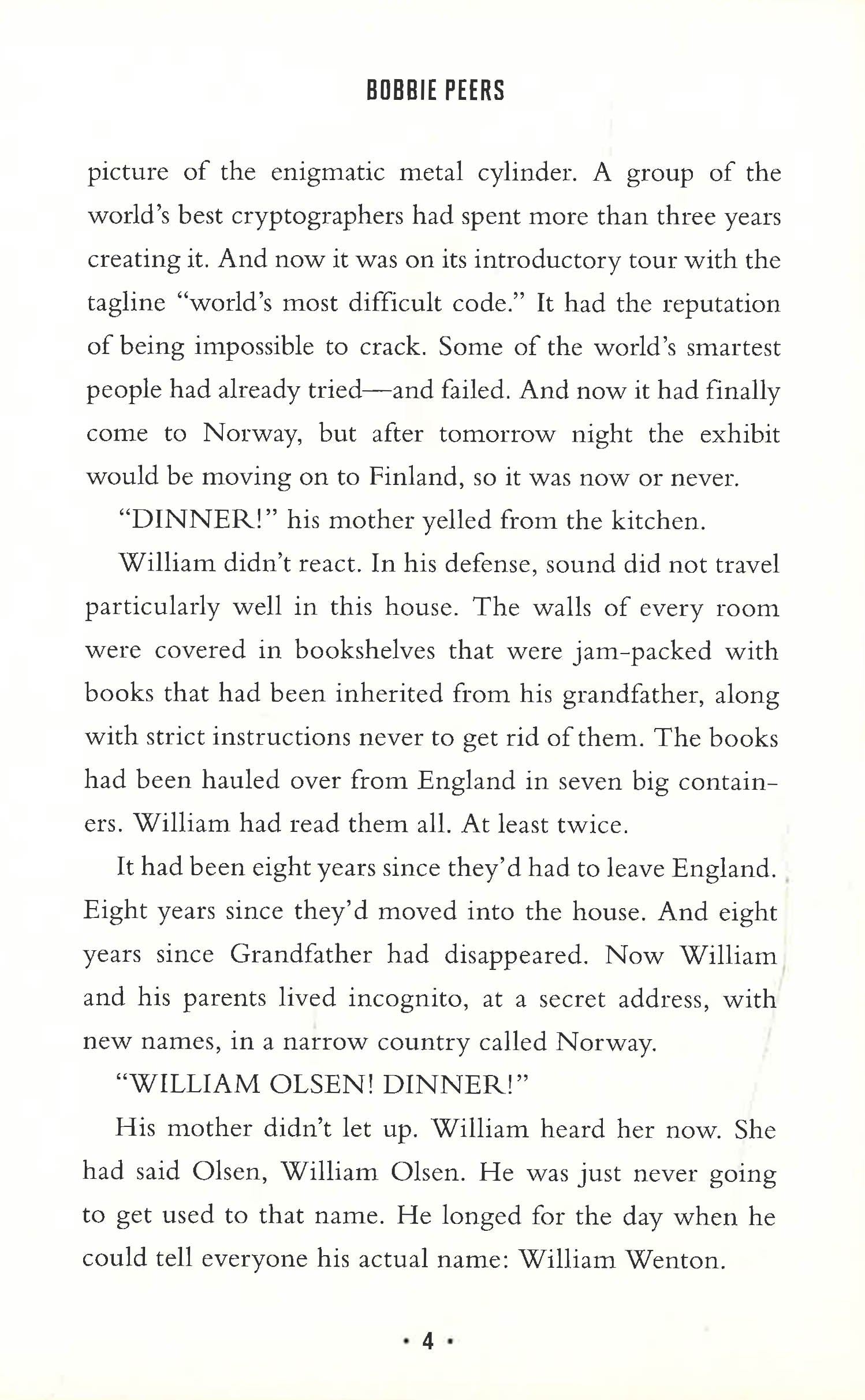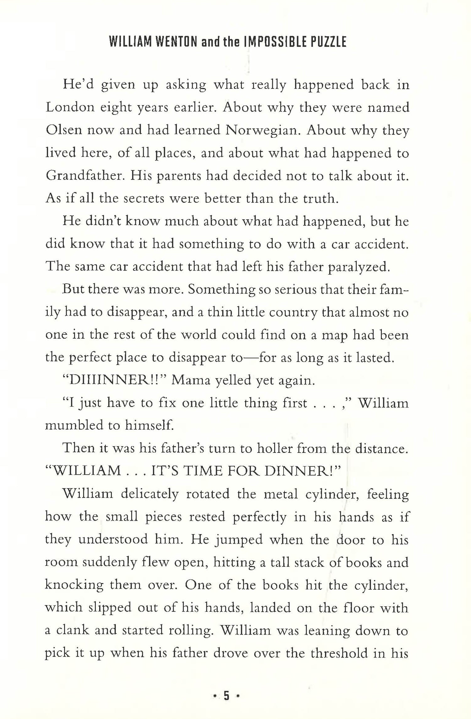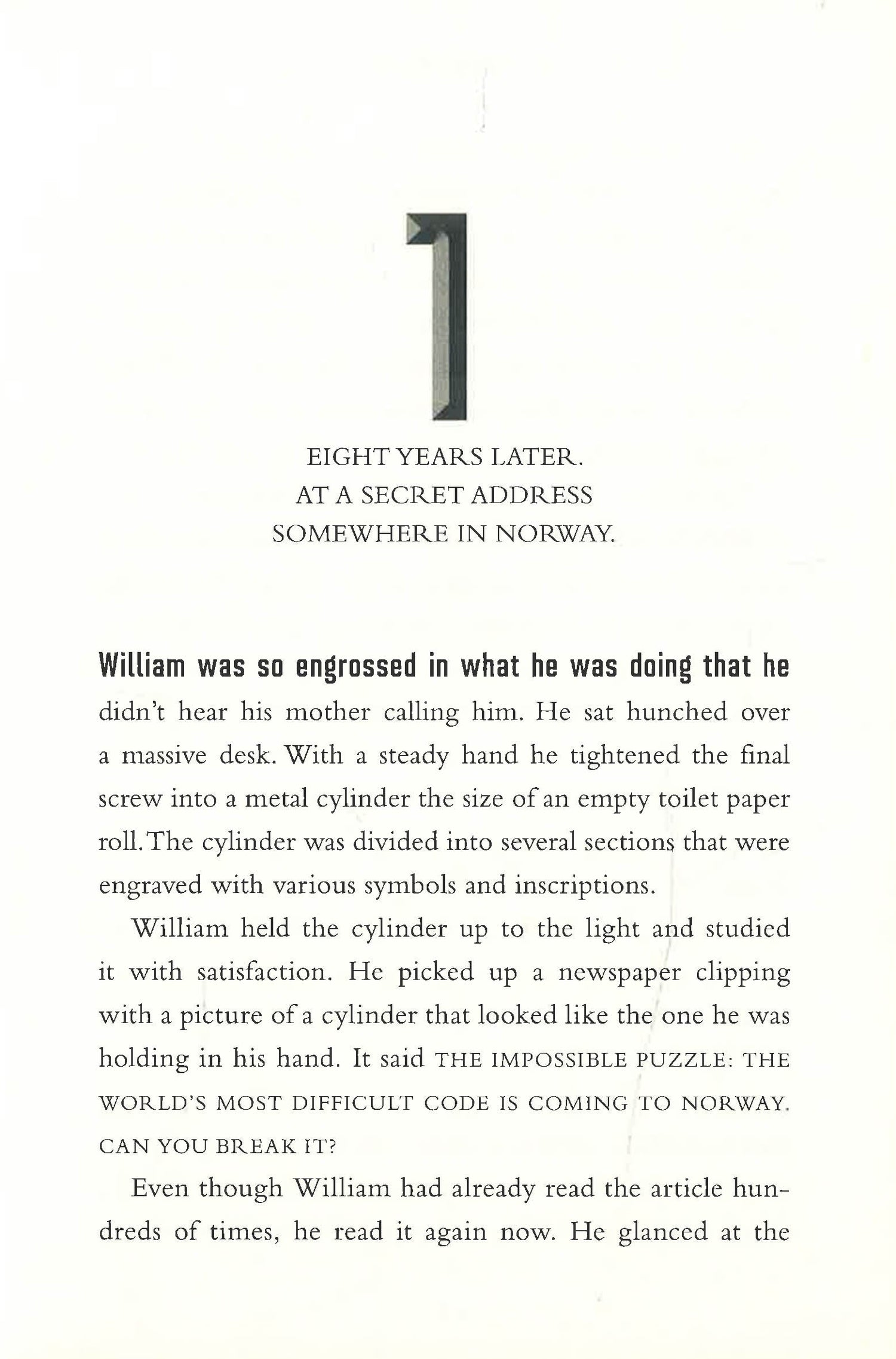 Twelve-year-old William Wenton is a puzzle-solving genius. He lives with his family in a quiet Norwegian town. They used to live in England, but eight years ago his family suddenly packed up, moved away, and even changed their last name! Neither of his parents will offer an explanation or tell William why he has to keep his talent for solving codes and puzzles a secret. But then a special exhibit comes to the local museum: the Impossible Puzzle. The experts say it is unsolvable, but William’s sure that he can crack it if he gets a chance.However, when he does, everything begins to go wrong. Suddenly William is whisked off to a strange school filled with robots and kids whose skills are almost as good as his own. But what’s really going on? And what’s the secret involving William’s grandfather? And is there anyone he can trust?