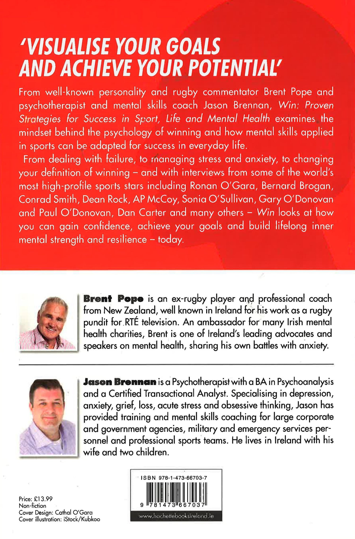 Visualise your goals and achieve your potential.'Easy-to-follow and extremely effective, Win will change the way you think about all aspects of your life.From well-known personality and rugby commentator Brent Pope and psychotherapist and mental skills coach Jason Brennan, Win: Proven Strategies for Success in Sports, Life and Mental Health examines the mindset behind the psychology of winning and how the mental skills applied in sports can be adapted for success in everyday life. From dealing with failure, to managing stress and anxiety, to changing your definition of winning - and with interviews from some of the world's most high-profile sports stars including Ronan O'Gara, Bernard Brogan, Conrad Smith, Dean Rock, AP McCoy, Sonia O'Sullivan, Gary O'Donovan and Paul O'Donovan, Dan Carter and many others - Win looks at how you can gain confidence, achieve your goals and build lifelong inner mental strength and resilience - today.