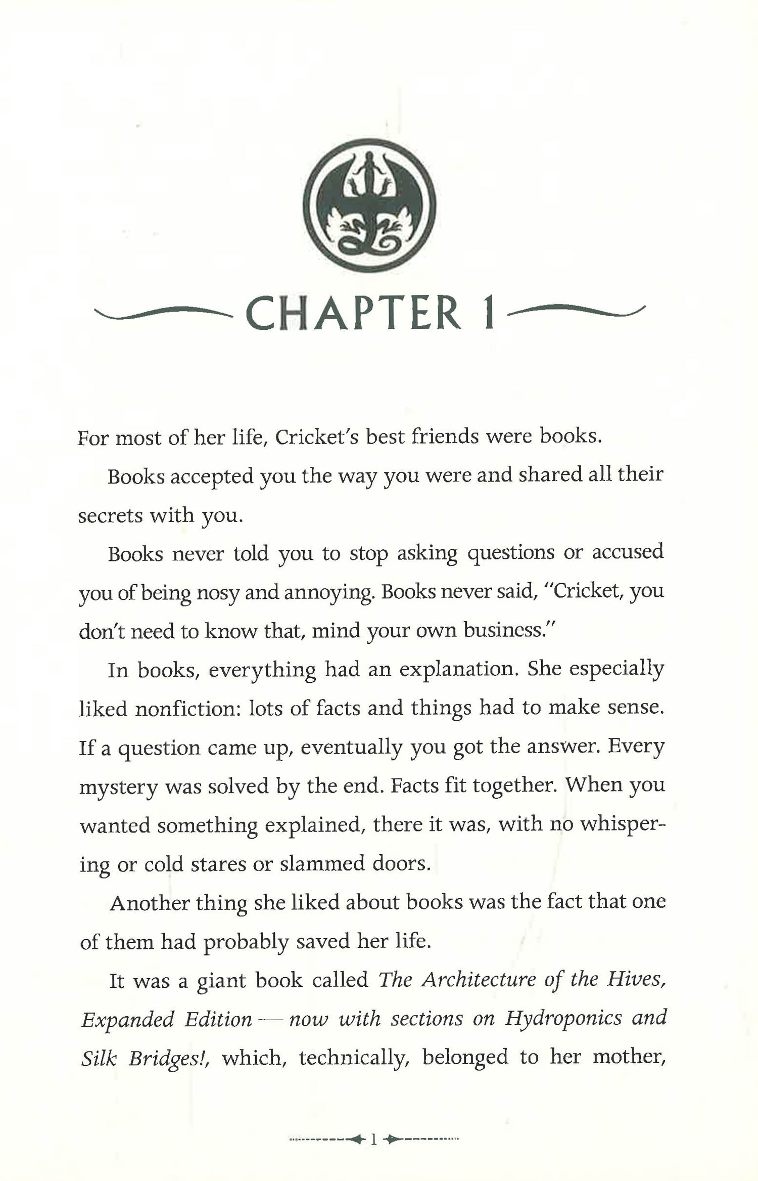 Growing up in the hives, Cricket has always had a million questions. Why are trees forbidden, even in art? Why do her parents seem to hate her? And the biggest, most dangerous and secret question of all: Why is Cricket immune to Queen Wasp's powers? Whenever the queen takes control of all the HiveWings, speaking through their mouths and seeing through their eyes, Cricket has to hide, terrified of being discovered.