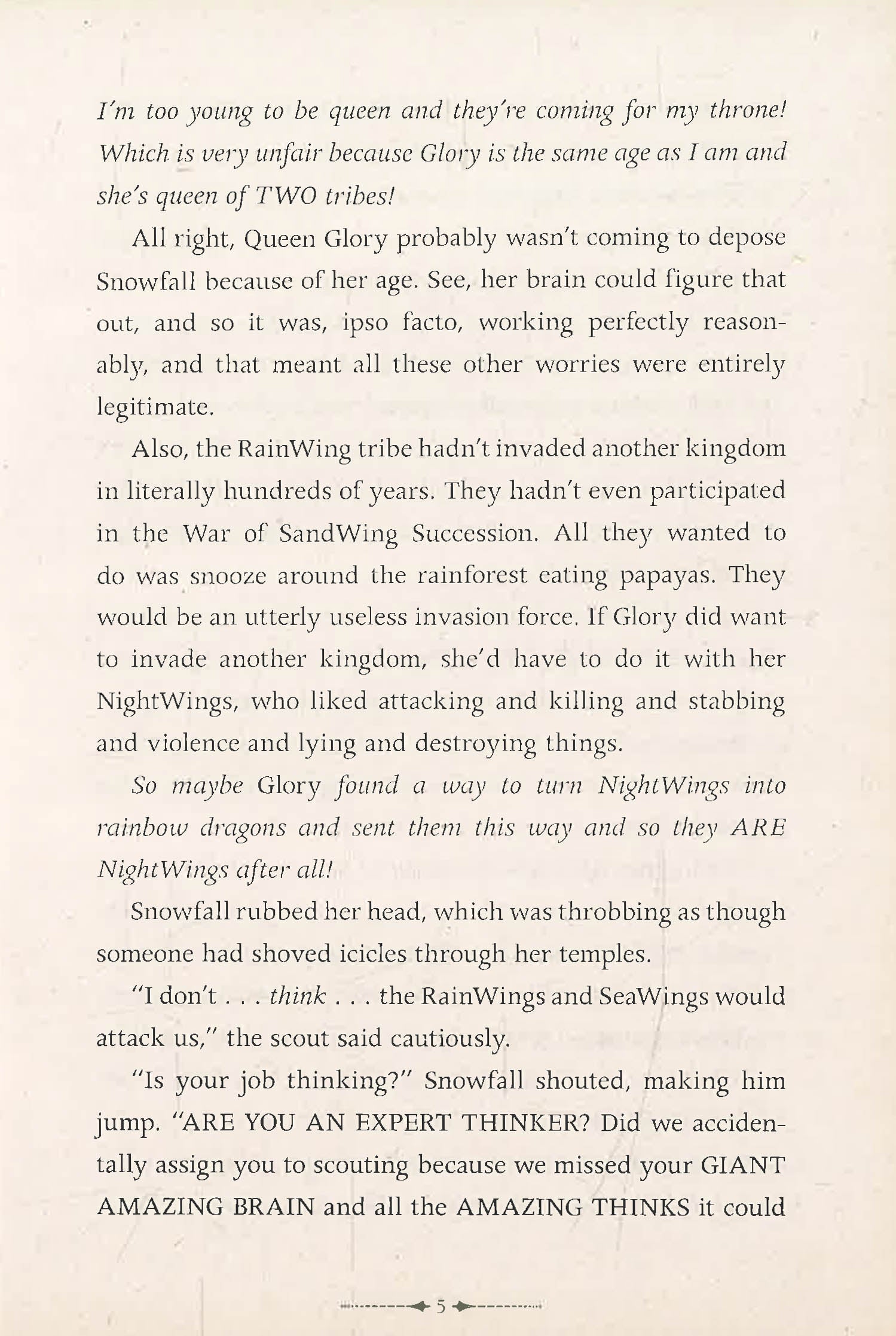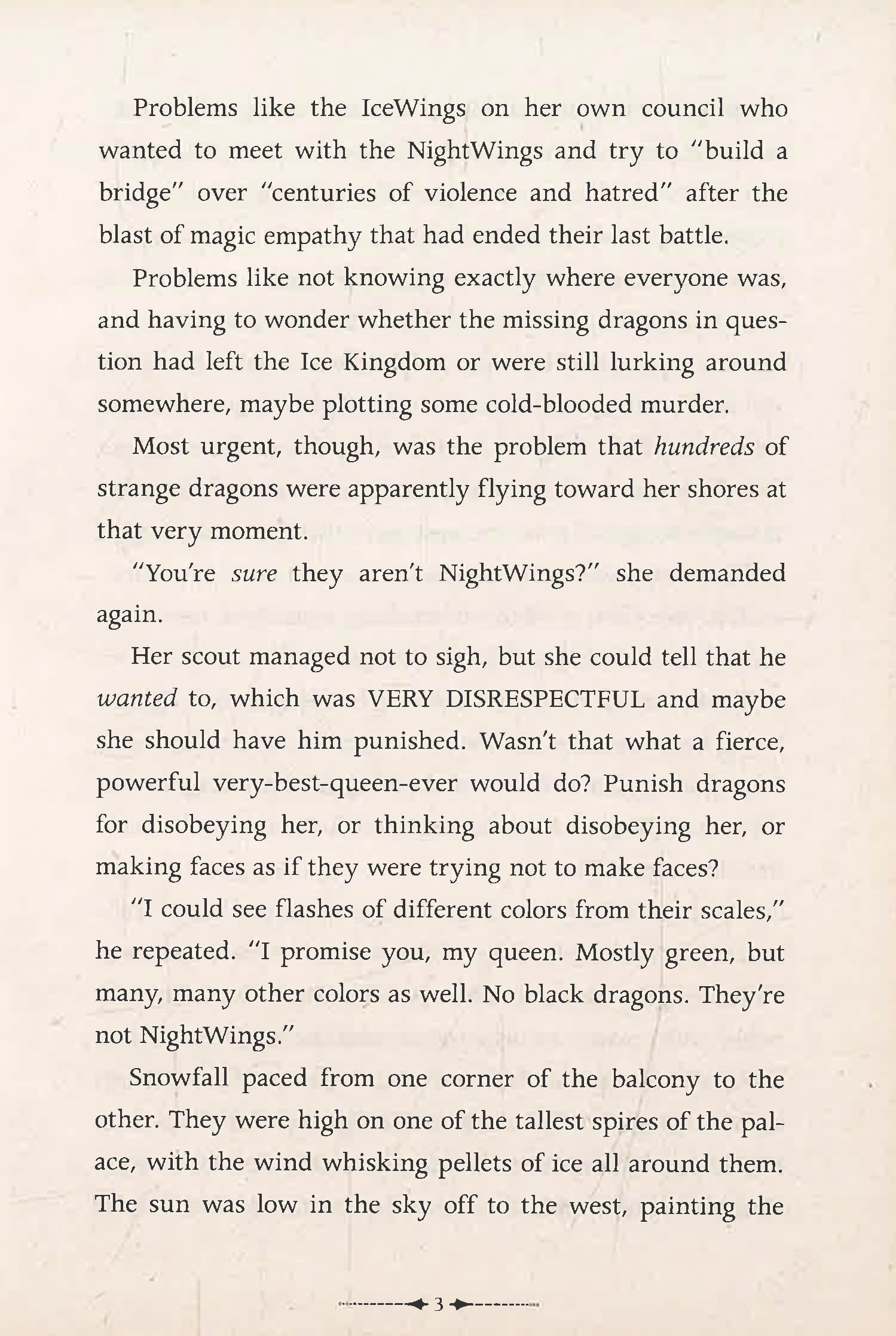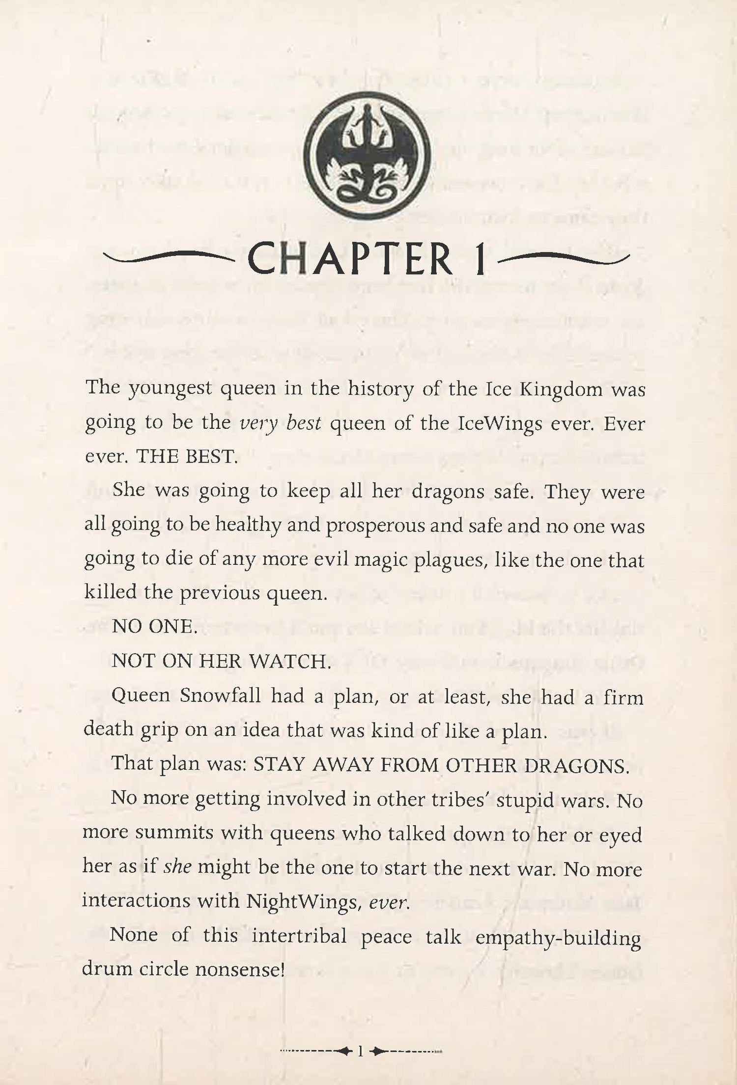 Snowfall didn't expect to be queen of the IceWings at such a young age, but now that she is, she's going to be the best queen ever. All she has to do is keep her tribe within IceWing territory, where it's safe -- while keeping every other tribe out, where they belong.