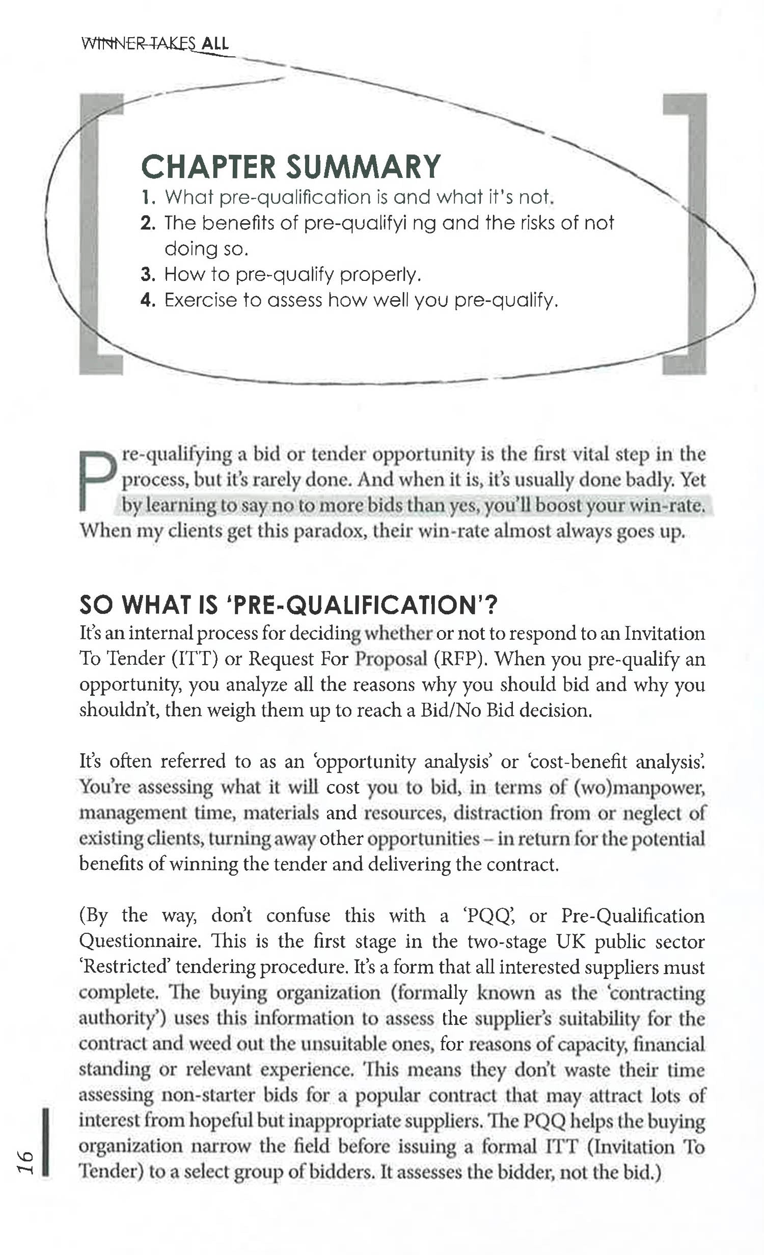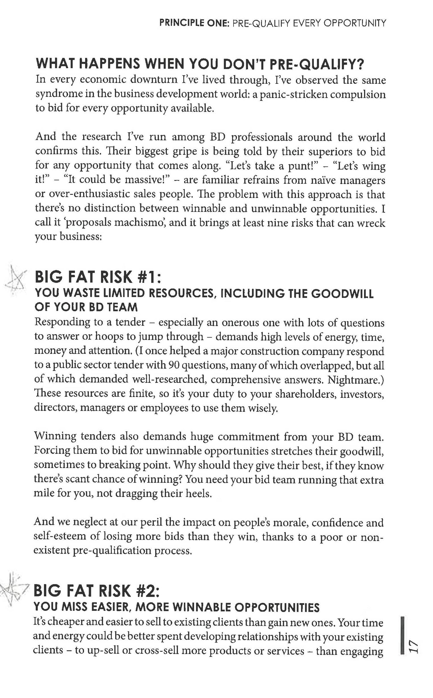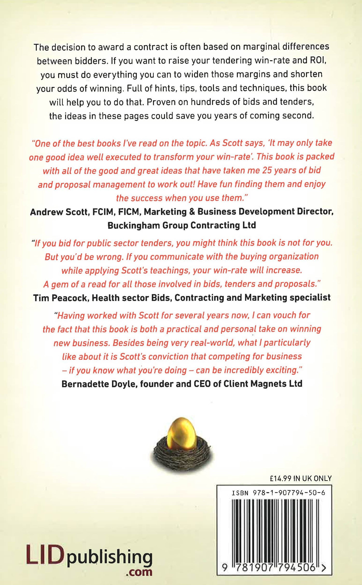 These days, most companies find themselves having to tender or bid for new contracts and clients. It?s now part of the business landscape?companies simply have to be good at tendering and pitching if they are going to have any chance of getting new business and clients. This book, written by one of the leading consultants and trainers in competitive business tendering, provides the key principles for winning bids, tenders, and proposals. Savvy and practical, the principles are based on the author?s extensive consulting experience with large and small companies, helping them to win big-ticket, must-win contracts (with a success rate of 86 percent). These essential principles apply to all companies, in all sectors, that are seeking to improve their new-business win rate.
