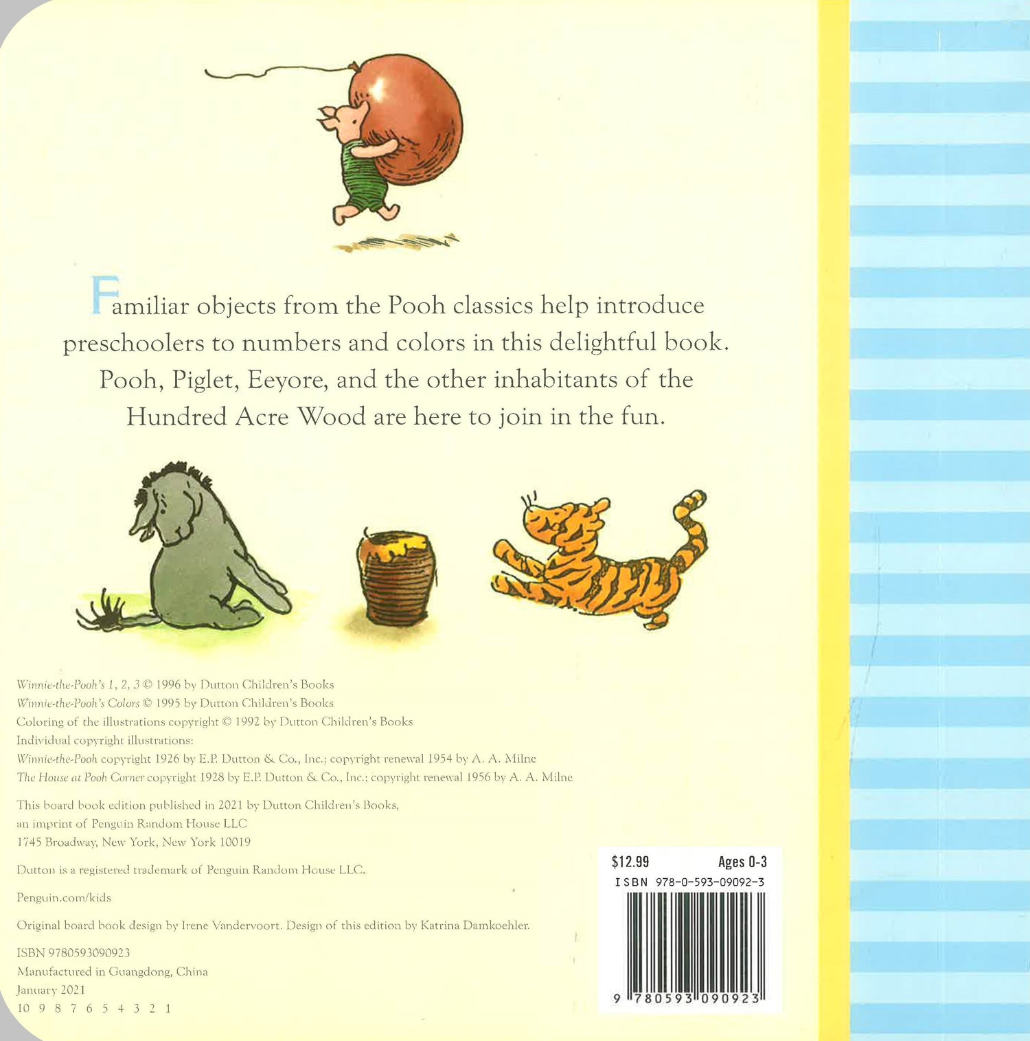Familiar objects from the Pooh classics help introduce preschoolers to numbers and colors in this delightful book. Pooh, Piglet, Eeyore, and the other inhabitants of the Hundred Acre Wood are here to join in the fun.