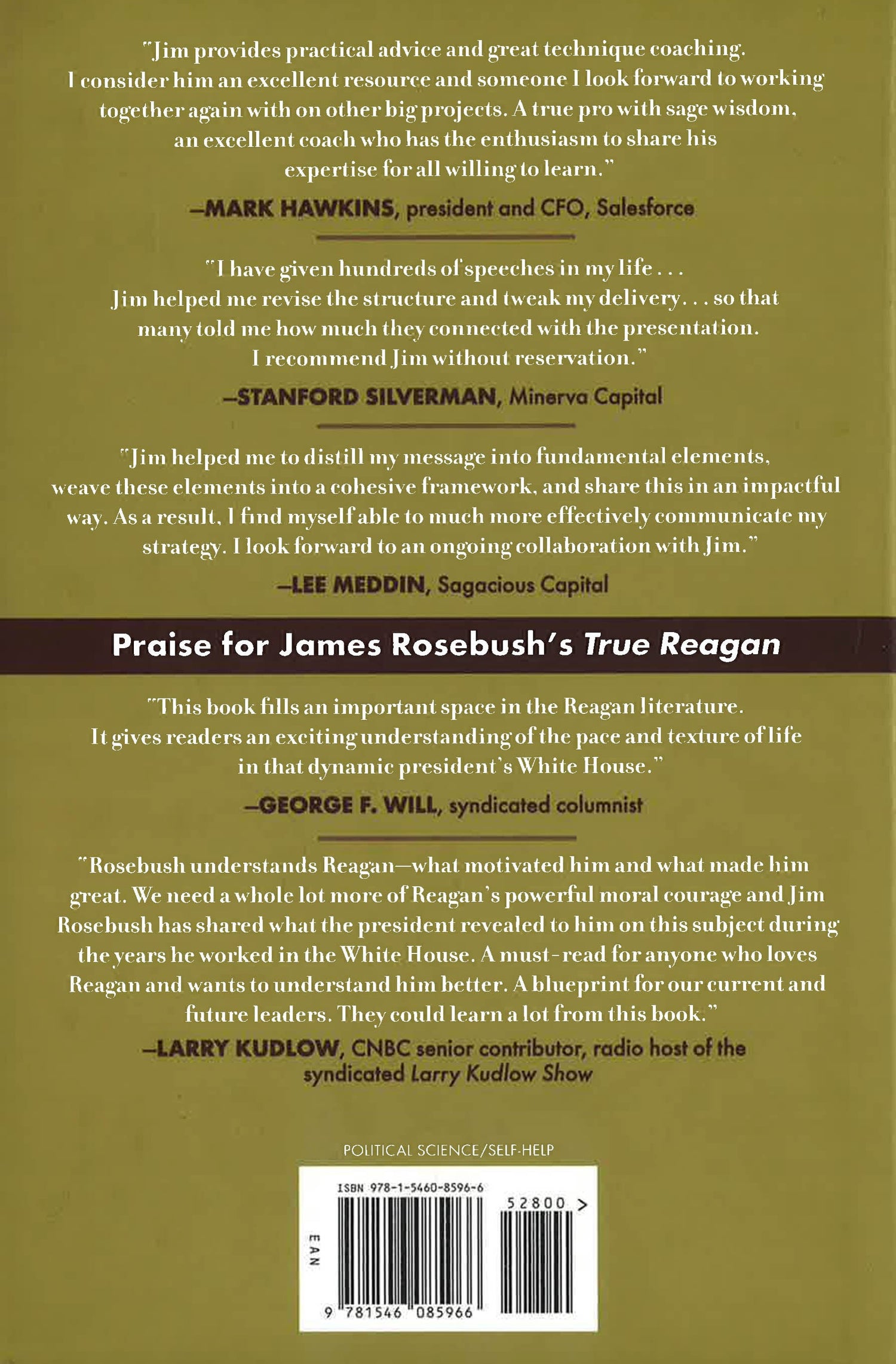 Reagan White House official James Rosebush creates and presents 25 Reagan Rules for becoming a great communicator, each one explored in its own chapter in this book. Not only will he present the rules but he will add anecdotes from Reagan about how these rules worked for him, on the road and in the White House itself. The rules include: Be authentic. Know yourself. Practice and rehearse...and then do it again. Place your product or message in a global context. The Reagan speech template: Question, Inform, Inspire, Ask. Don't care what your mother thinks of you. Master subconscious inhibitors.