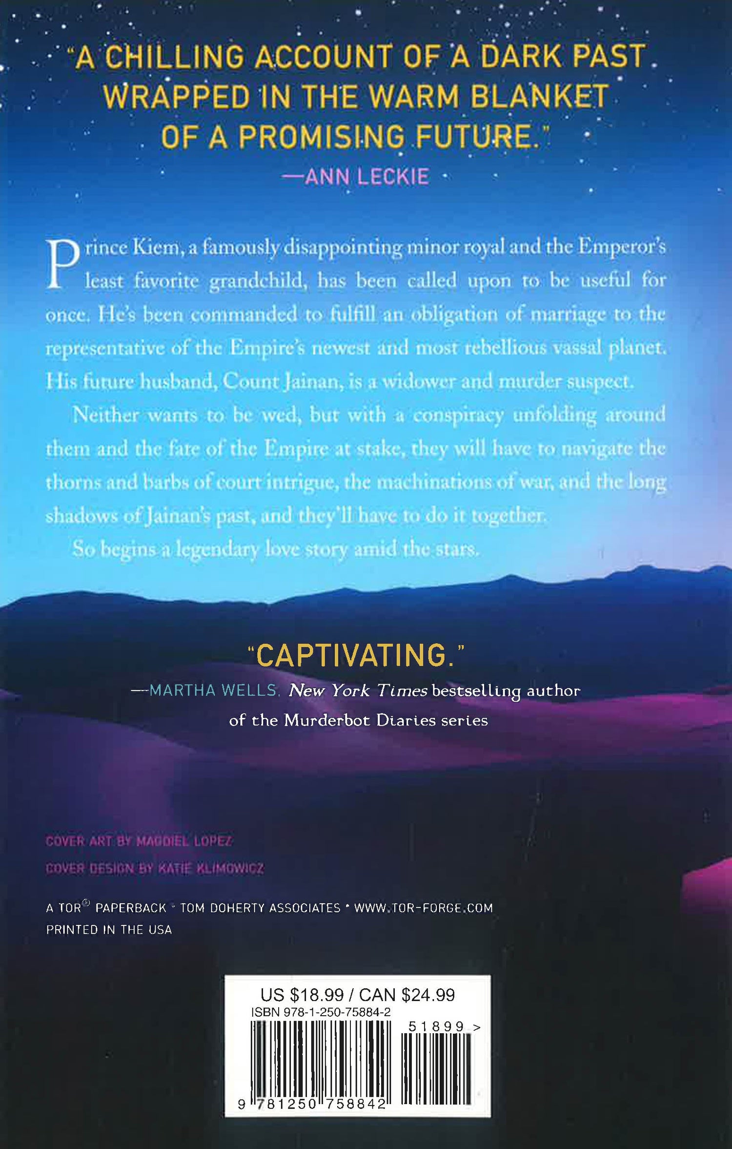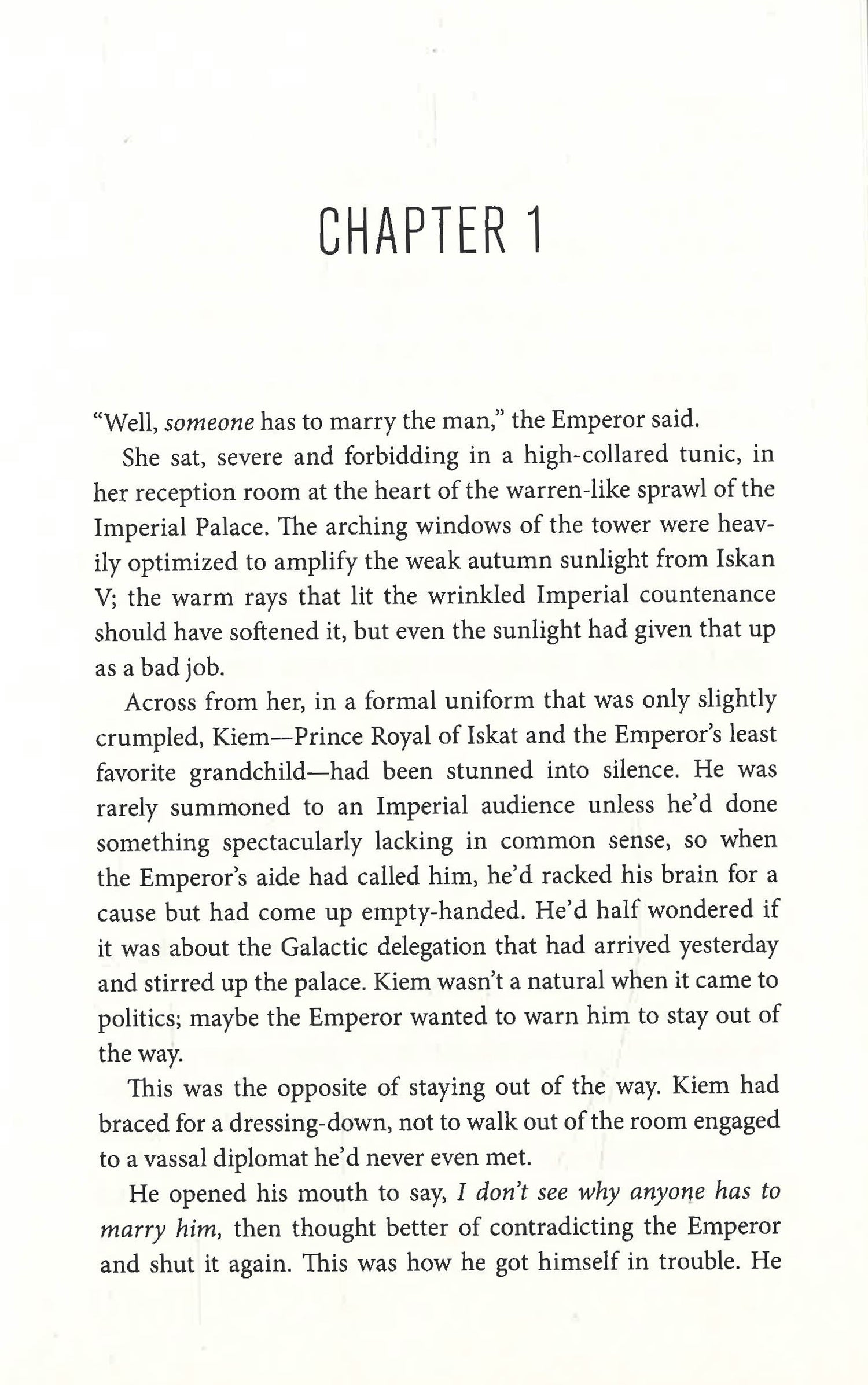 Prince Kiem, a famously disappointing minor royal and the Emperor's least favorite grandchild, has been called upon to be useful for once. He's commanded to fulfill an obligation of marriage to the representative of the Empire's newest and most rebellious vassal planet. His future husband, Count Jainan, is a widower and murder suspect.