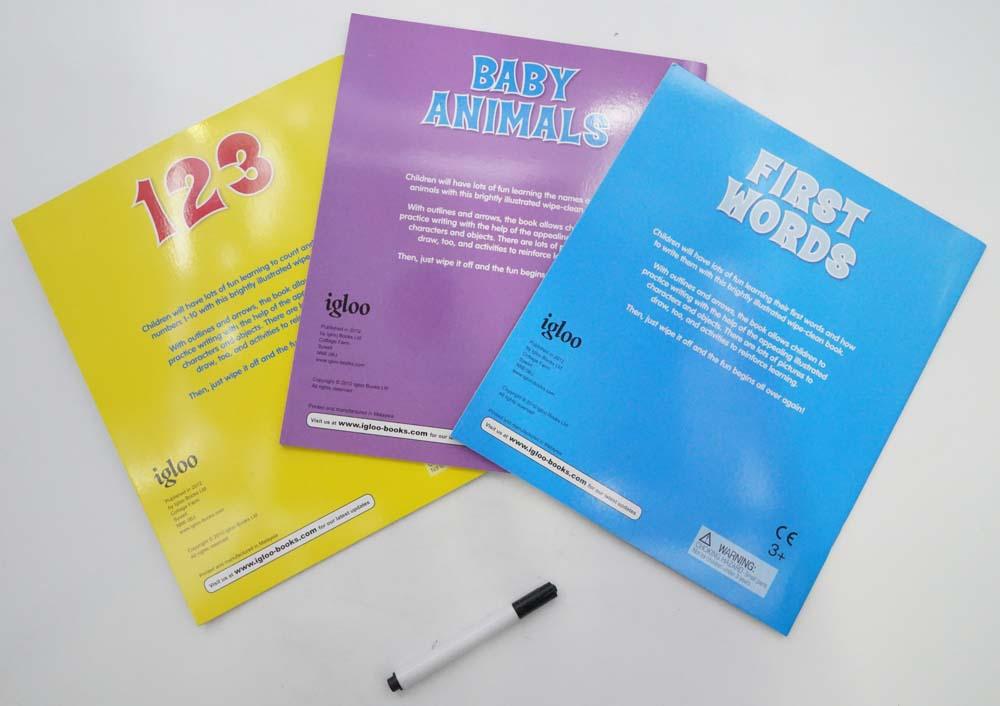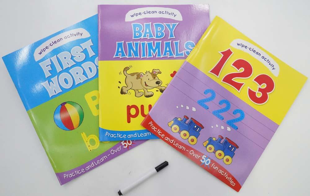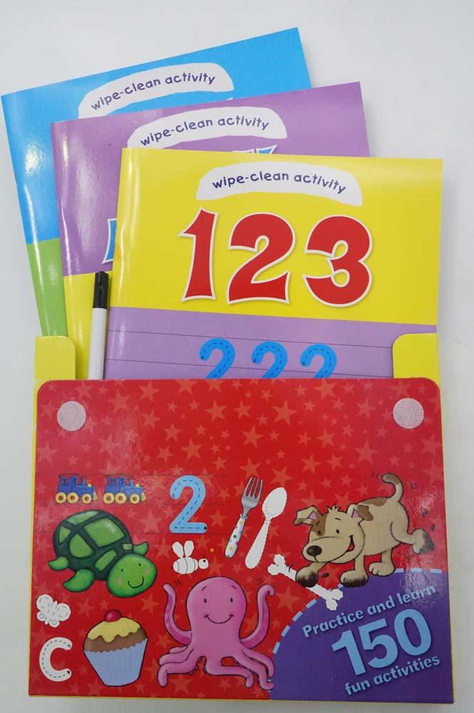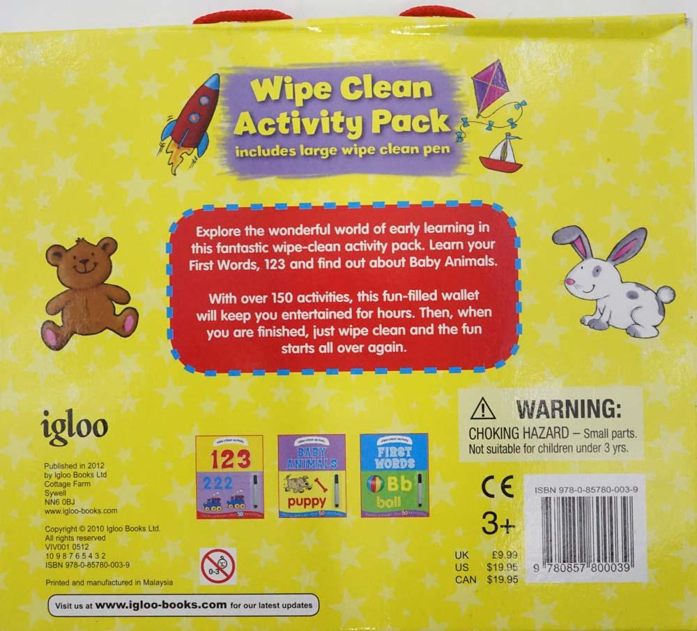 Wipe Clean Activity Pack including large wipe clean pen. Practice and learn 150 fun activities. Explore the wonderful world of early learning in this fantastic wipe-clean activity pack. Learn your First Words, 123 and find out about Baby Animals. With over 150 activities, this fun-filled wallet will keep you entertained for hours. Then, when you are finished, just wipe clean and the fun starts all over again! Ages 3+.