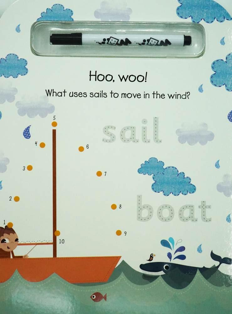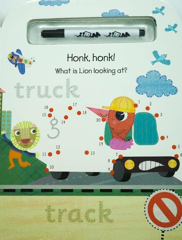 Join the dots to learn key first words and counting in this early learning dot-to-dot board book that features a special pen and wipe-clean pages. Children age 3 and up will love joining the dots to complete words, numbers and pictures of all their favorite things that go including cars, boats, airplanes and more! Join the dots, wipe clean and then use the book again and again!