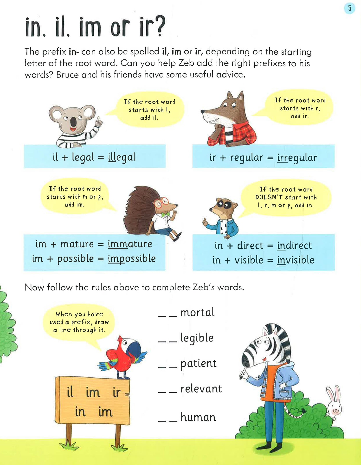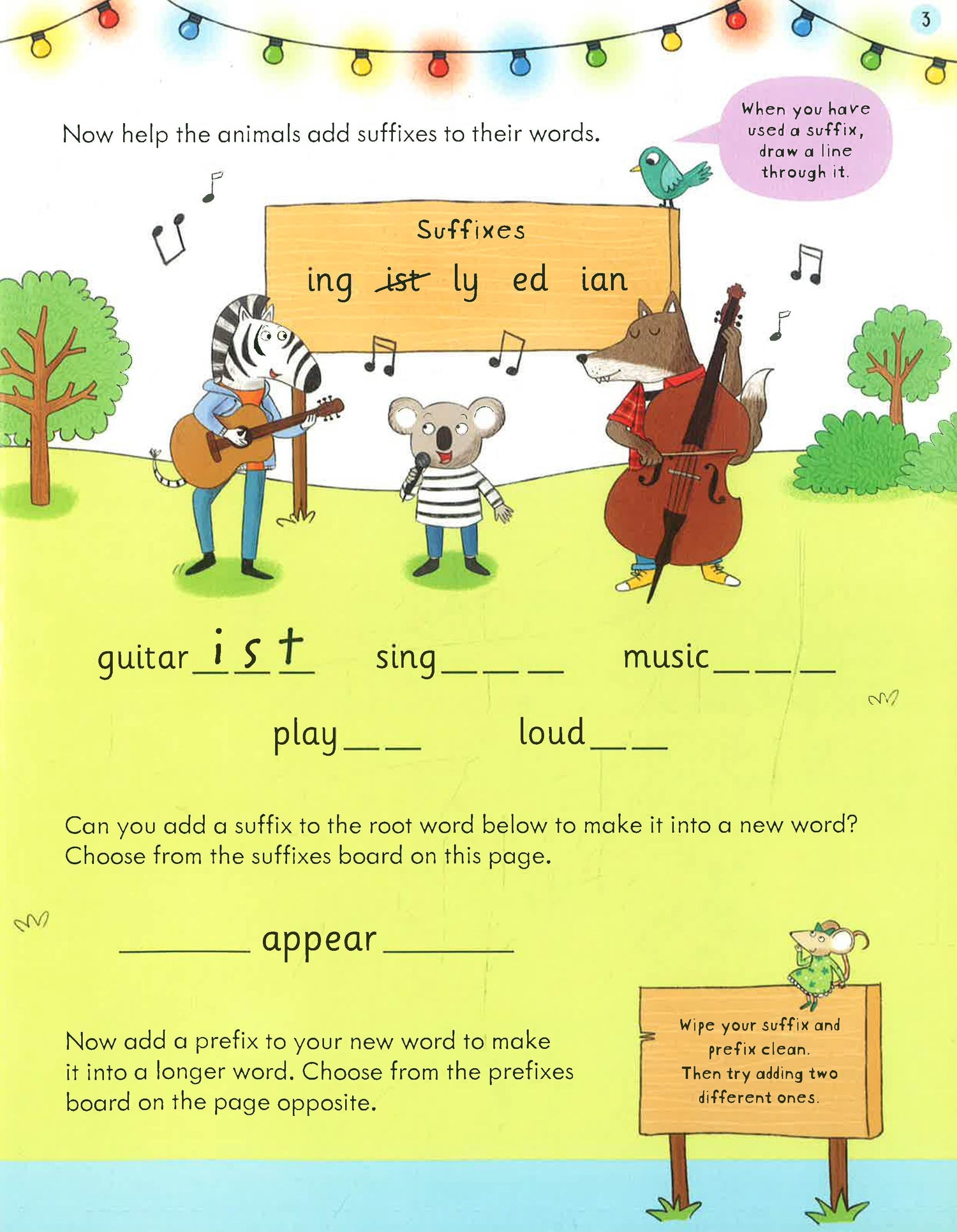 Part of the Usborne Key Skills series that supports the English lessons children learn at school, this entertaining book is filled with prefix and suffix related activities, including making words negative, adding word endings and a spelling quiz. Wipe-clean pages offer endless practice, and answers and secret notes for grown-ups are at the back.