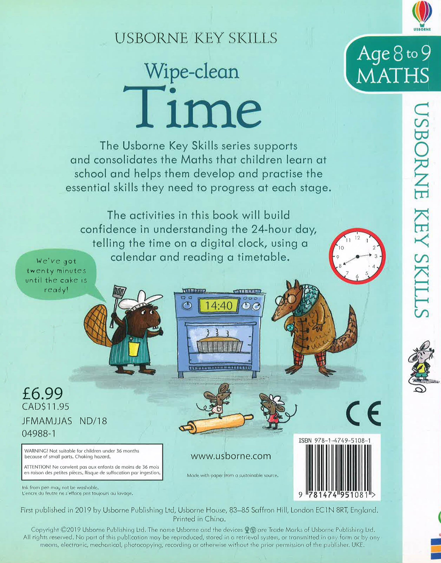 Part of the Usborne Key Skills series that supports the maths lessons children learn at school, this book is filled with activities that build confidence in telling the time on a digital clock, using a calendar and understanding the 24-hour day. Wipe-clean pages offer endless practice, and answers and secret notes for grown-ups are at the back.