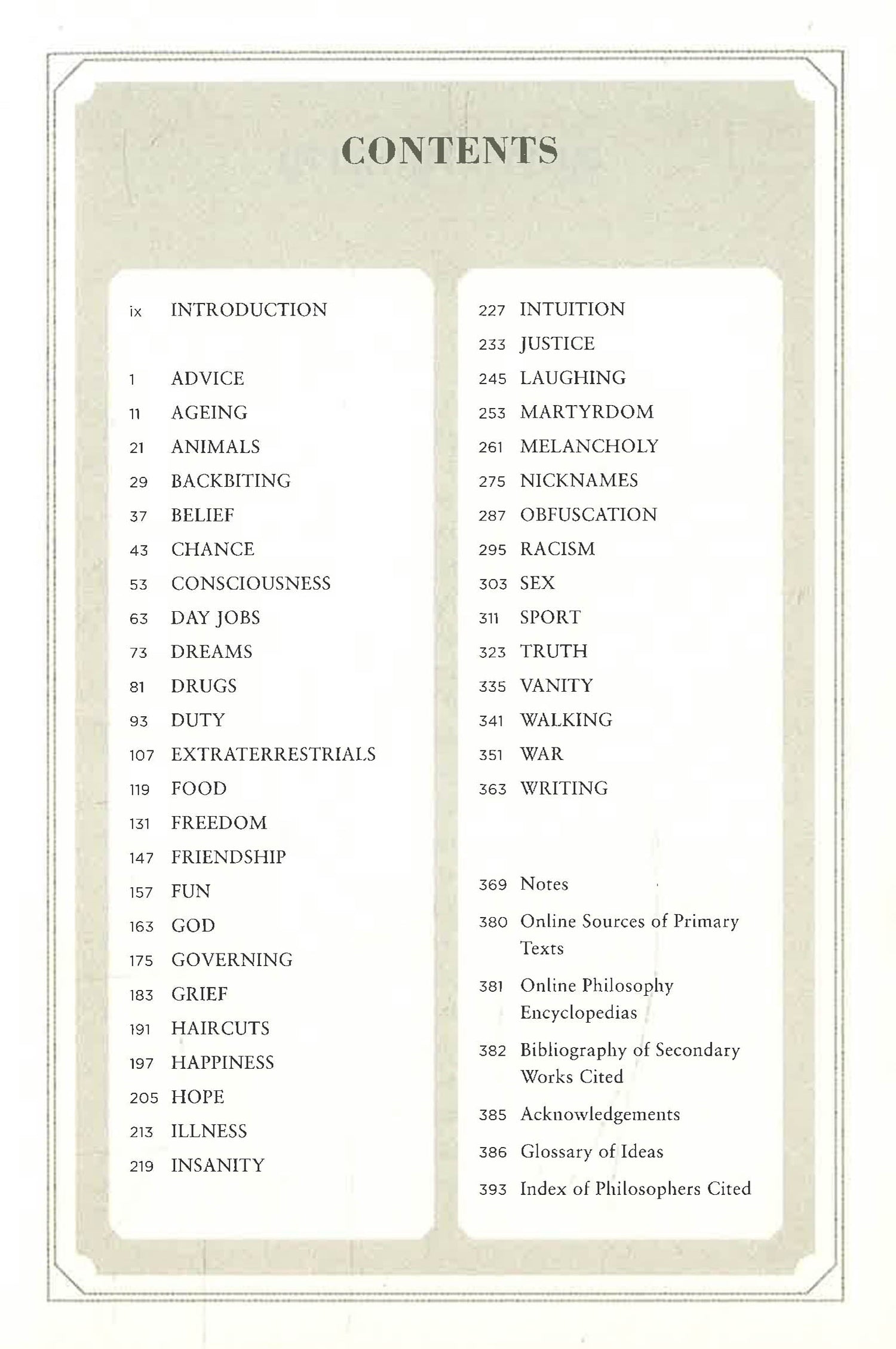 A philosophical miscellany, as diverting as it is instructive, centred on an eclectic sequence of themes, ranging from advice to ageing, from backbiting to bigotry, from freedom to friendship, and from work to walking.
