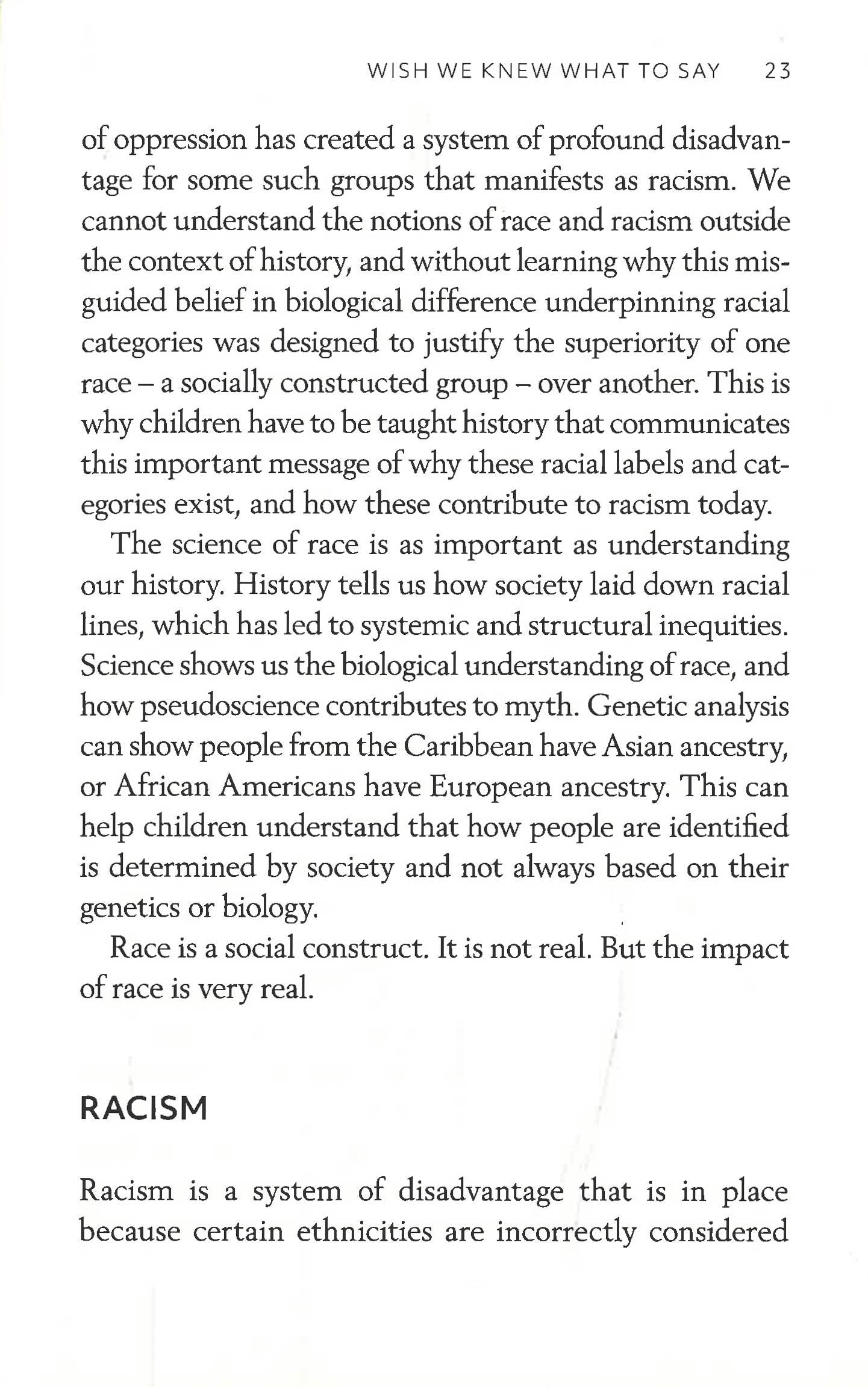 We want our children to thrive and flourish in a diverse, multi-cultural world and we owe it to them to help them make sense of the confusing and emotionally charged messages they receive about themselves and others. These early years are the most crucial when children are curious about the world around them, but are also quick to form stereotypes and biases that can become deeply ingrained as they grow older. These are the people who are going to inherit this world, and we owe it to them to lay a strong foundation for the next phases of their lives. Wish We Knew What to Say is a timely and urgent book that gives scenarios, questions, thought starters, resources and advice in an accessible manner on how to tackle tricky conversations around race and racism with confidence and awareness. it brings in the science of how children perceive race and form racial identity, combining it with personal stories and experiences to create a handy guide that every parent would refer to again and again.