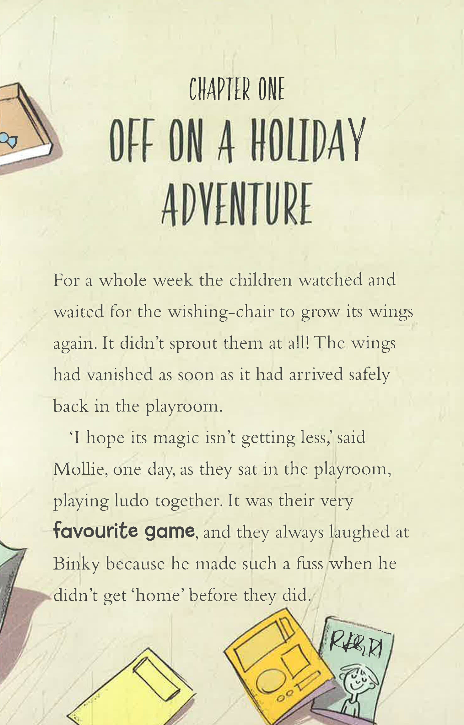 A full-colour short story taken from the magical Wishing-Chair series. Perfect for new readers. Be whisked away! When Mollie and Peter go to buy their mother a birthday present, they discover the most extraordinary thing: a chair that can fly and grant wishes! And on a stiflingly hot summer day in the playroom, what better adventure to have than to fly high above the mountains and seaside in search of the Land of Goodness Knows Where!