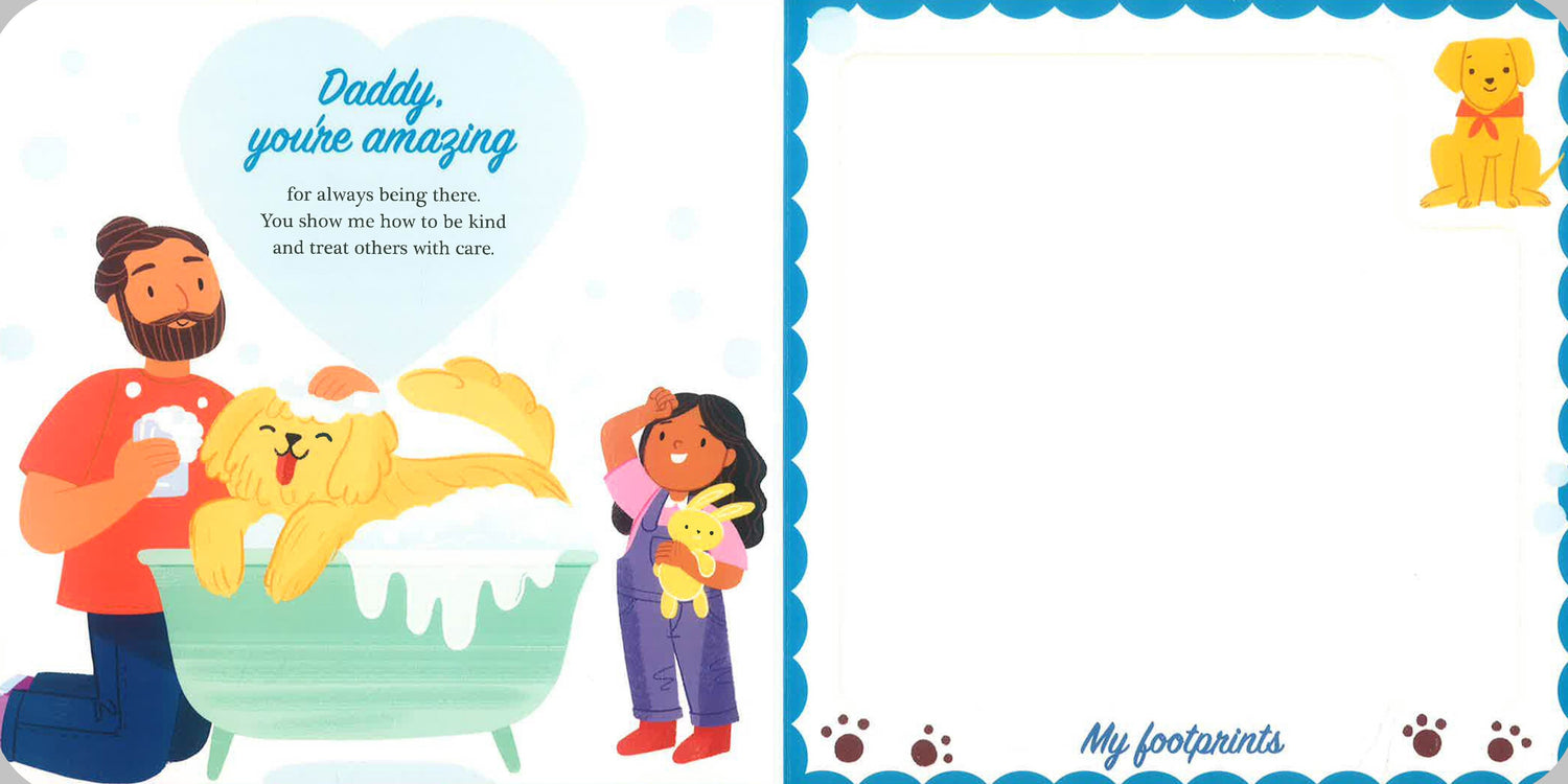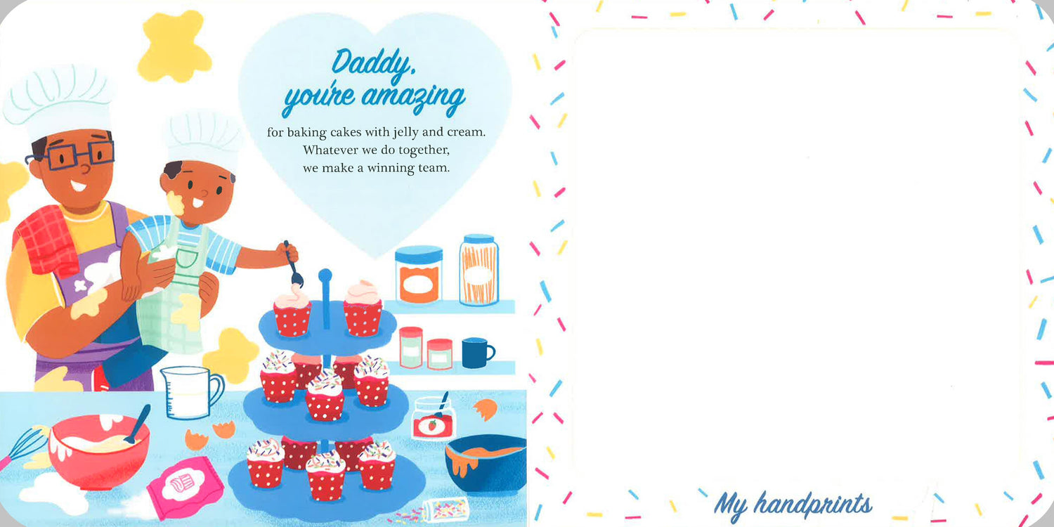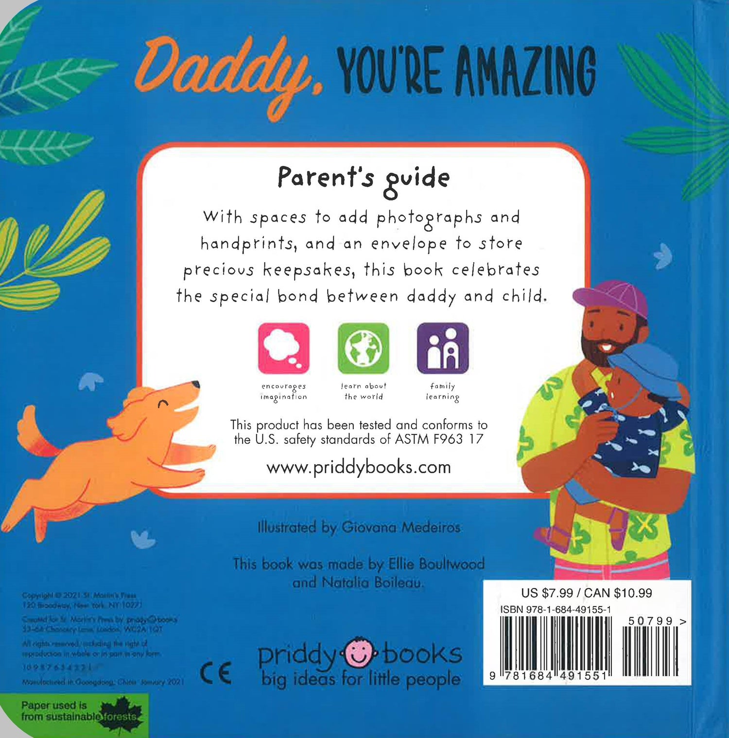 Filled with gentle rhyming text and charming illustrations which show all reasons why children thinks that their daddy is amazing, this unique keepsake book is the perfect gift to share. With a space to add handprints, a built-in envelope to store special trinkets and die-cut frames to add photos, this book can be fully personalized to create a memory story book to truly cherish.