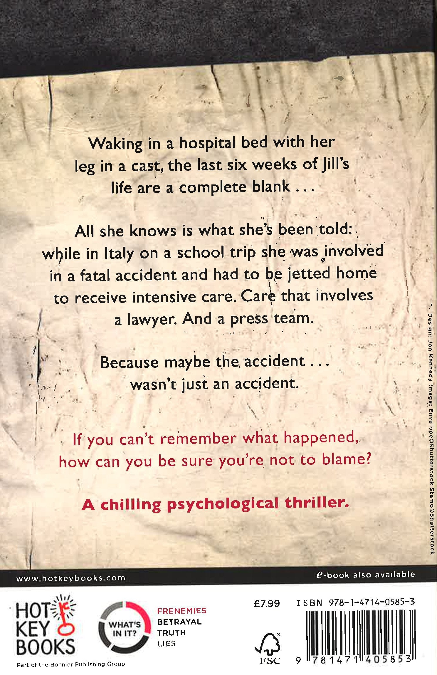 Waking in a hospital bed with her leg in a cast,the last six weeks of Jill's life are a complete blank? All she knows is what she's been told : while in Italy on a school trip she was involved in a fatal accident and had to be jetted home to receive intensive care.Care that involves a lawyer. And a press team. Because maybe the accident..wasn't just an accident.