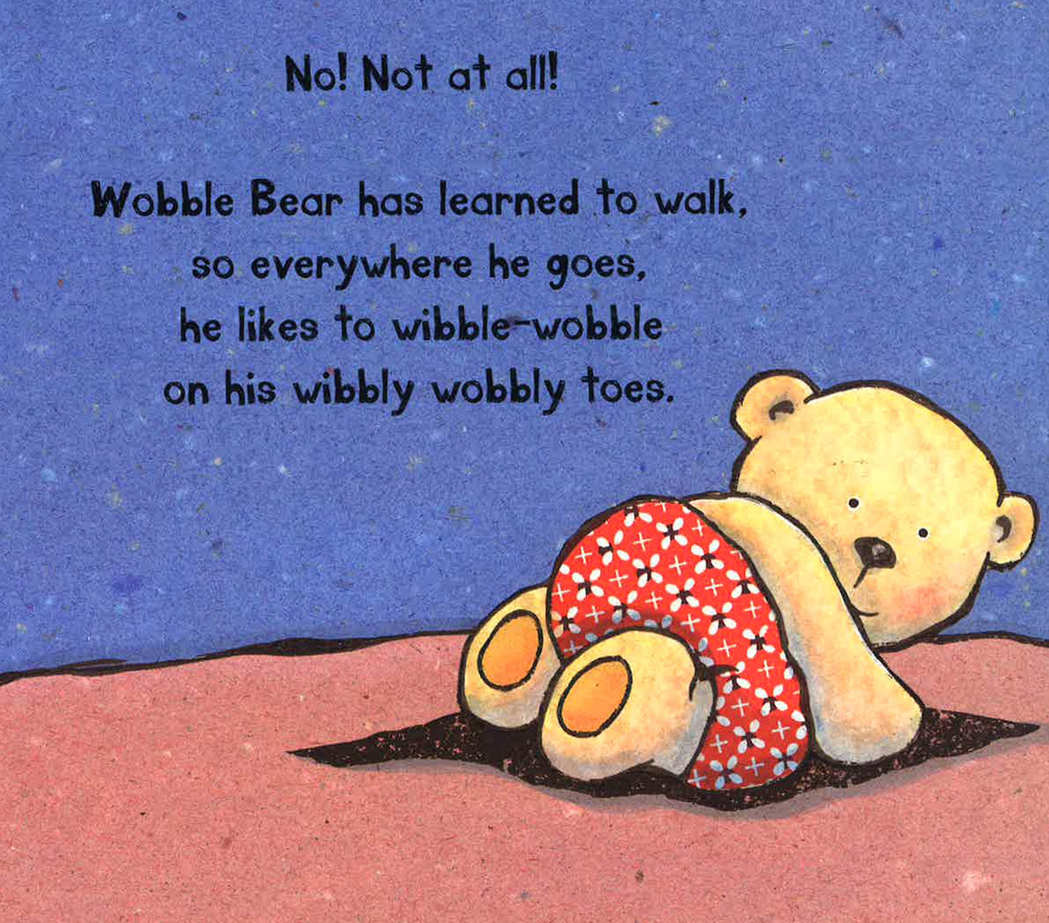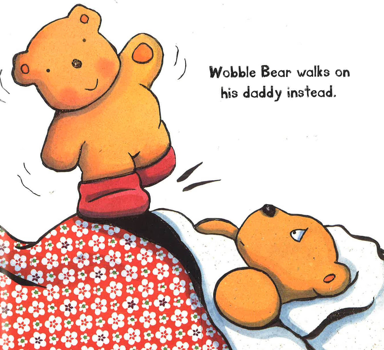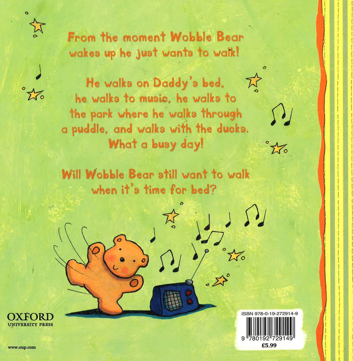 Wobble Bear has just learnt to walk on his wibbly, wobbly toes. His crawling days are over and he walks and walks and walks all through the day. Even when he goes to the park, Wobble walks on the see-saw and walks down the slide - it's exhausting just watching him! So it's really no surprise that when bedtime comes Wobble Bear has finally run out of energy and he whispers to Mummy, 'Can't walk, too tired, carry me up to bed.'