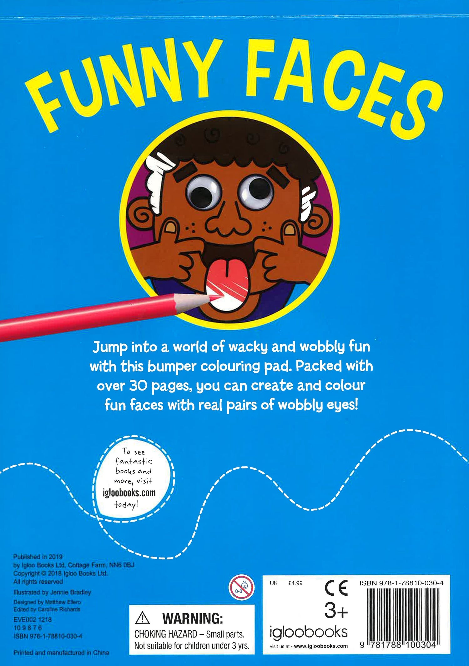 Jump into a world of wacky and wobbly fun with this bumper colouring pad. Packed with over 30 pages, you can create and colour fun faces with real pairs of wobbly eyes!