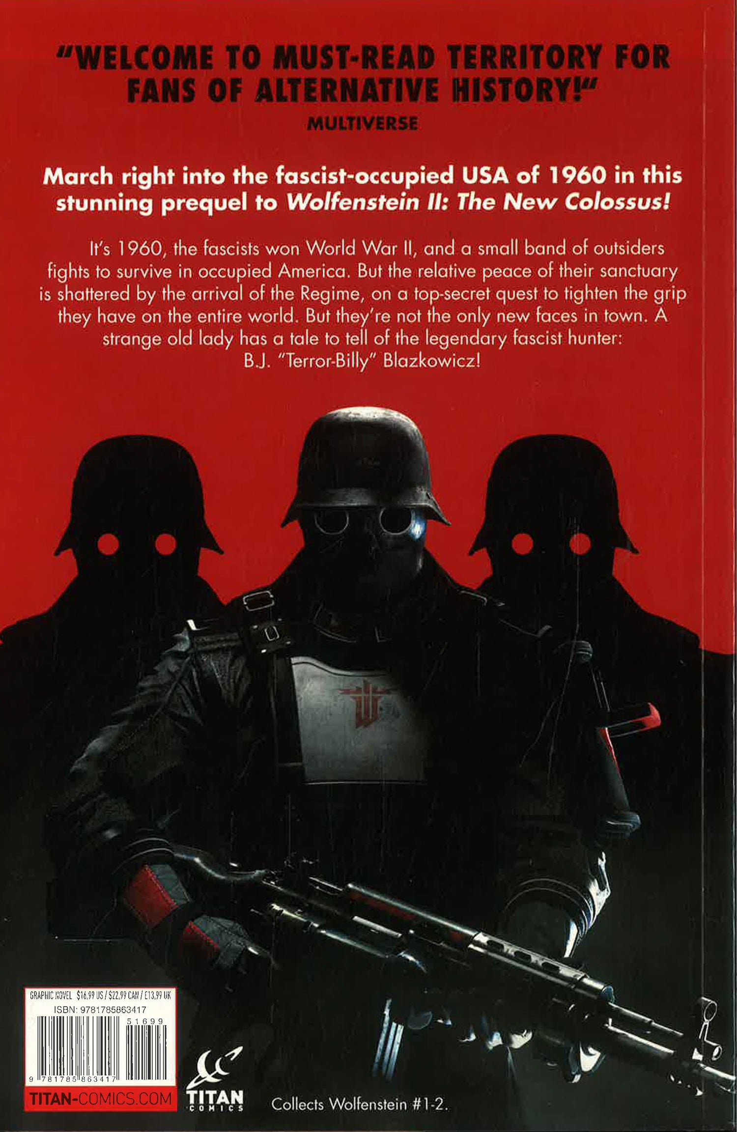 March right into fascist occupied America of 1960. It's 1960, the Regime won the war, and a small band of outsiders fight to survive in occupied America. But the relative peace of their sanctuary is shattered by the arrival of fascists on the hunt for some top-secret quarry. But they're not the only new faces. A strange old lady has a tale to tell of the legendary fascist hunter - B.J "Terror Billy" Blazkowicz.