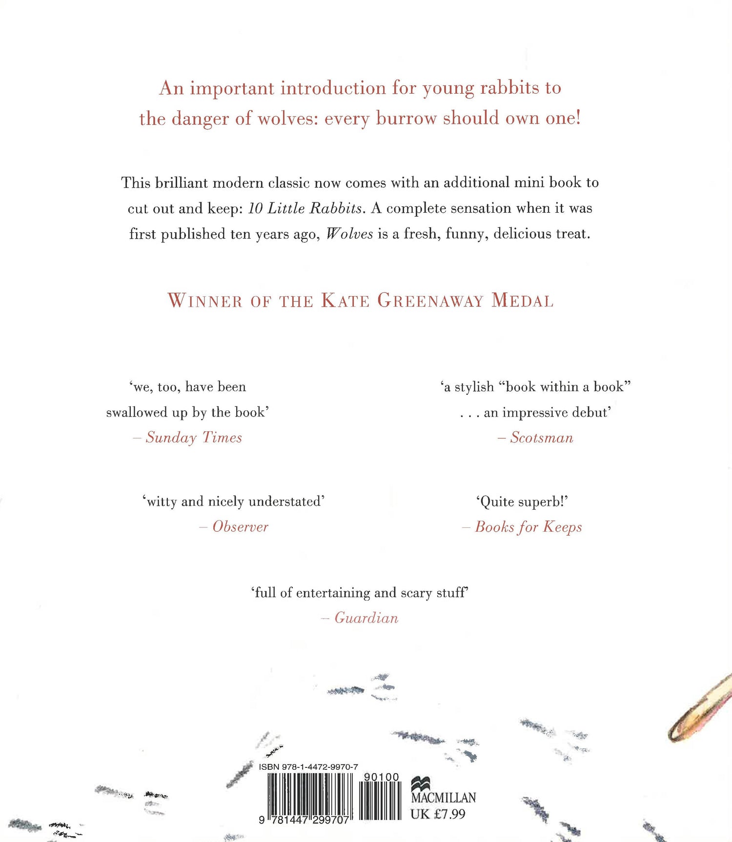 Rabbit borrows a book about wolves from the library. He can't put it down! But soon a sinister figure with sharp claws and a bushy tail starts to creep right off the pages. You won't believe your eyes - but if you're a rabbit, you probably should.Brilliantly witty, ingeniously constructed, and with amazing artwork throughout, Wolves has thrilled critics and booksellers alike. Wolves was Emily Gravett's debut book, and with it she won both the Macmillan Prize for Illustration and her first Kate Greenaway Award. Wolves 10th Anniversary Edition celebrates the inventiveness and beauty that made the original such a classic. It features an additional mini book to cut out and keep; it's called 10 Little Rabbits, and it's Wolf's favourite book . . .