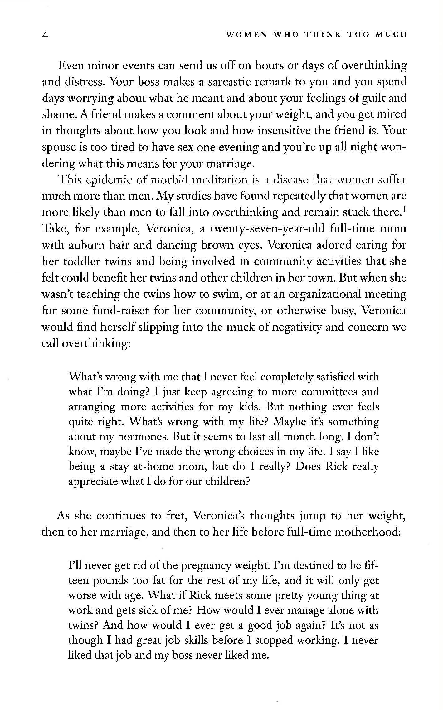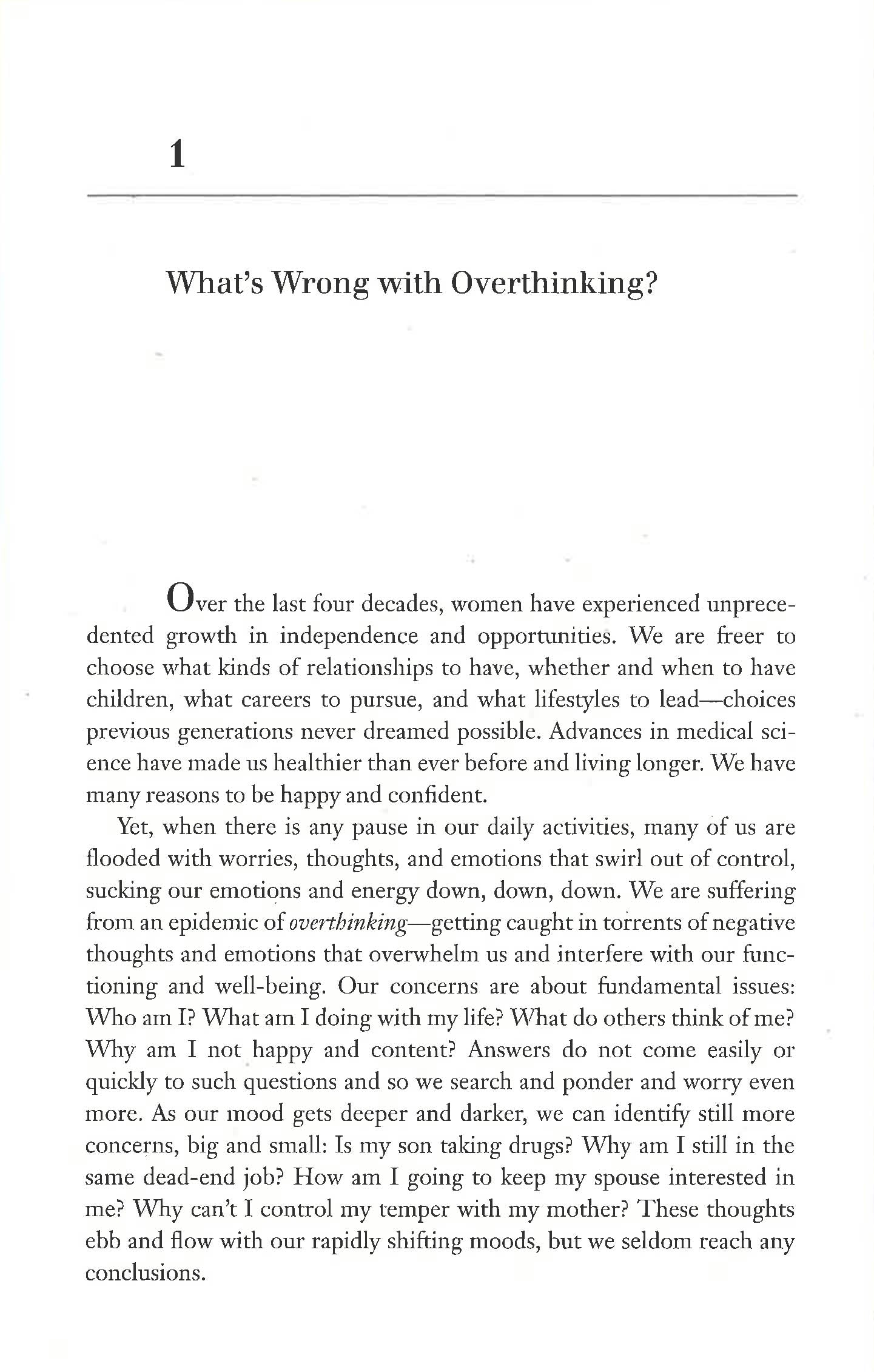 In the last few decades many psychologists have encouraged the view that constantly analysing and expressing our emotions is a good thing. Dr Susan Nolen-Hoeksema challenges this assumption in her breakthrough new book on conquering negative thinking. Encouraged by a fast-paced, self analytical culture, women often spend countless hours dwelling on negative ideas, feelings and experiences. Dr Nolen-Hoeksema calls this 'overthinking' and her groundbreaking research shows that an increasing number of women are doing this too much and too often, hindering their ability to effectively deal with problems and lead a satisfying life. Discover What 'overthinking' is and what causes it Why women are particularly prone to negative thinking Techniques for overcoming overthinking and finding real solutions to problems Problem areas which cause us to think negatively - and what to do about them Clearly and engagingly written, and packed with case studies and examples, Women Who Think Too Much will change lives and is destined to become a self-help classic.