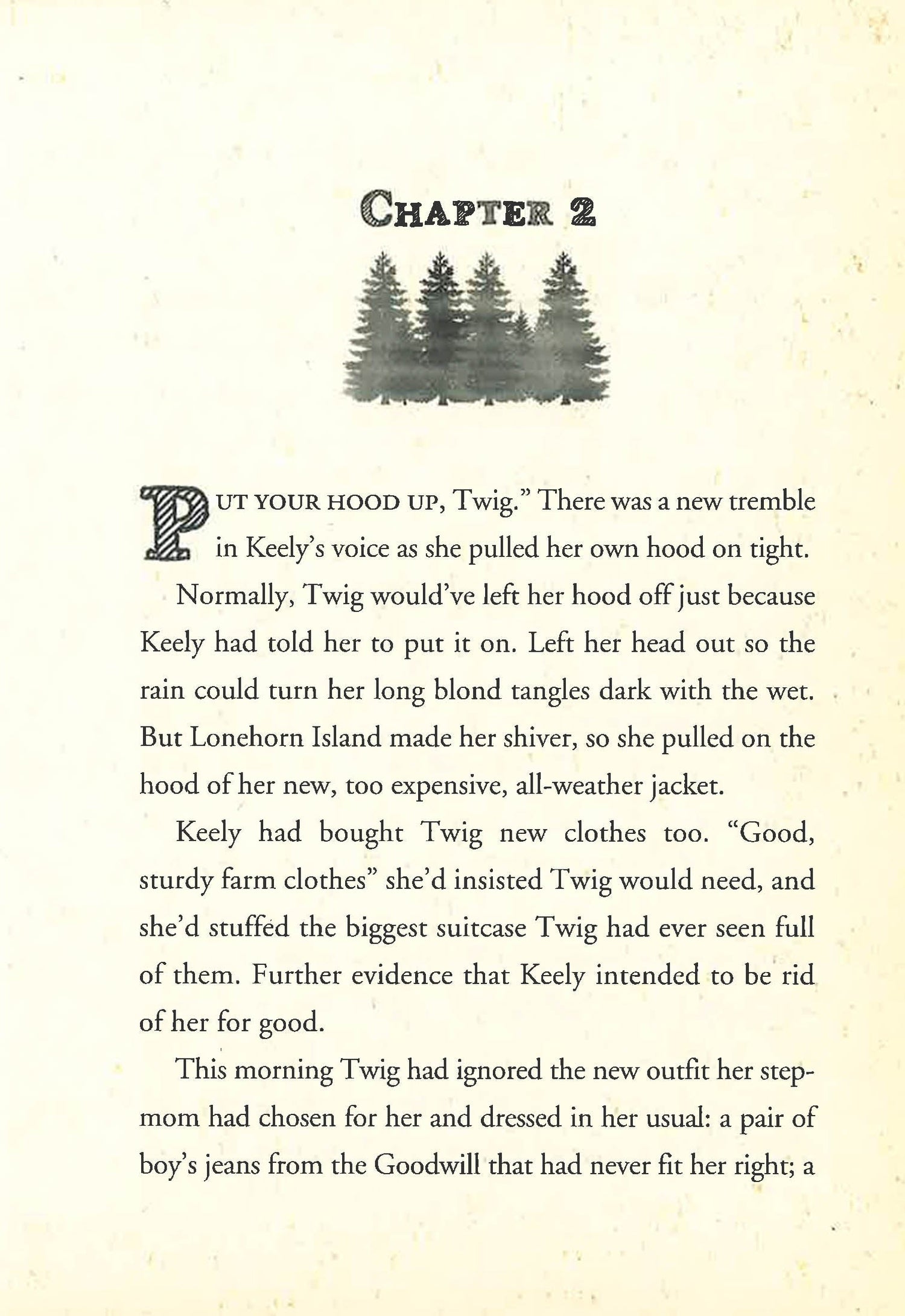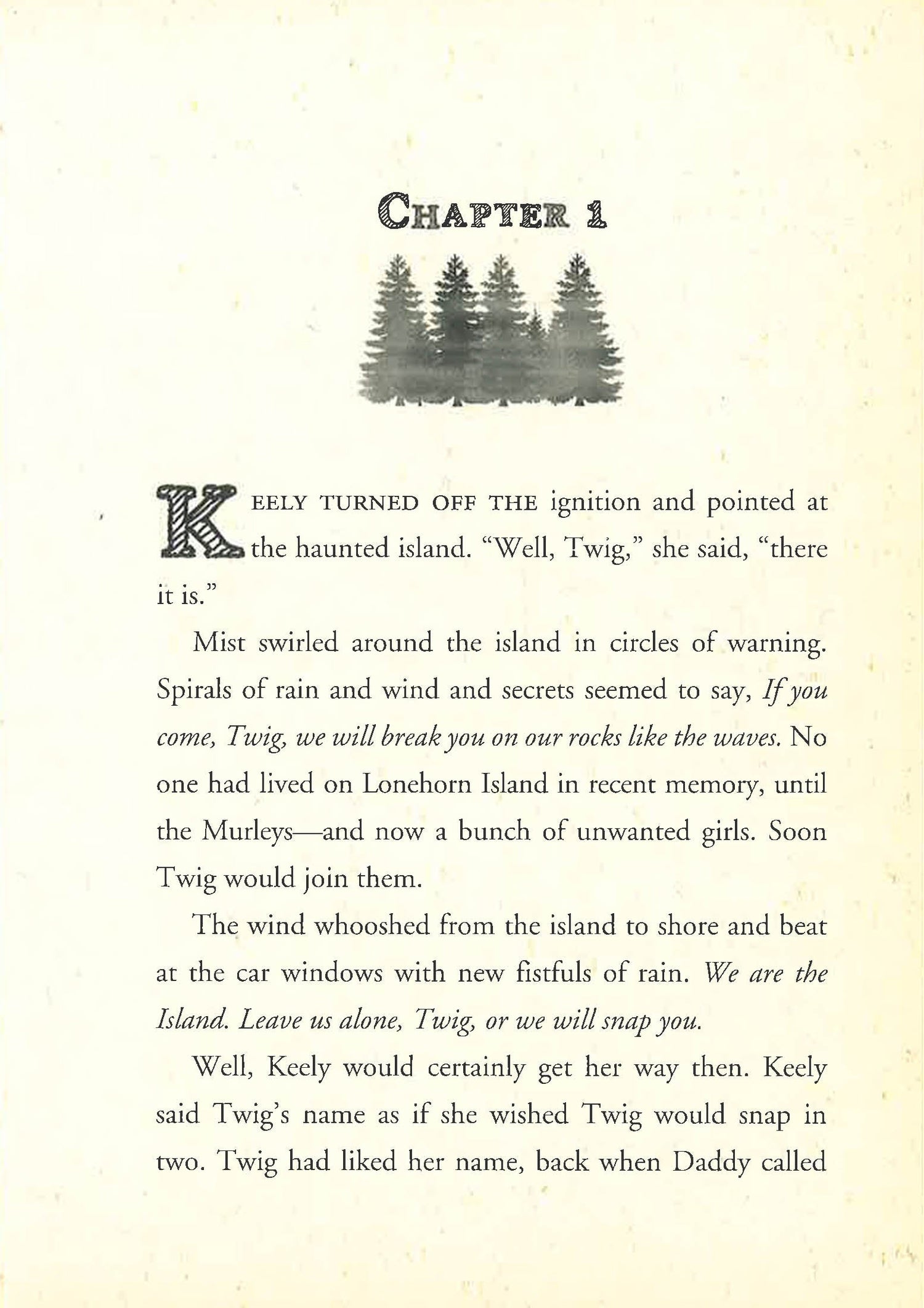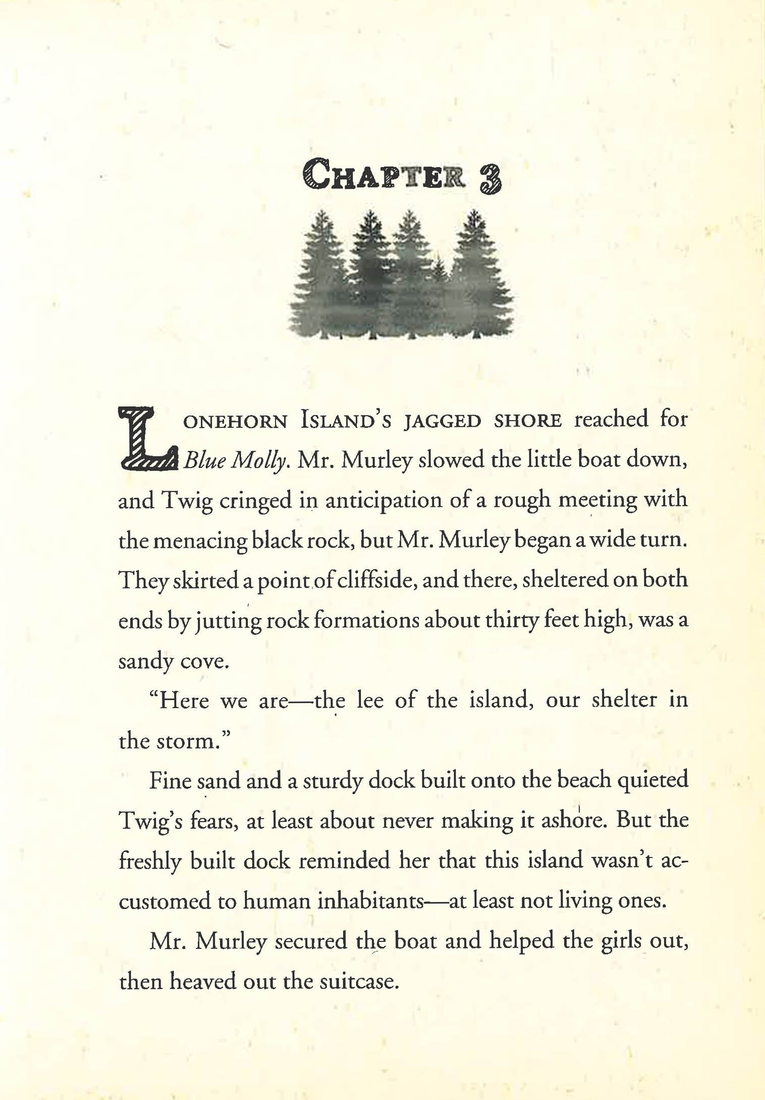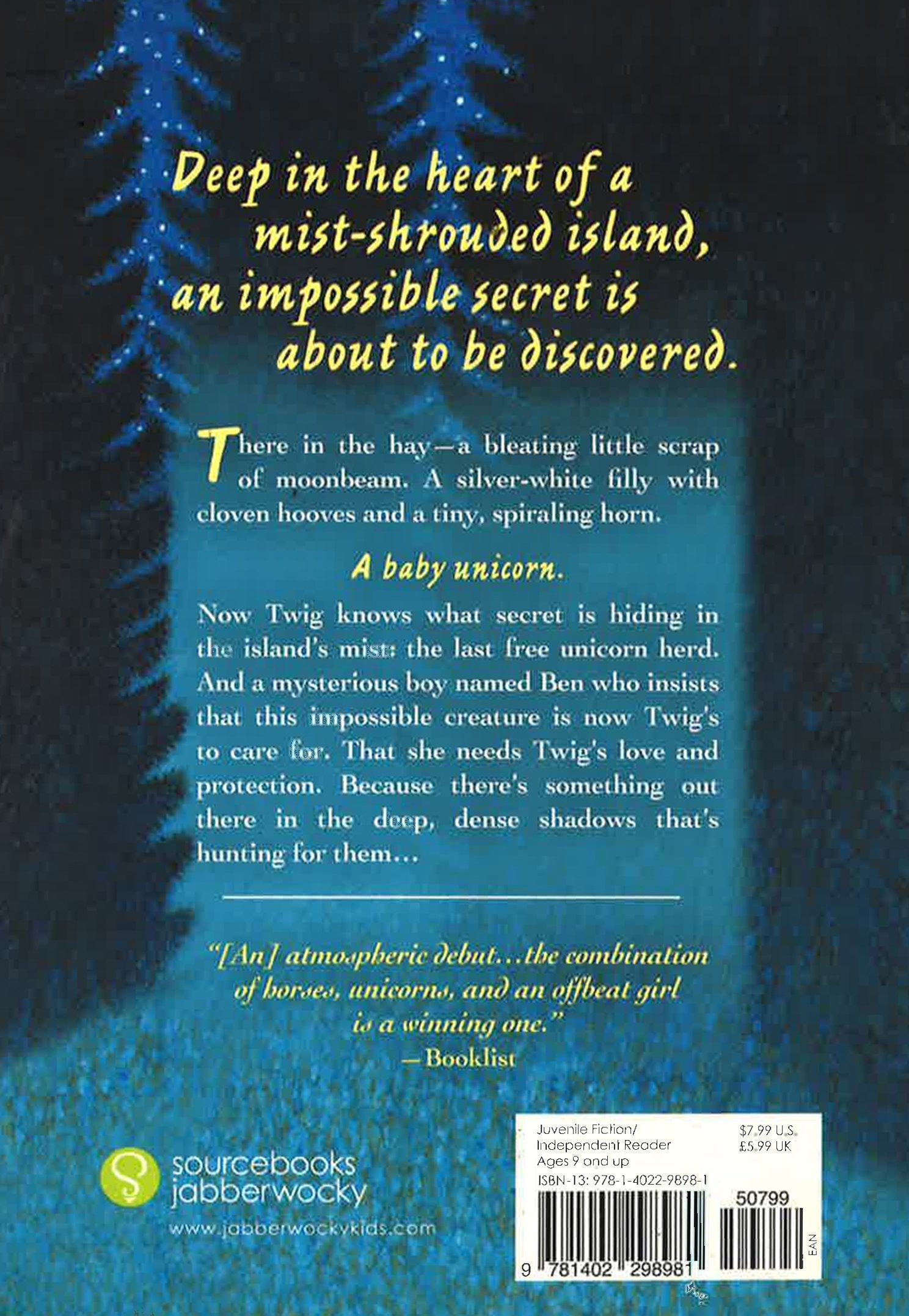 Deep in the heart of a mist-shrouded island, an impossible secret is about to be discovered. Twig is used to feeling unwanted. Sent to live on a pony ranch for "troubled" girls on a misty, haunted island, Twig is about to discover the impossible -- someone who needs her. Jolted awake from a bad dream, Twig follows the desperate whinny of a terrified horse out to the stables. There in the straw is a bleating little scrap of moonbeam. A silver-white filly with cloven hooves and a tiny, spiraling horn. A baby unicorn. Now Twig knows what secret is hiding in the island's mist: the last free unicorn herd. And a mysterious boy named Ben who insists that this impossible creature is now Twig's to care for. That she needs Twig's love and protection. Because there's something out there in the deep, dense shadows that's hunting for them...