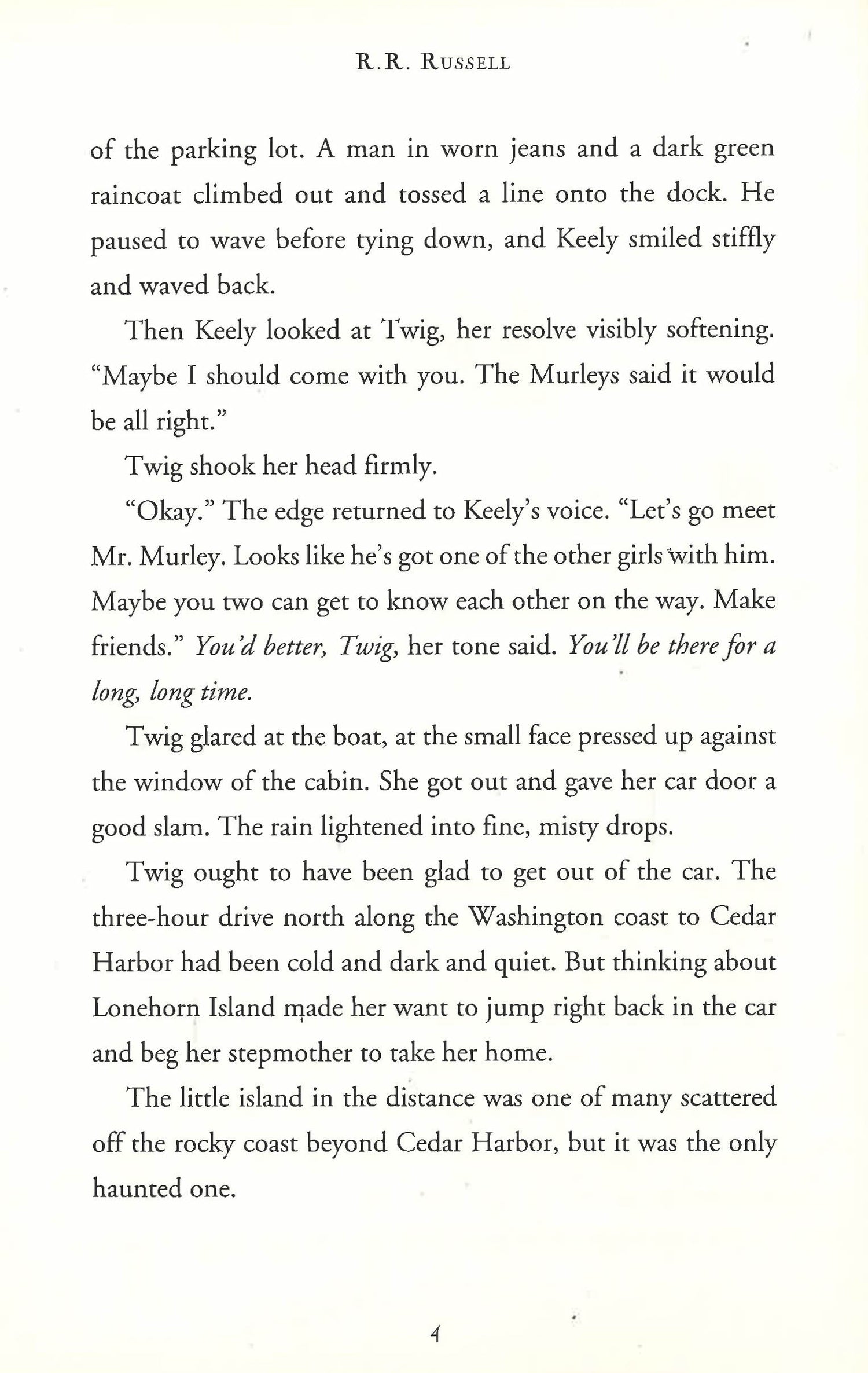Deep in the heart of a mist-shrouded island, an impossible secret is about to be discovered. Twig is used to feeling unwanted. Sent to live on a pony ranch for ?troubled? girls on a misty, haunted island, Twig is about to discover the impossible -- someone who needs her. Jolted awake from a bad dream, Twig follows the desperate whinny of a terrified horse out to the stables. There in the straw is a bleating little scrap of moonbeam. A silver-white filly with cloven hooves and a tiny, spiraling horn. A baby unicorn. Now Twig knows what secret is hiding in the island?s mist: the last free unicorn herd. And a mysterious boy named Ben who insists that this impossible creature is now Twig?s to care for. That she needs Twig?s love and protection. Because there?s something out there in the deep, dense shadows that?s hunting for them? ?R. R. Russell?s Wonder Light dares to explore a world where unicorns are creatures of wonder and power, and girls can find both strength and courage to be themselves.? -Robin Hobb, International bestselling author