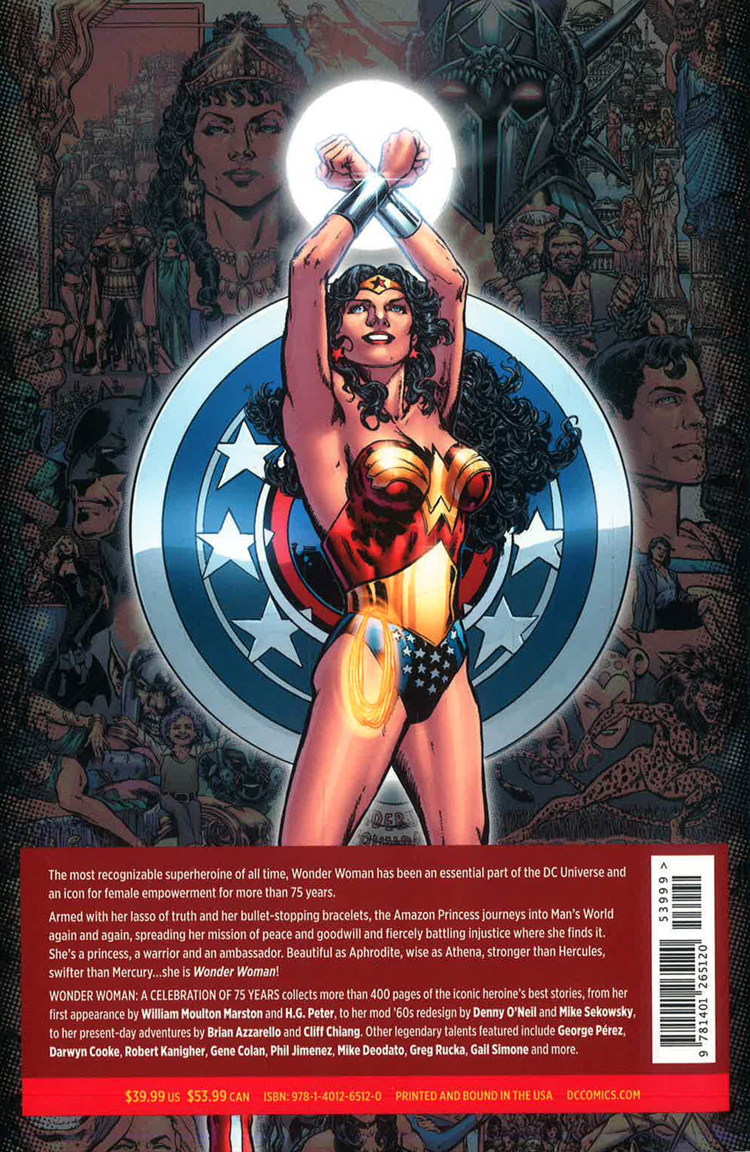 WONDER WOMAN: A CELEBRATION OF 75 YEARS collects more than 400 pages of the iconic heroine’s best stories, from her first appearance by William Moulton Marston and H.G. Peter, to her mod ’60s redesign by Denny O’Neil and Mike Sekowsky, to her present-day adventures by Brian Azzarello and Cliff Chiang. Other legendary talents featured include George Pérez, Darwyn Cooke, Robert Kanigher, Gene Colan, Phil Jimenez, Mike Deodato, Greg Rucka, Gail Simone and more.