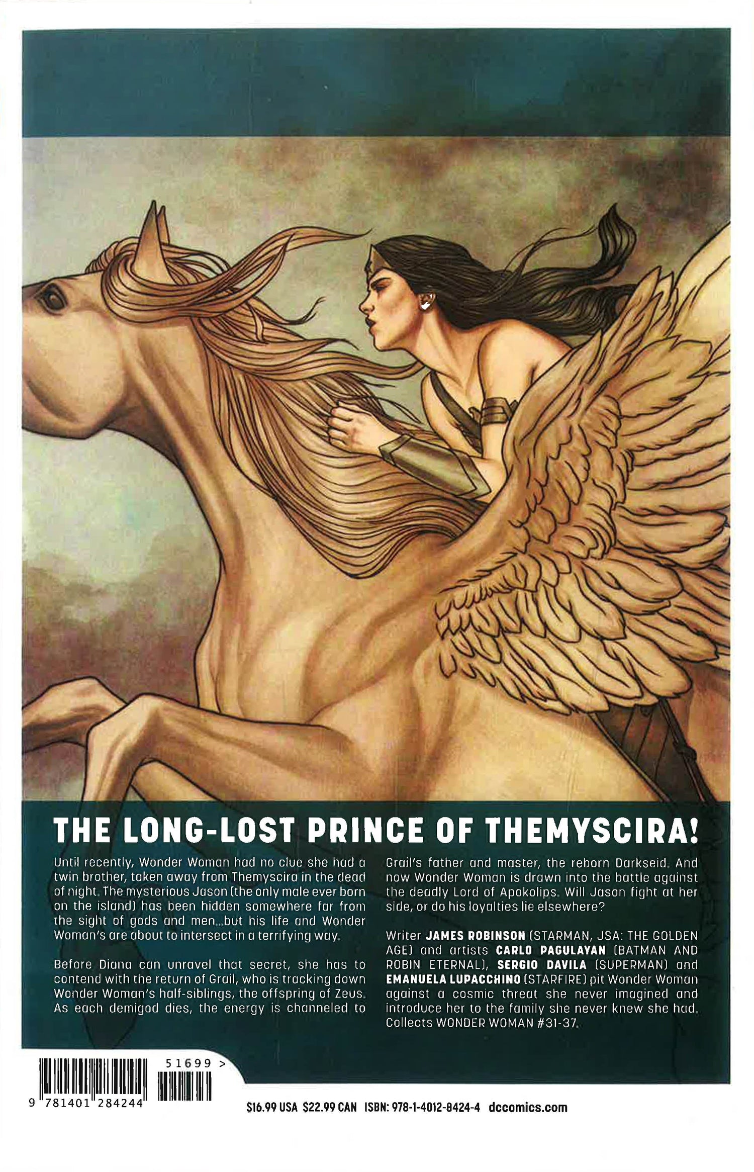 Spinning out of the pages of DC Universe: Rebirth and Justice League: Darkseid War, legendary writer James Robinson (JSA: The Golden Age, Starman) comes on board to answer one of the biggest questions of the year: Who is Wonder Woman's brother? Taken away from Themyscira in the dead of night, the mysterious Jason has been hidden somewhere far from the sight of gods and men...but his life and Wonder Woman's are about to intersect in a terrifying way, bringing them face to face with a cosmic threat they never imagined! From superstar writer James Robinson and artist Carlo Pagulayan comes the next great Wonder Woman epic in Wonder Woman Vol. 6: Children of the Gods! Collects Wonder Woman #31-37.