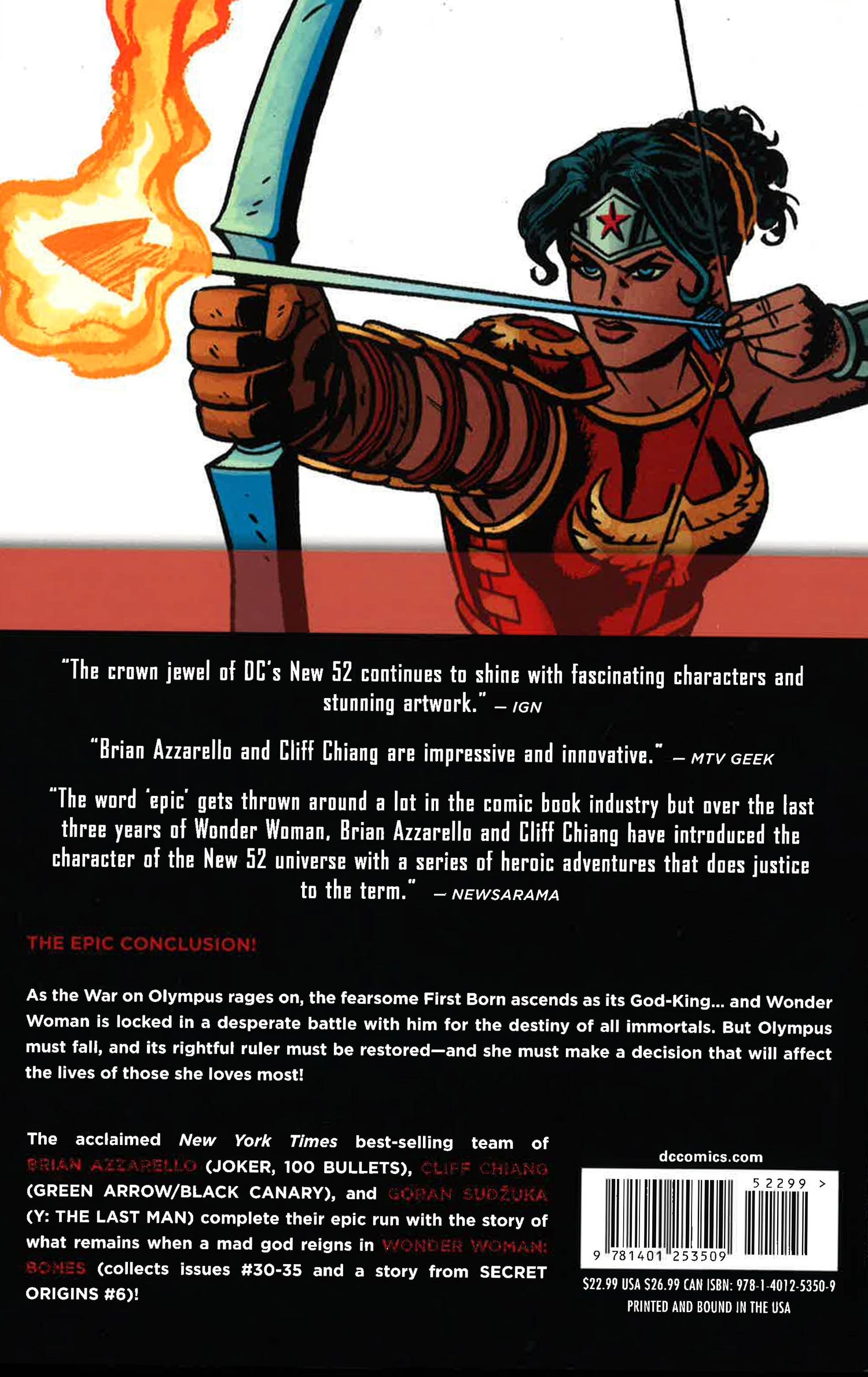 It's the beginning of the end as writer Brian Azzarello and artist Cliff Chiang kick off the astonishing finale of their epic run! Olympus must fall, and its rightful ruler must be restored. Wonder Woman is locked in a desperate battle with the First Born with the destiny of immortals at stake--and she must make a decision that will effect the lives of those she loves most. Collects WONDER WOMAN #30-34, and SECRET ORIGINS #6.