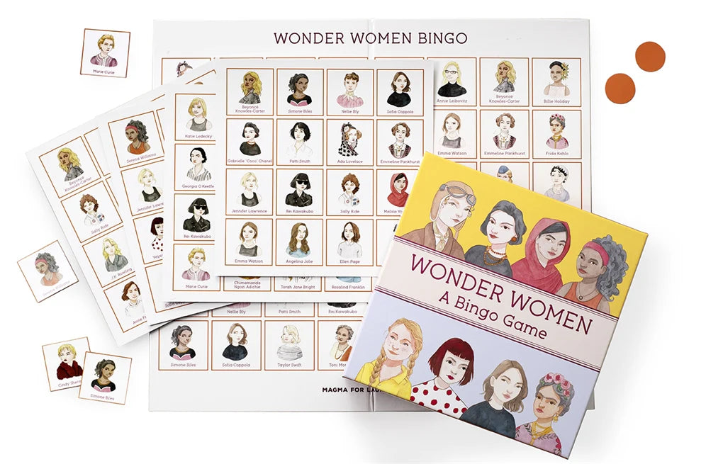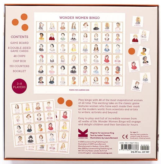Wonder Women Bingo contains 48 illustrated chips, game board, eight double-sided bingo cards, counters for you to mark up your card and an illustrated booklet with short bios about each of these inspirational women.An easy-to-play bingo game for children and familiesFeatures 48 inspiring women from all over the worldIncludes 8 double-sided game boards so can be played many times over by up to eight players