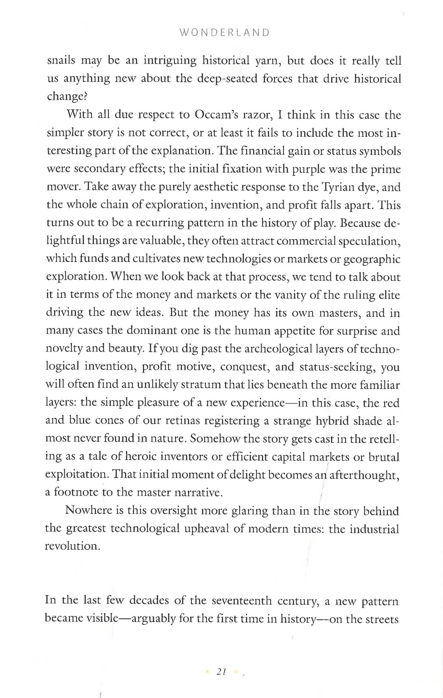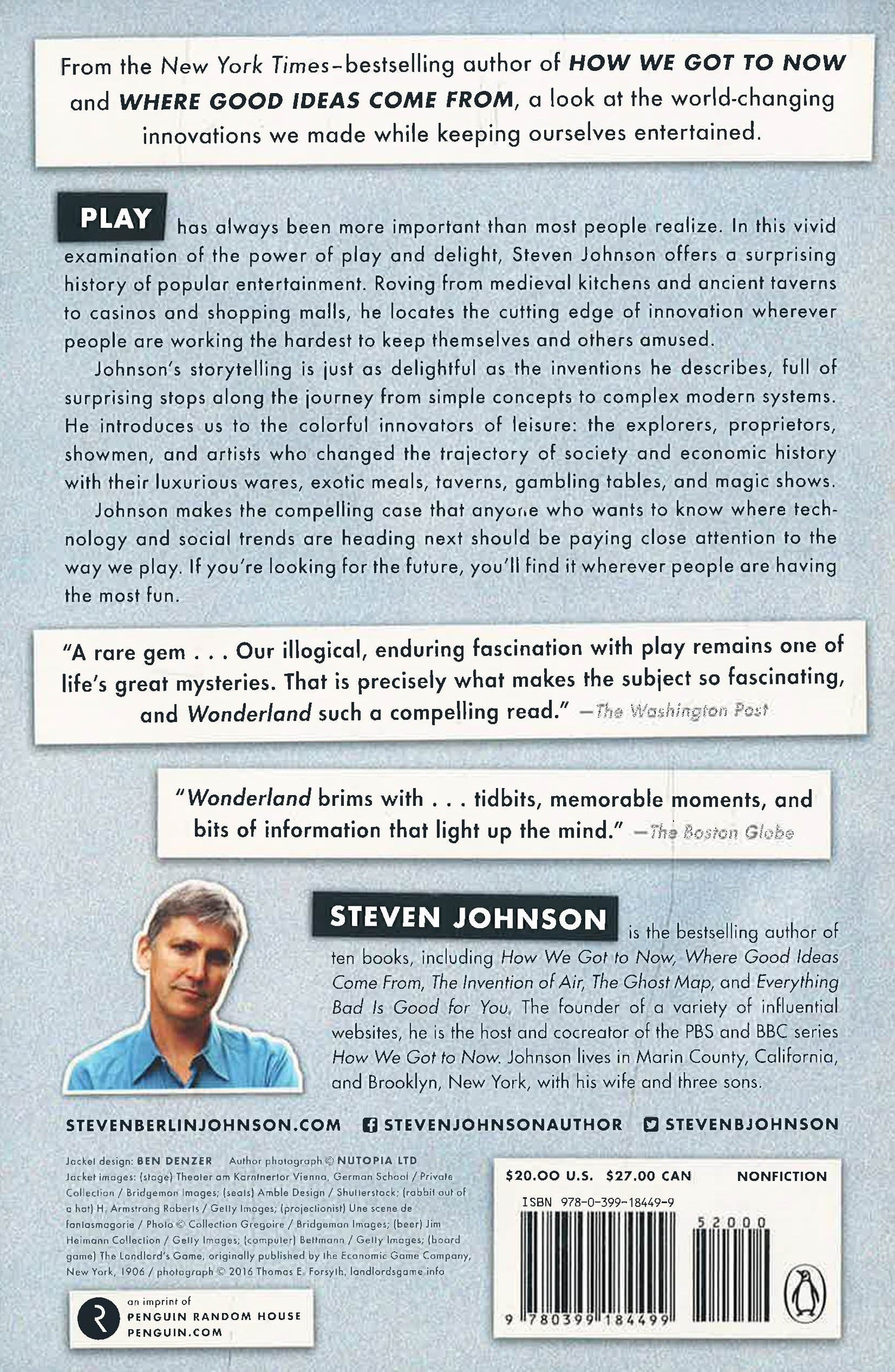 This lushly illustrated history of popular entertainment takes a long-zoom approach, contending that the pursuit of novelty and wonder is a powerful driver of world-shaping technological change. Steven Johnson argues that, throughout history, the cutting edge of innovation lies wherever people are working the hardest to keep themselves and others amused. Johnson's storytelling is just as delightful as the inventions he describes, full of surprising stops along the journey from simple concepts to complex modern systems. He introduces us to the colorful innovators of leisure: the explorers, proprietors, showmen, and artists who changed the trajectory of history with their luxurious wares, exotic meals, taverns, gambling tables, and magic shows. In Wonderland, Johnson compellingly argues that observers of technological and social trends should be looking for clues in novel amusements. You'll find the future wherever people are having the most fun.