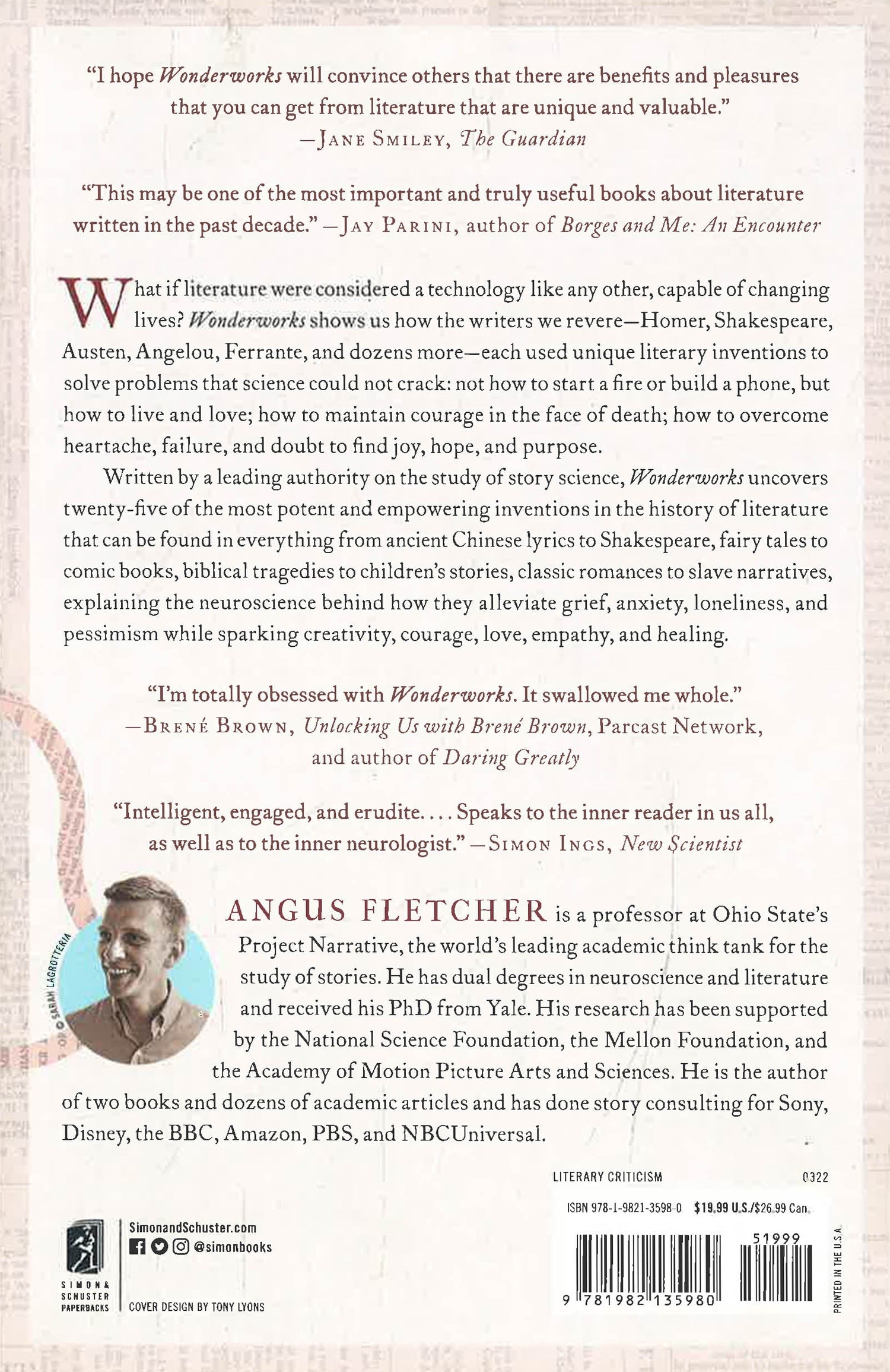 Wonderworks reviews the blueprints for twenty-five of the most significant developments in the history of literature. These inventions can be scientifically shown to alleviate grief, trauma, loneliness, anxiety, numbness, depression, pessimism, and ennui, while sparking creativity, courage, love, empathy, hope, joy, and positive change. They can be found throughout literature - from ancient Chinese lyrics to Shakespeare’s plays, poetry to nursery rhymes and fairy tales, and crime novels to slave narratives.