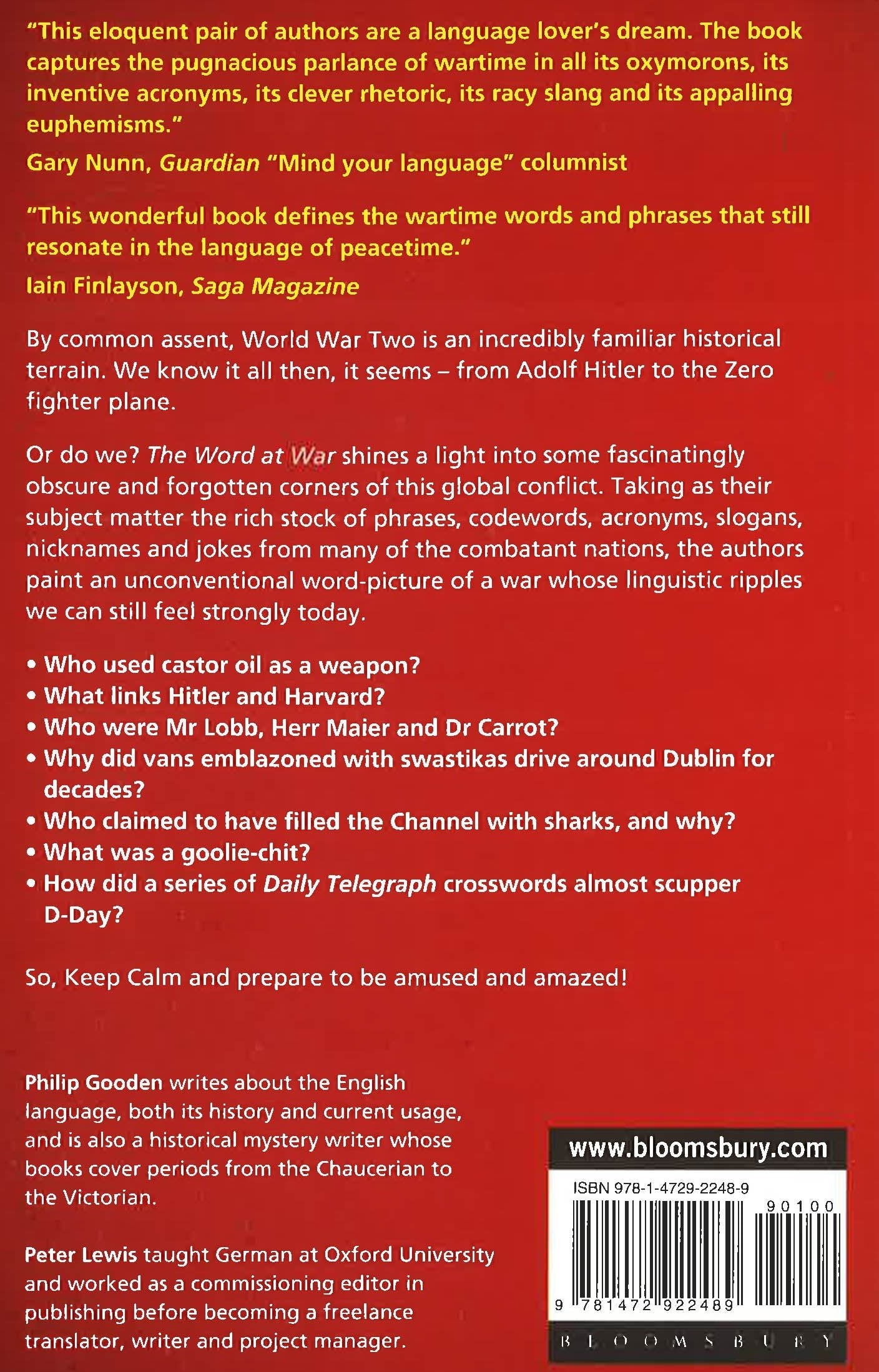 The Word at War explores 100 phrases spawned and popularized in the lead-up and during the conflict of World War Two. Substantial essays explore and explain the derivations of, and the stories behind, popular terms and phraseology of the period, including wartime speeches (and the words of Churchill, Hitler and FDR); service slang; national stereotypes; food and drink; and codewords.