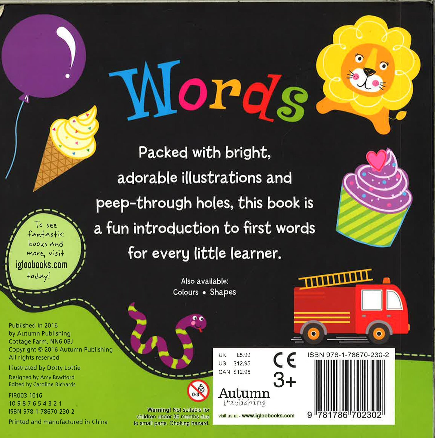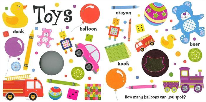 This book is presented in hard pages, and each page is based on the theme of the child's most interesting vocabulary, and then with the theme or the word to the size of the hole shape to attract small readers! Content plus the characteristics of looking for books, Let the child find a specific object and practice the number! Is a very interesting enlightenment learning book! Packed with bright, adorable illustrations and peep-through holes, this book is a fun introduction to first words for every little learner. Also avalible: Colour, Shapes
