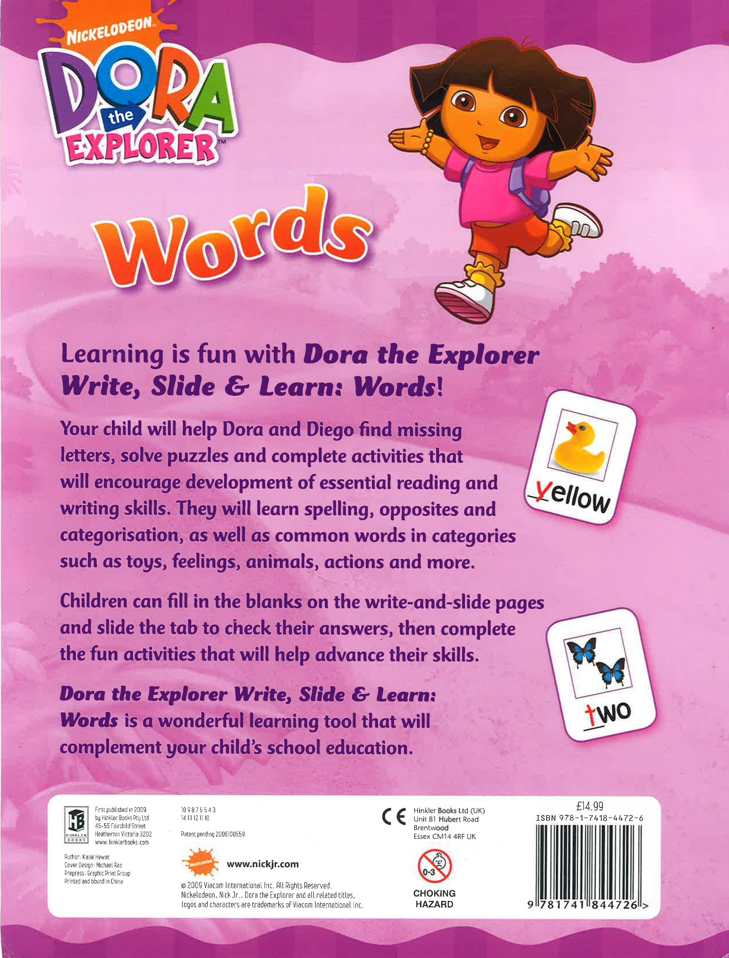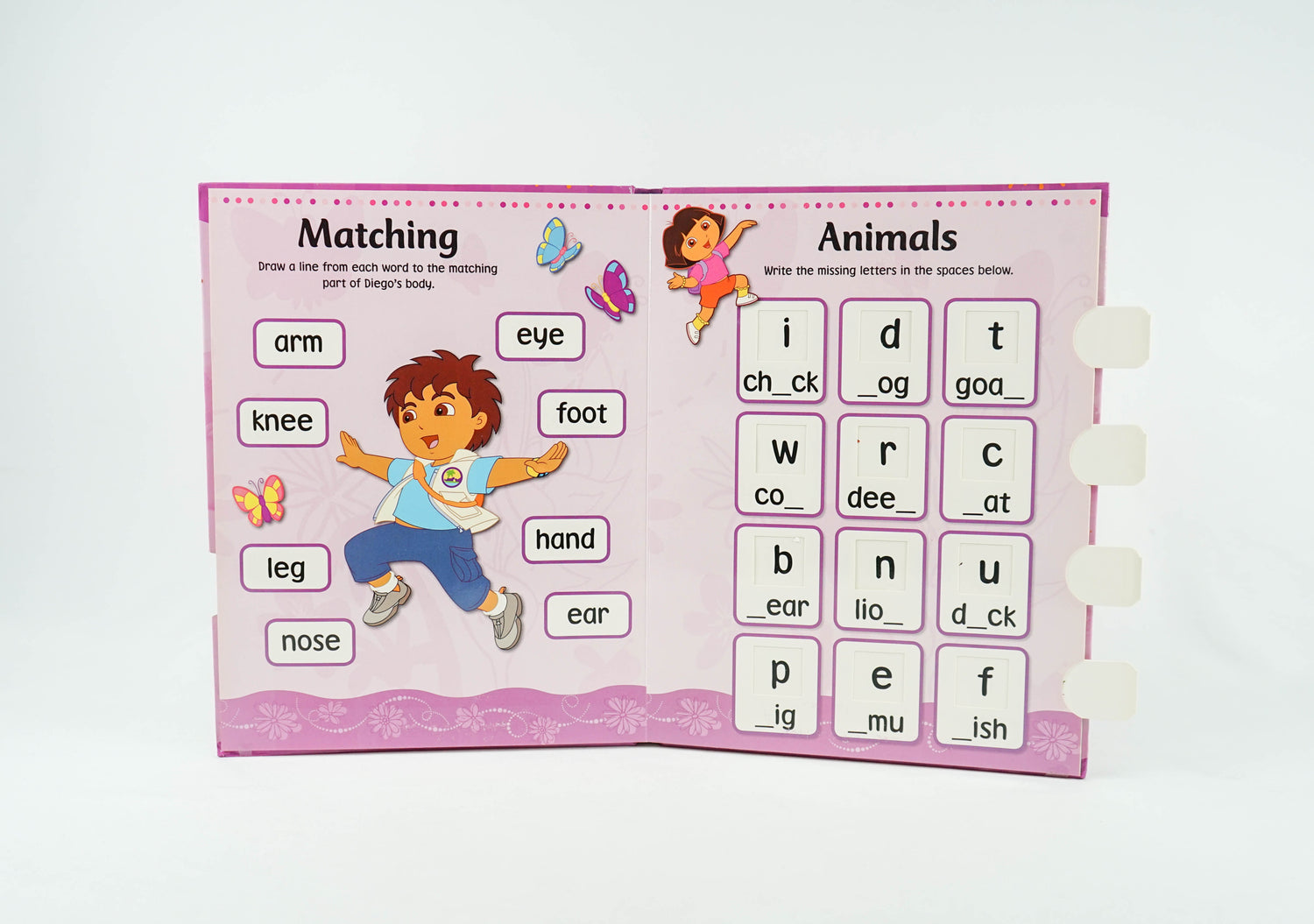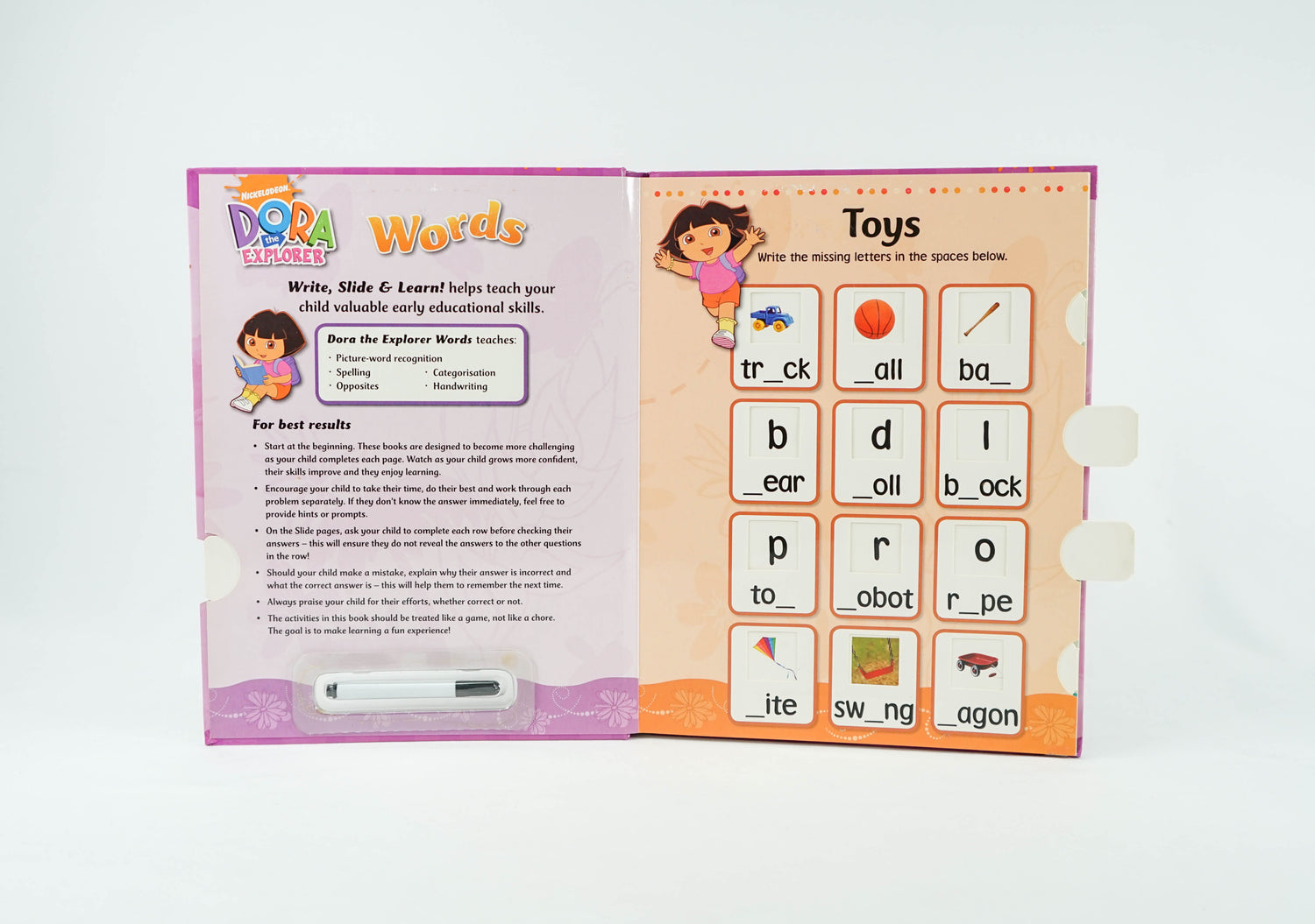 Early learning fun with Dora, Diego and SpongeBob Squarepants! Children will love to help Dora, Diego and SpongeBob find missing letters and numbers, solve puzzles, and complete activities that will encourage the development of essential reading, writing and numerical skills. Children can fill in the blanks of the write-and-slide pages and slide the tab to check the answers, then complete the fun activities that will help advance their skills.